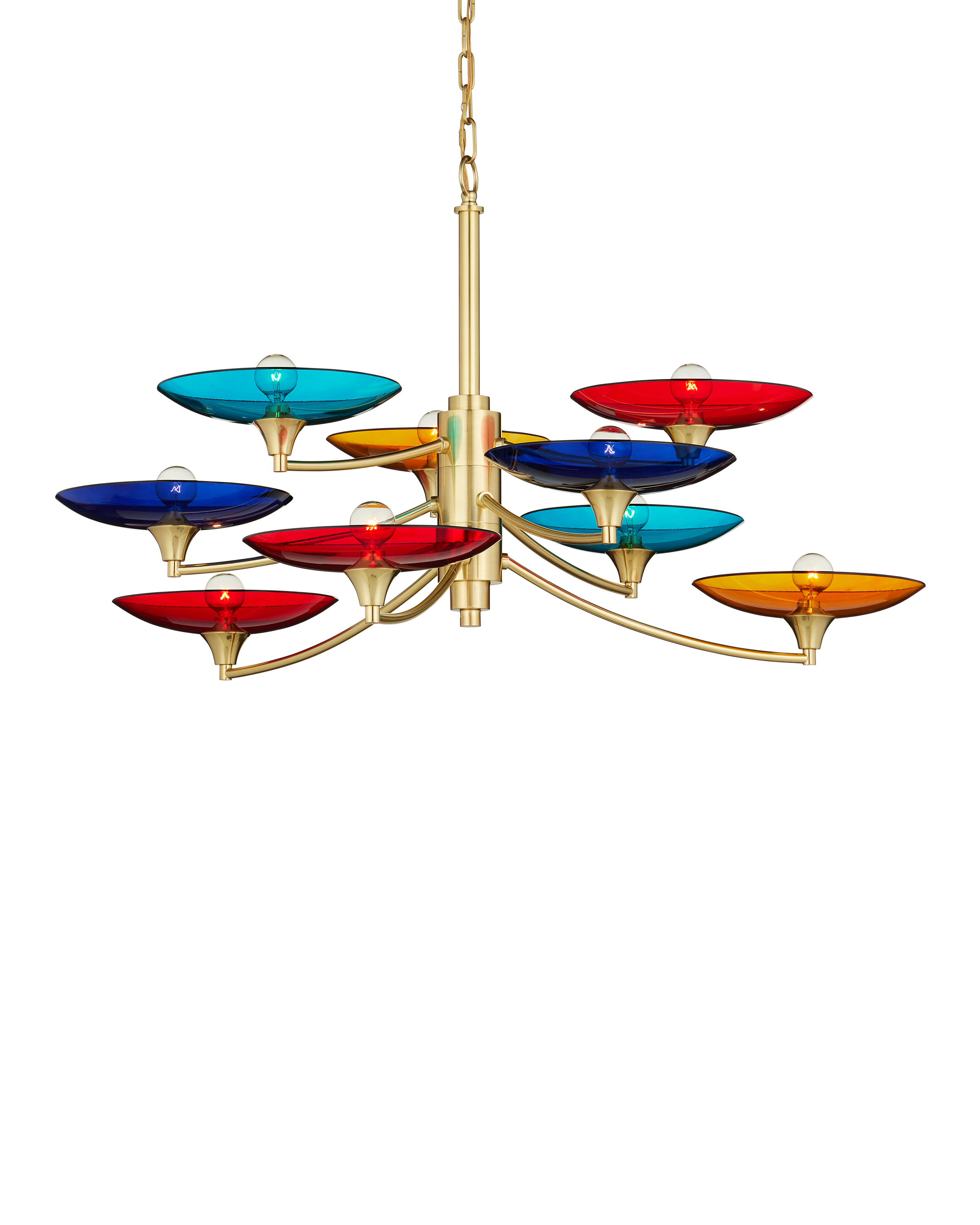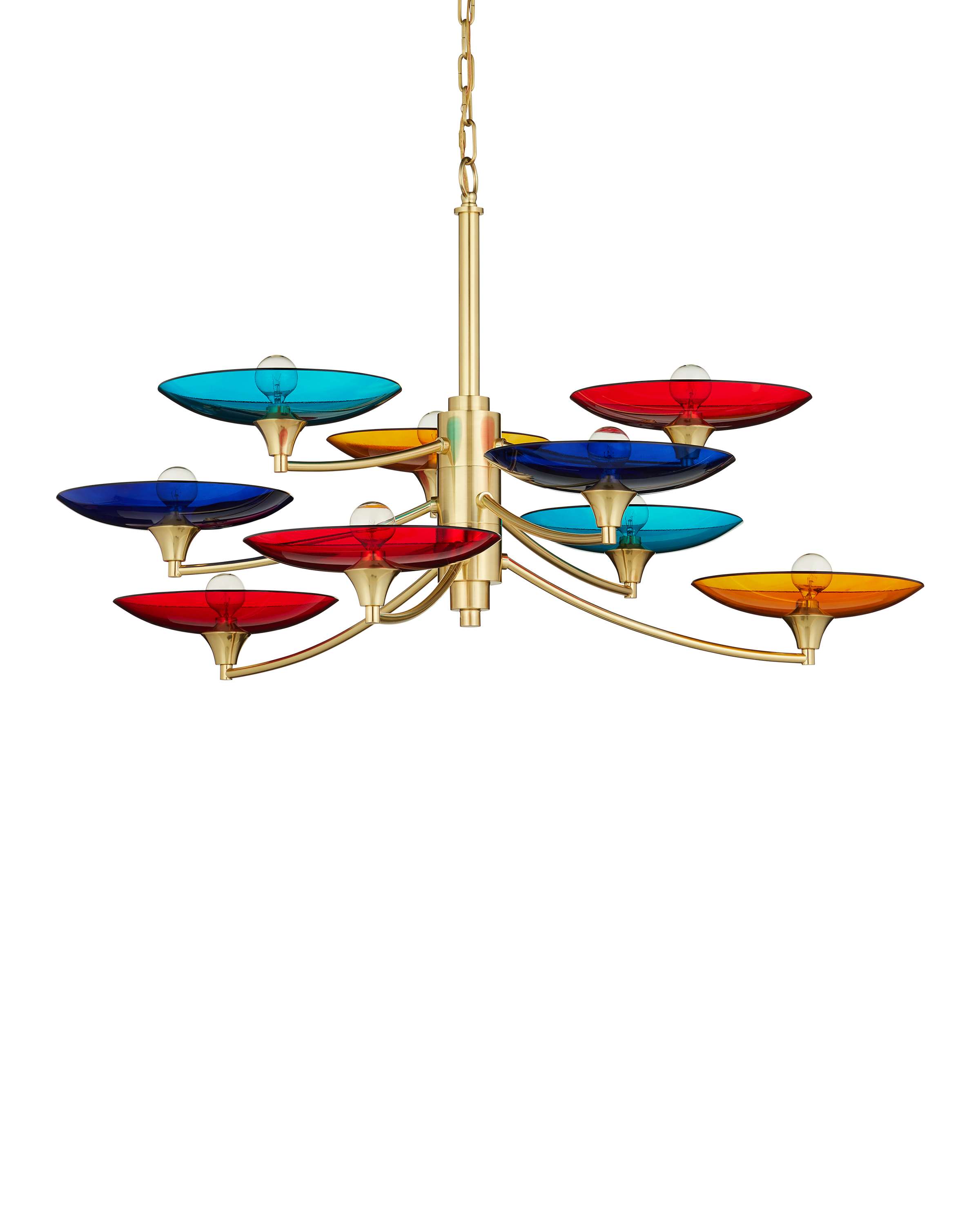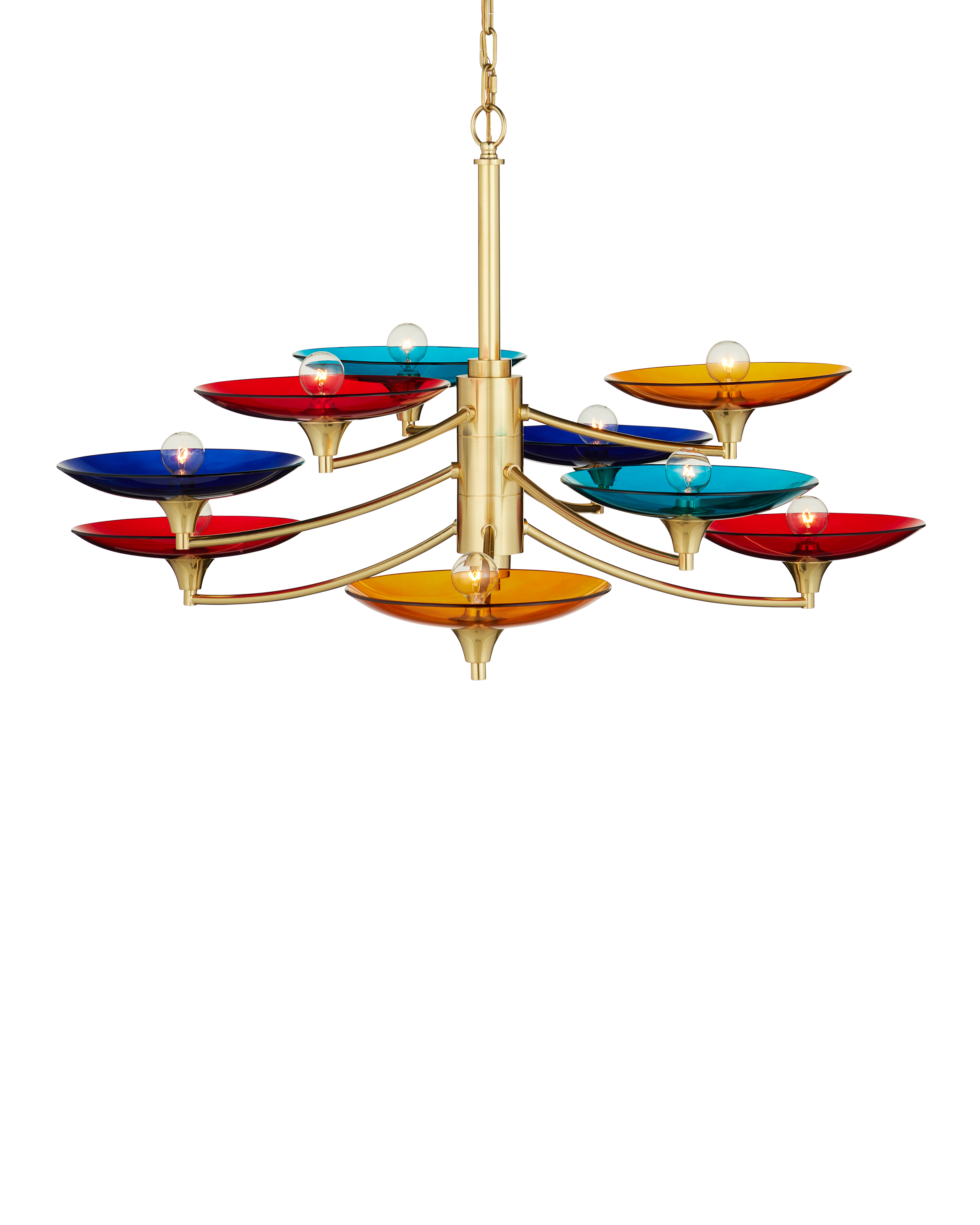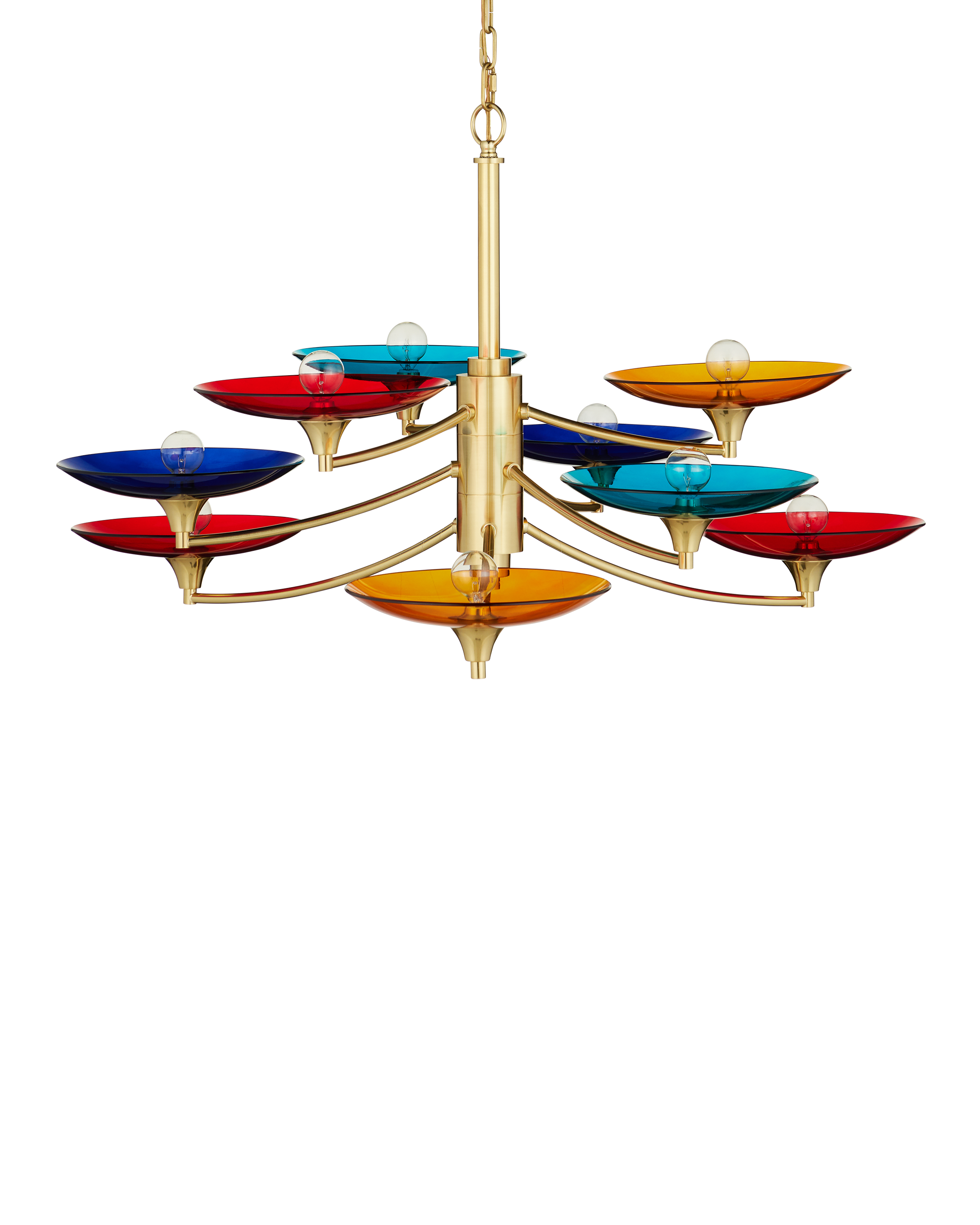 The Currey & Company Veneto Medium Chandelier has mid-century Italian lines with colorful glass discs in blue, yellow, and red. Adjustable from 31" to 98" with use of included chain/rod kit/cable. If your space calls for a longer drop, additional chain/rods/cable is available for purchase.