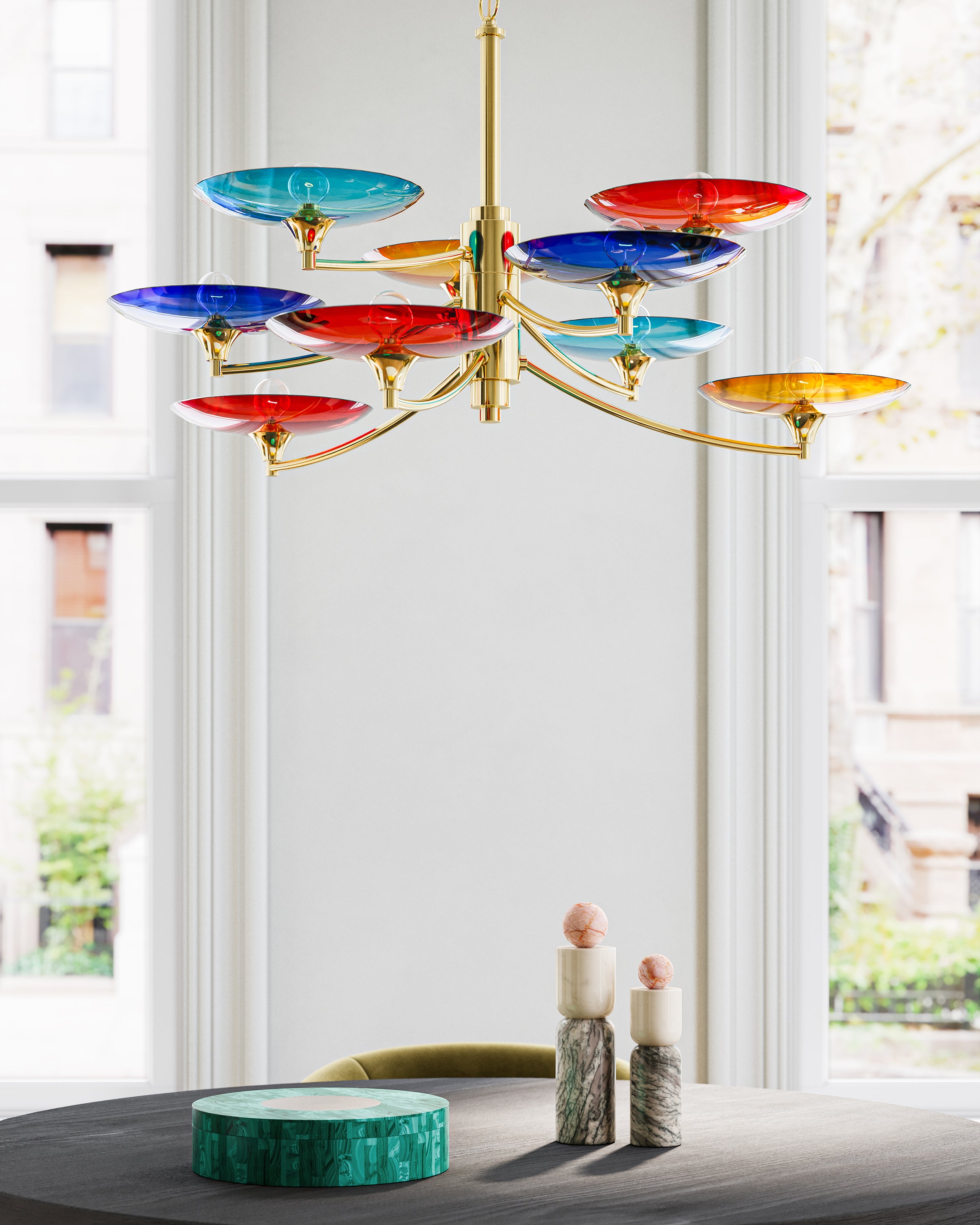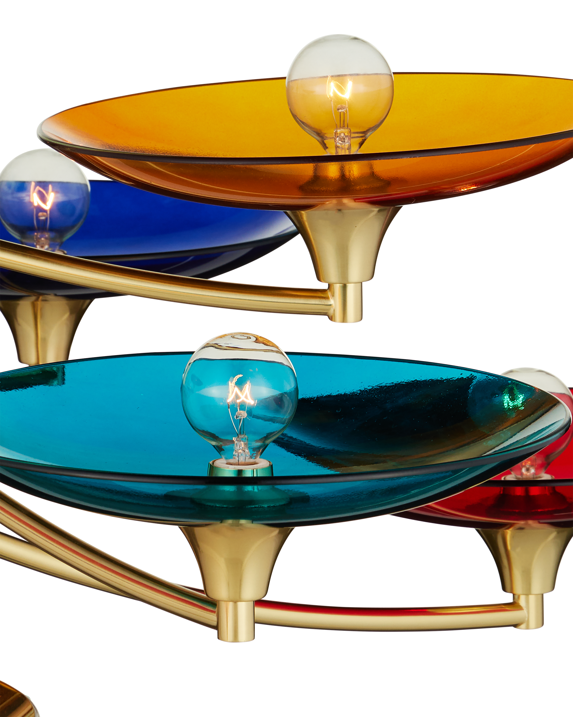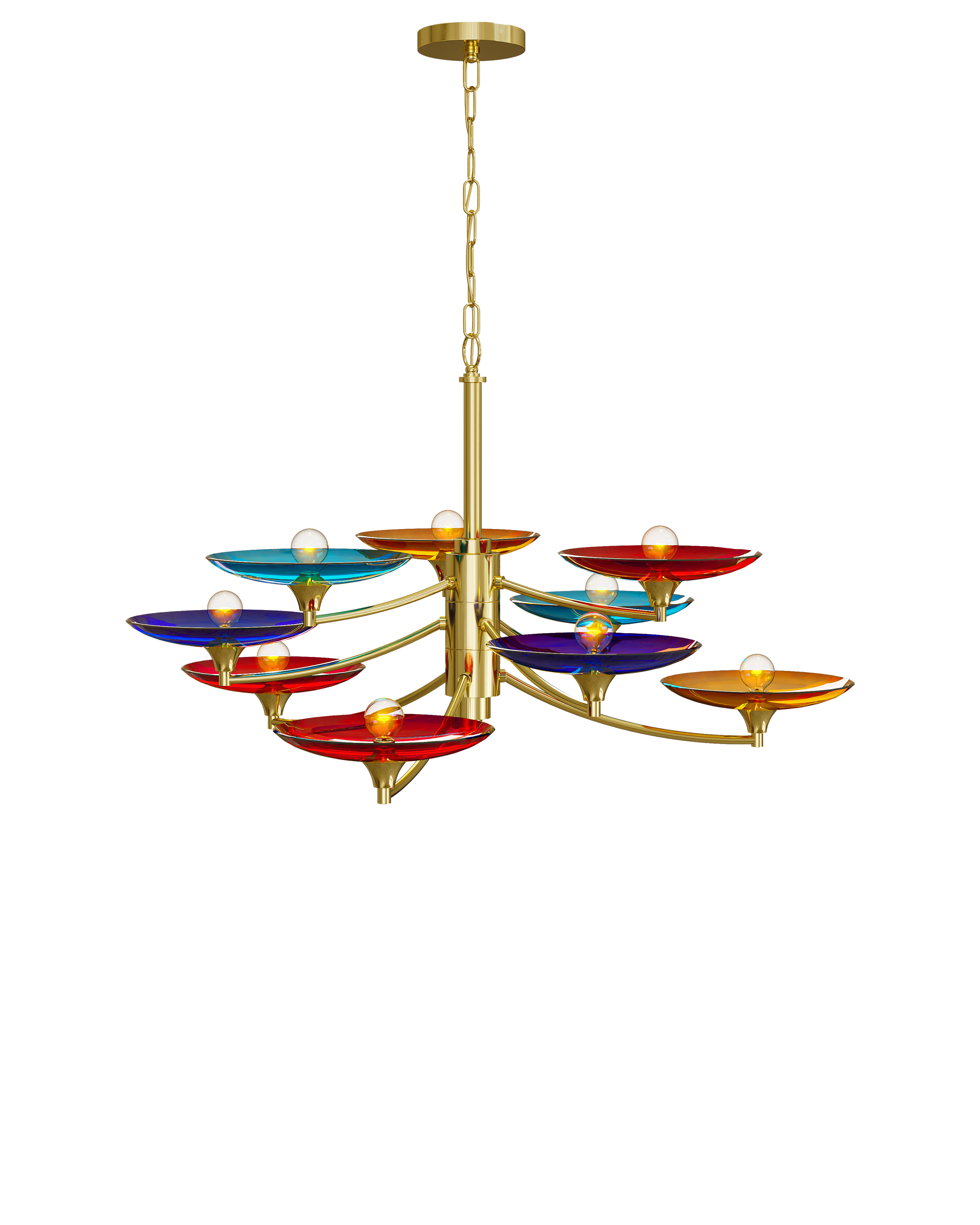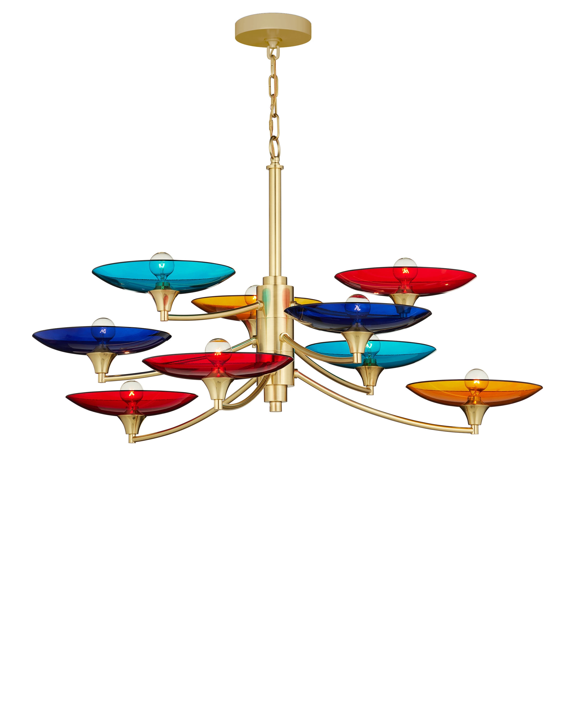 The Currey & Company Veneto Medium Chandelier has mid-century Italian lines with colorful glass discs in blue, yellow, and red. Adjustable from 31" to 98" with use of included chain/rod kit/cable. If your space calls for a longer drop, additional chain/rods/cable is available for purchase.