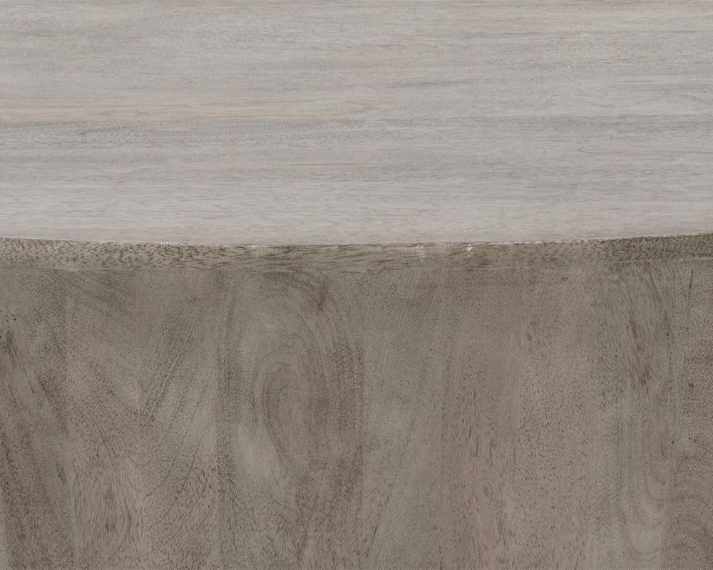 Inspired by global travels, this round, handcrafted drum-style coffee table will certainly add wonder to any space. Made from grey solid mango wood. Also available in dark brown and natural finishes. Made in India. With refined craftsmanship, this design was brought to life by skilled local artisans. By nature, these materials develop unique imperfections such as fissures, markings and colour variations for a truly one-of-a-kind piece. As wood is an organic, porous material, these pieces will contain natural variation of texture and may also exhibit fine indentations and cracks. Wood pieces will also display a disparity of colour and grain, and visible knots and burls that add to the character of each piece.
