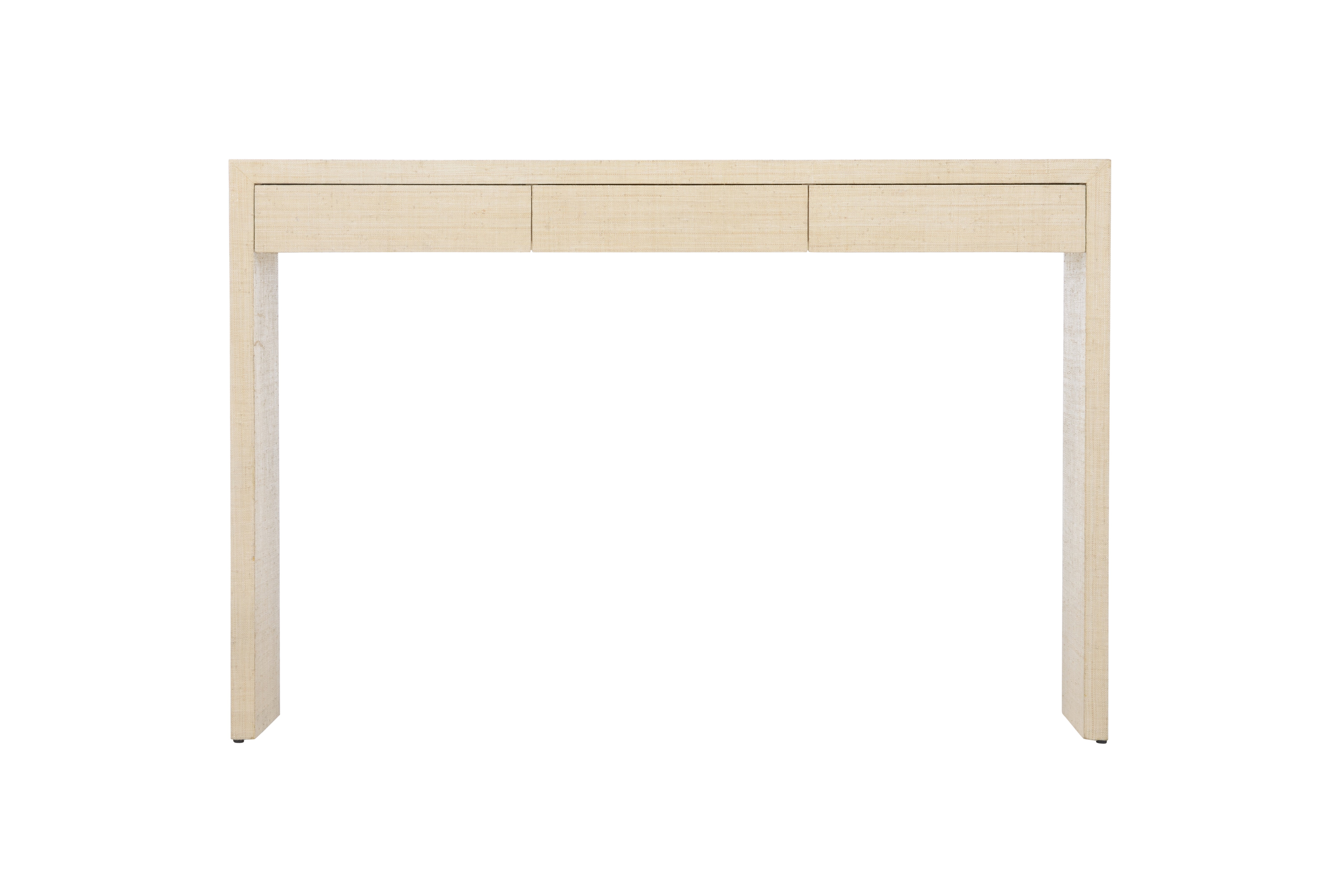 The stunning simplicity of this piece belies it's beauty and utility. The versatile console has the perfect depth for most any space. It features three subtle drawers for needed storage and is covered in cream-colored raffia. Designed by Elizabeth Wicker.