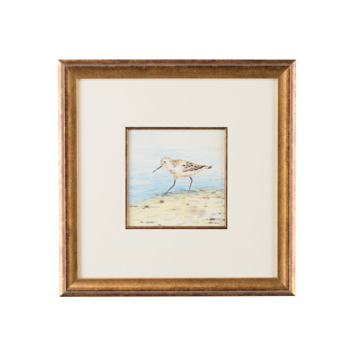 Sand Piper V - Watercolor, antique gold frame with glass, white mat, antique gold fillet. Hand painted. Lisa Kahn collection