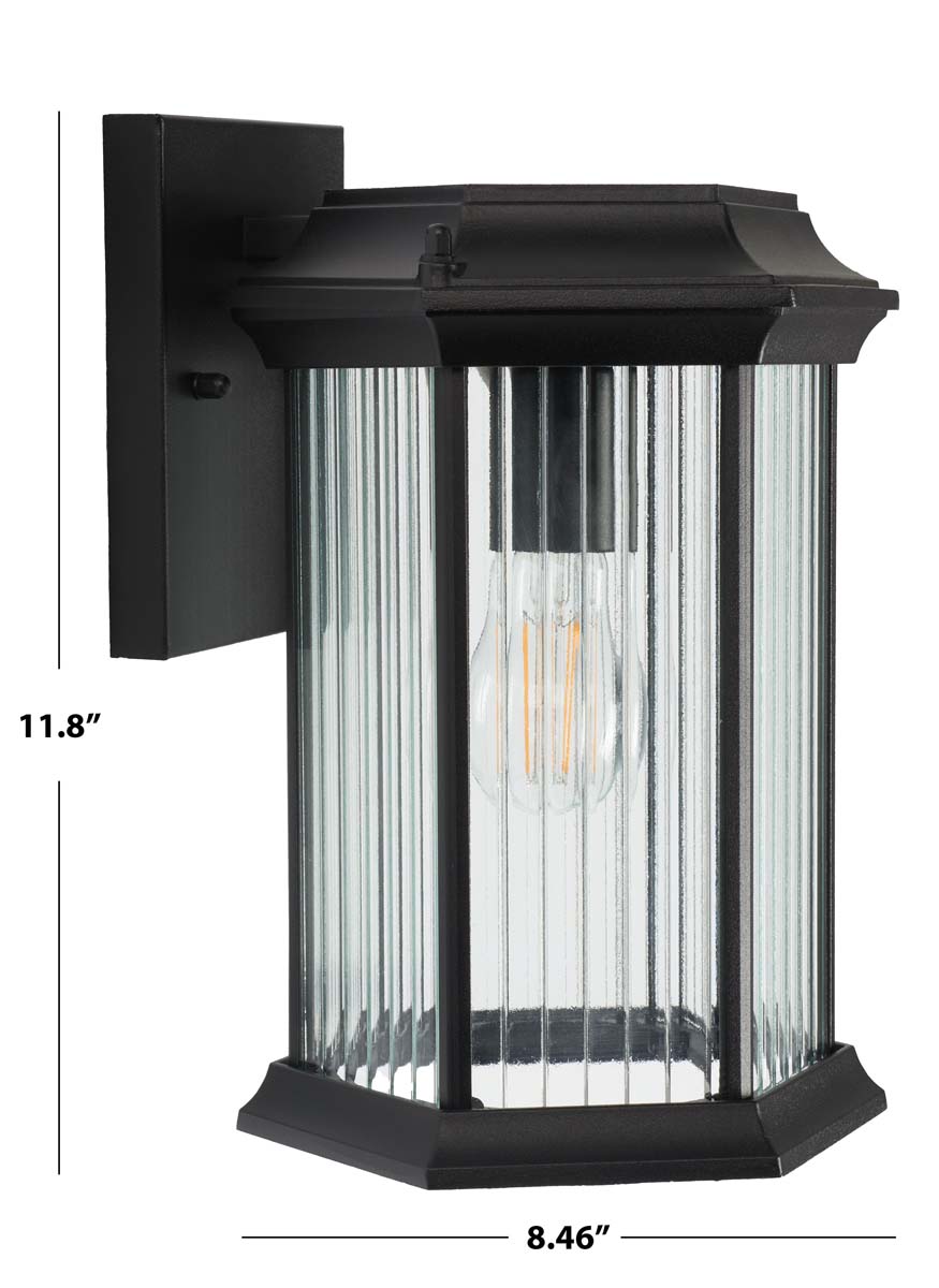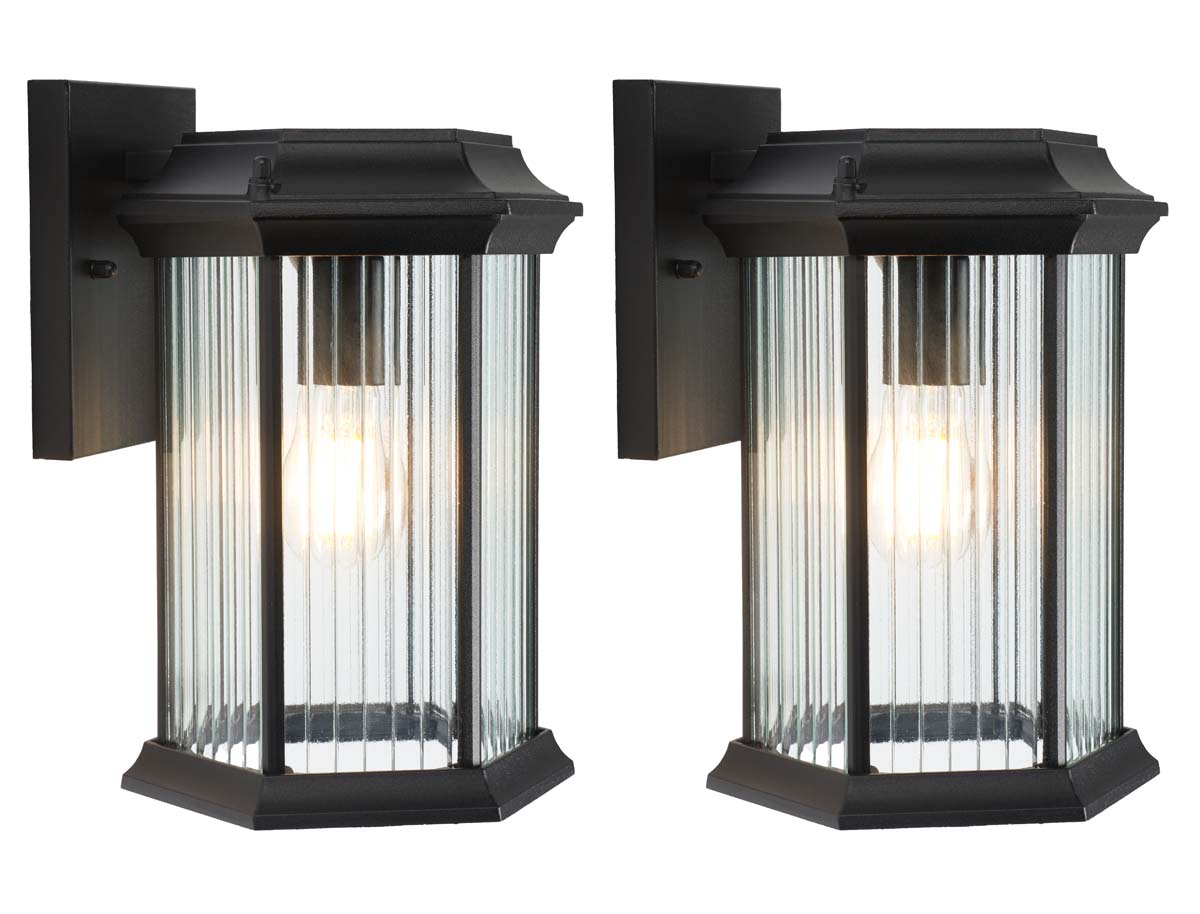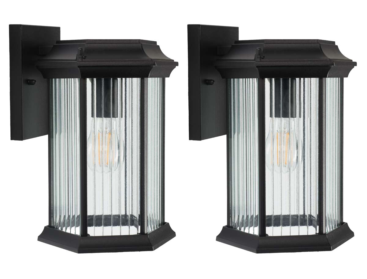 Beautifully displaying classic taste with a contemporary edge, this Hylan Outdoor Wall Sconce revitalizes any outdoor living space. Hylan?? fluted glass panes are artfully offset by its lantern-inspired silhouette, while a jet black finish completes the look. Sold in sets of two.