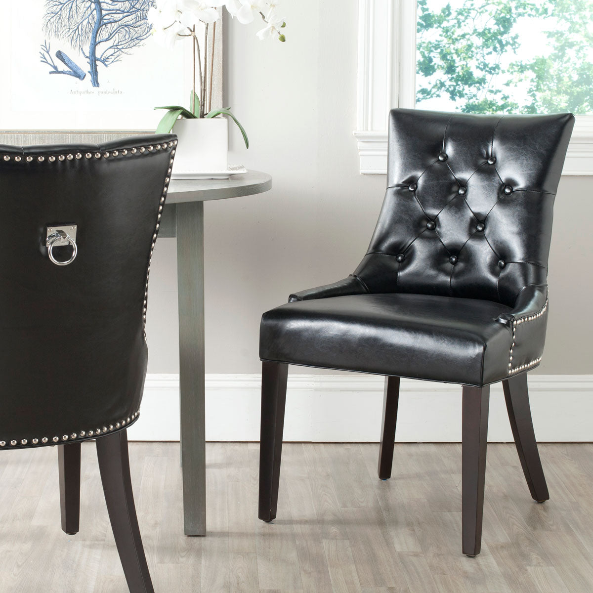 The stylish Harlow ring chair by Safavieh transforms any dining room with instant glamour. Dressed up with silver nail heads and a clever metal ring on its back, Harlow is shown in black bicast leather with birch legs in espresso. Button tufts on the front of the tapered backrest add to the allure of this set of two chairs.