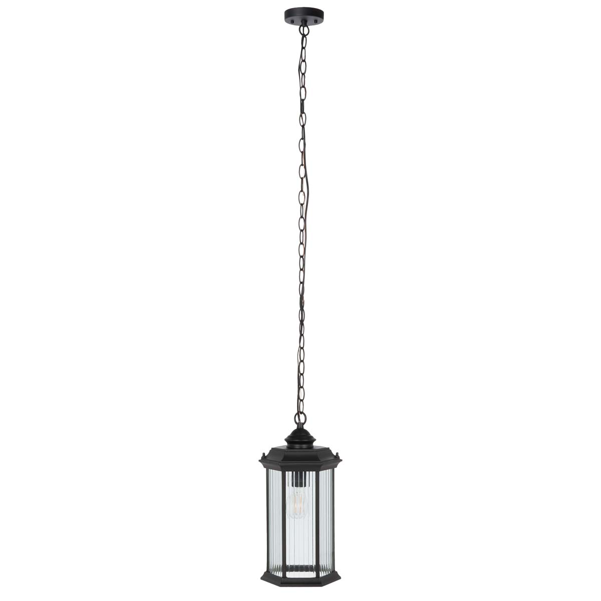 This Hylan Outdoor Pendant instantly revitalizes any outdoor living space, beautifully displaying classic taste with a contemporary edge. Hylan?? fluted glass panes are artfully offset by its lantern-inspired silhouette, while a jet black finish completes the look.