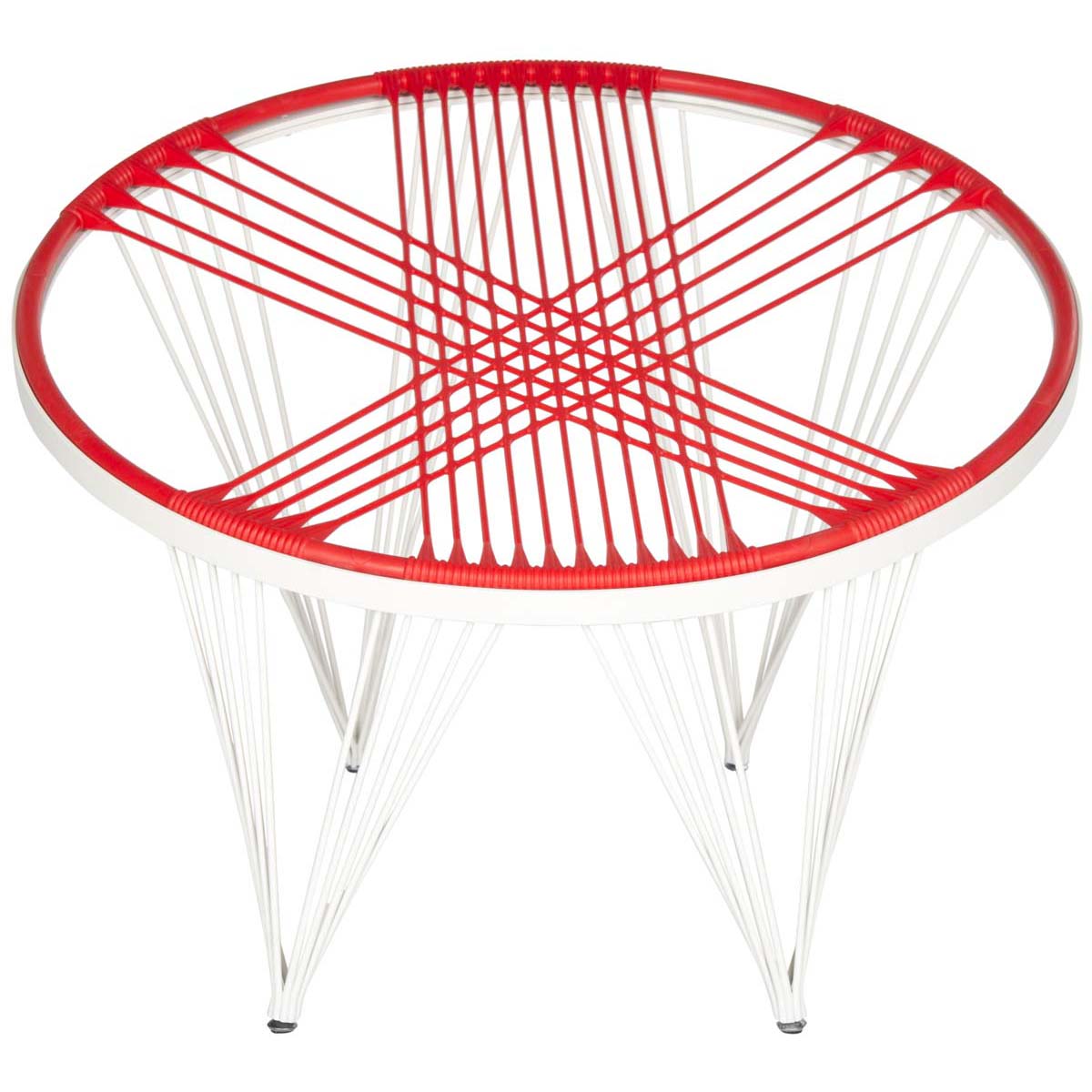 A web of intrigue for your home, the Launchpad chair is a space age iteration of the 1950s era Papasan chair, only more contemporary in design. Red woven silicone cords attach to a white iron base for a feeling of free floating comfort.