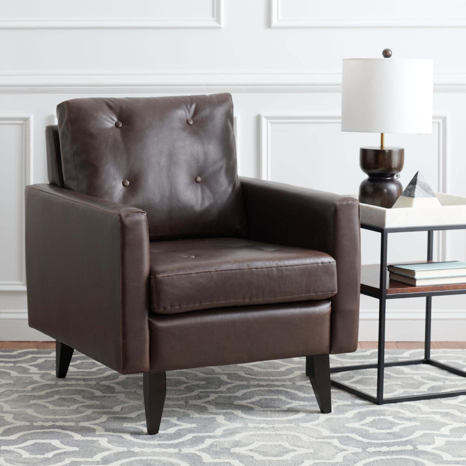 Mid Century style meets contemporary comforts in the sophisticated Caleb Club Chair. Its plush button tufted cushions are paired with natural antique brown PU leather and espresso finished birch wood legs to enhance its welcoming appeal. Caleb perfectly complements both modern and classically styled rooms.