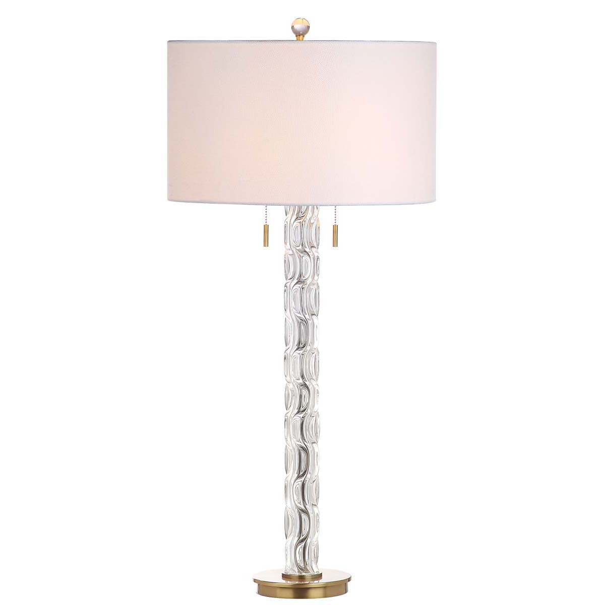 Inspired by the chic chandeliers that make NYC?? newly renovated five star hotel a national treasure, this contemporary table lamp boasts timeless style. Its glass figure is paired with a luxurious metallic gold finish and classic, crisp white shade.