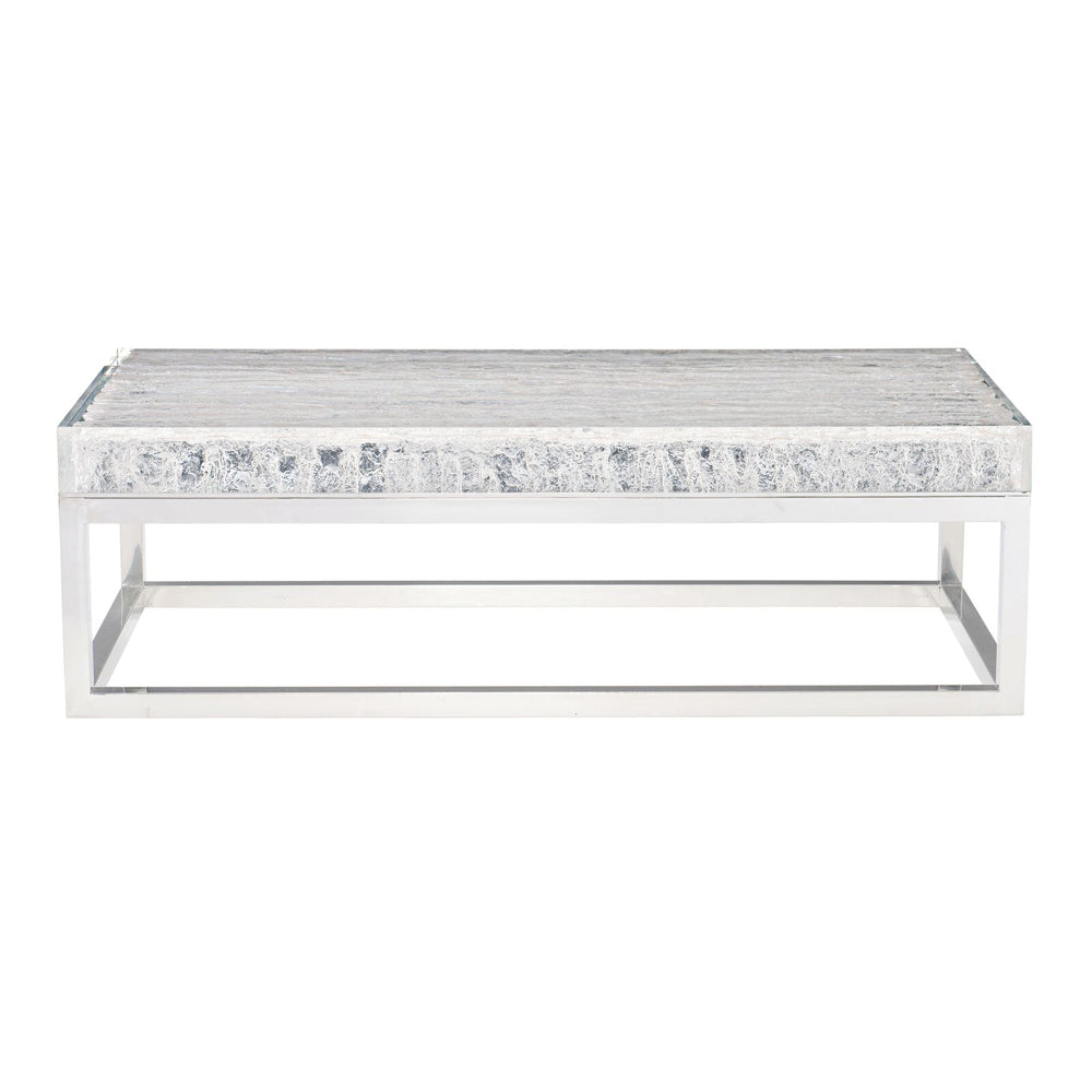 Inspired by Arctic ice, this chic cocktail table pairs solid acrylic with polished stainless steel for an unforgettable look. Bernhardt Interiors offers high-design furniture with an eclectic edge. The chic and modern Arctic cocktail table features a unique pairing of materials with an irresistible allure. Crafted from solid acrylic with a cast wood grain pattern, the rectangular top resembles a glistening block of ice. A polished stainless steel base contributes to the sleek, simple geometry of the design.
