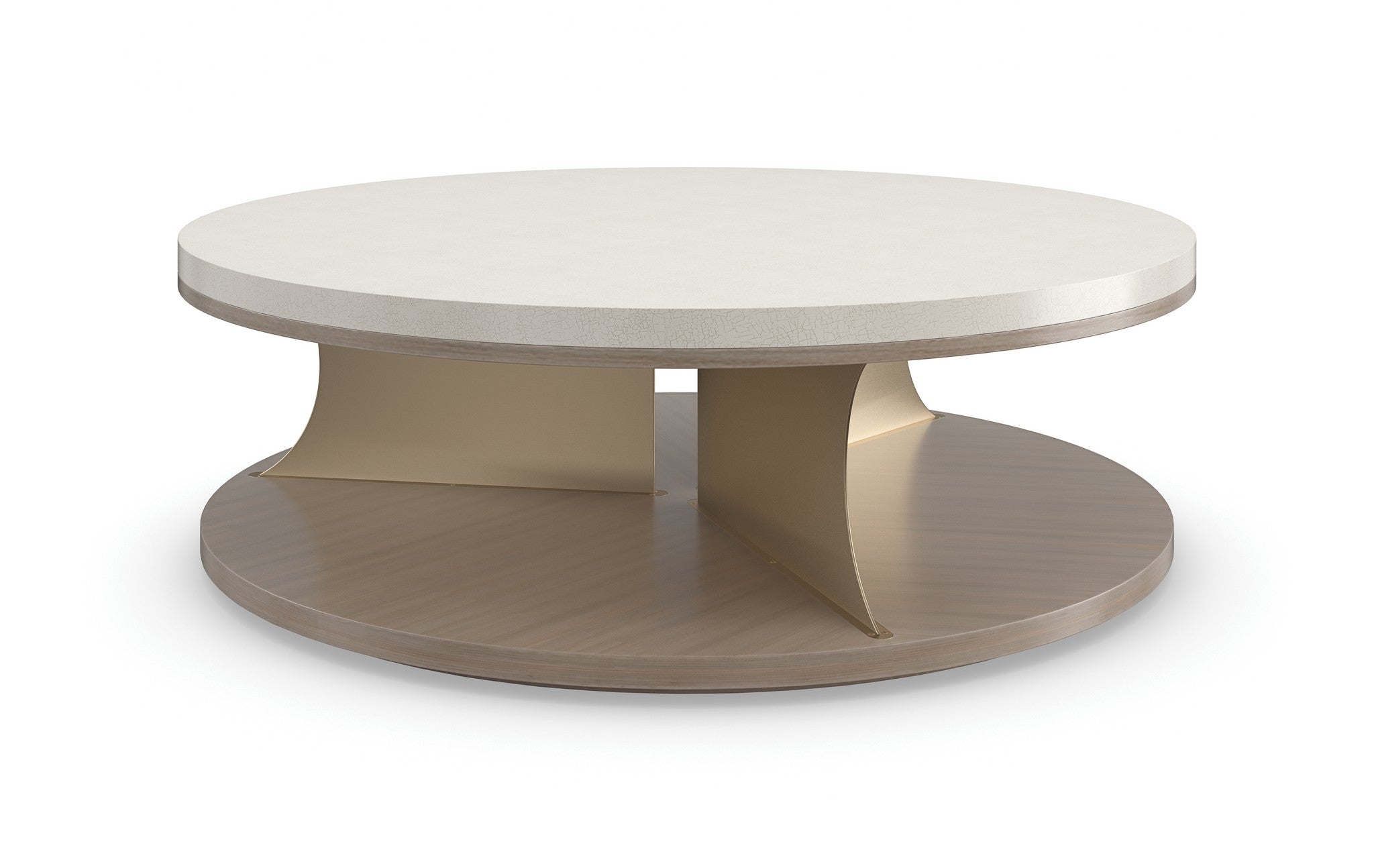 Understated yet elegant, this artful cocktail table is a celebration of materiality and simple form. Features an ample top in an Ivory Craze crackle finish, supported by a trio of Brushed Gold metal blades, perfectly distributed to create open space for storage and display. A swiveling plinth base adds intrigue and function.
