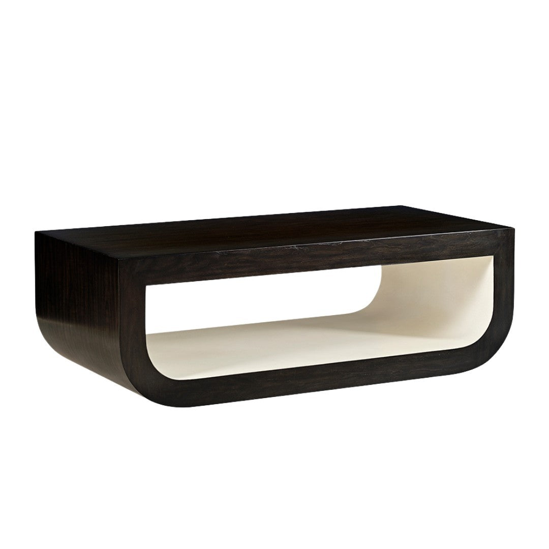 Our Carter Coffee Table features a smooth top, curved sides, a thick frame, and a lower shelf