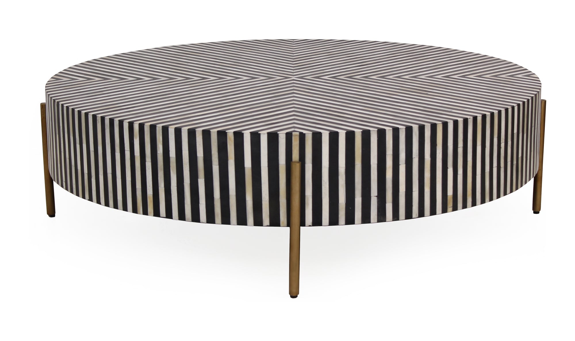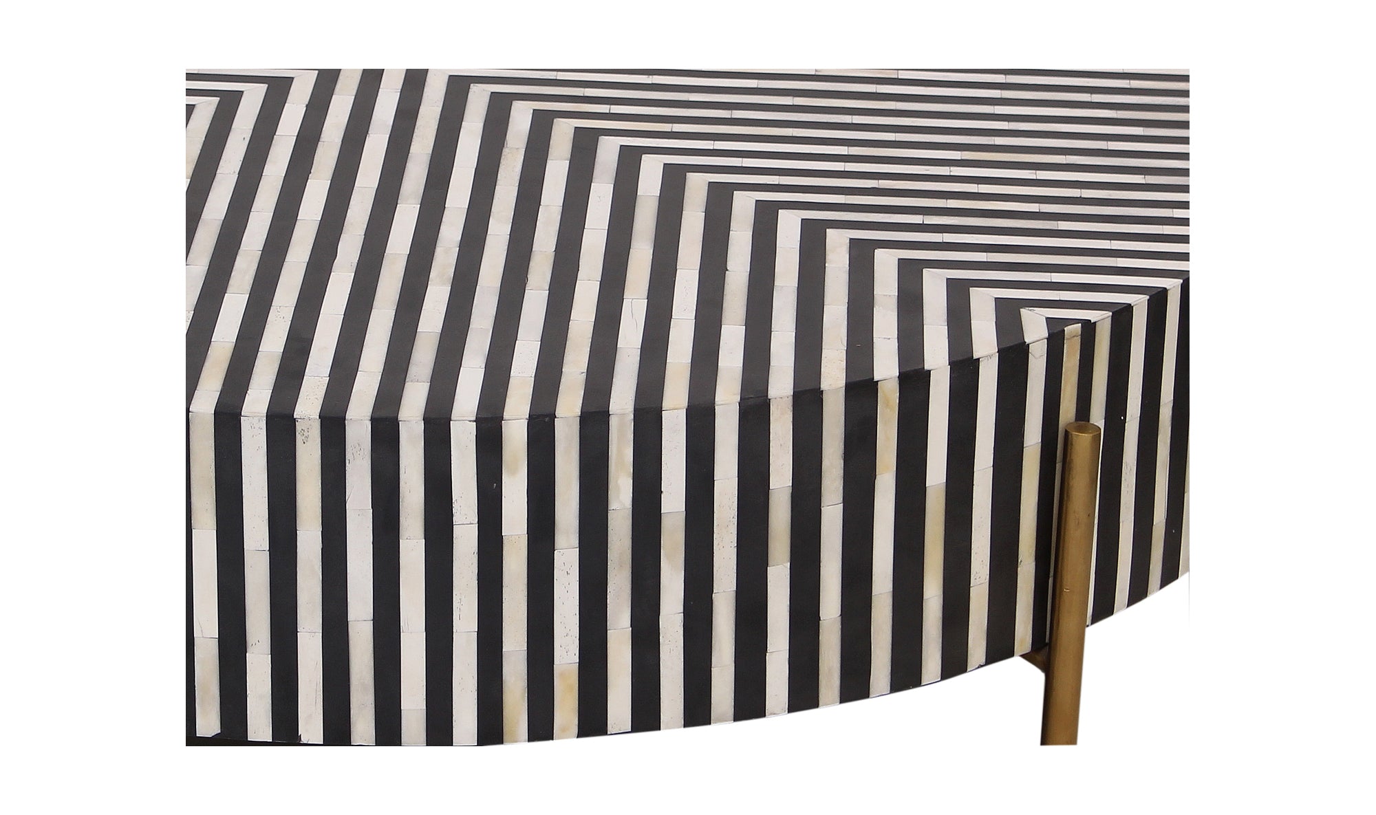 Simplistic and bold, the Chameau coffee table is an exercise in contrast, featuring a hypnotic art deco design. Simple construction and a delicate brass-finished base set off a veneer of white and black camel bone and resin, making a spellbinding visual statement. The Chameau series features a coffee table in three sizes and a side table perfect for any living space.