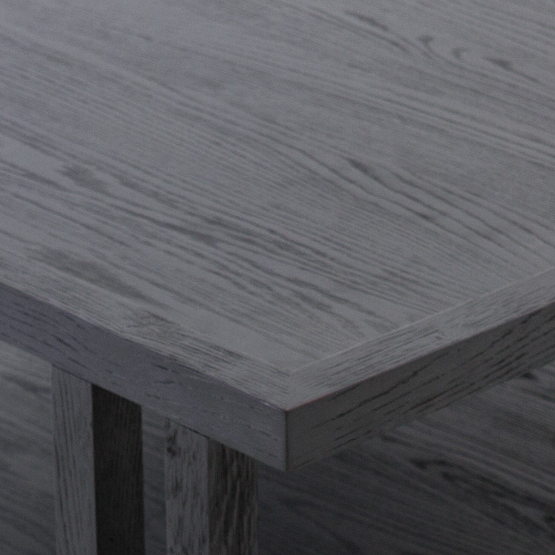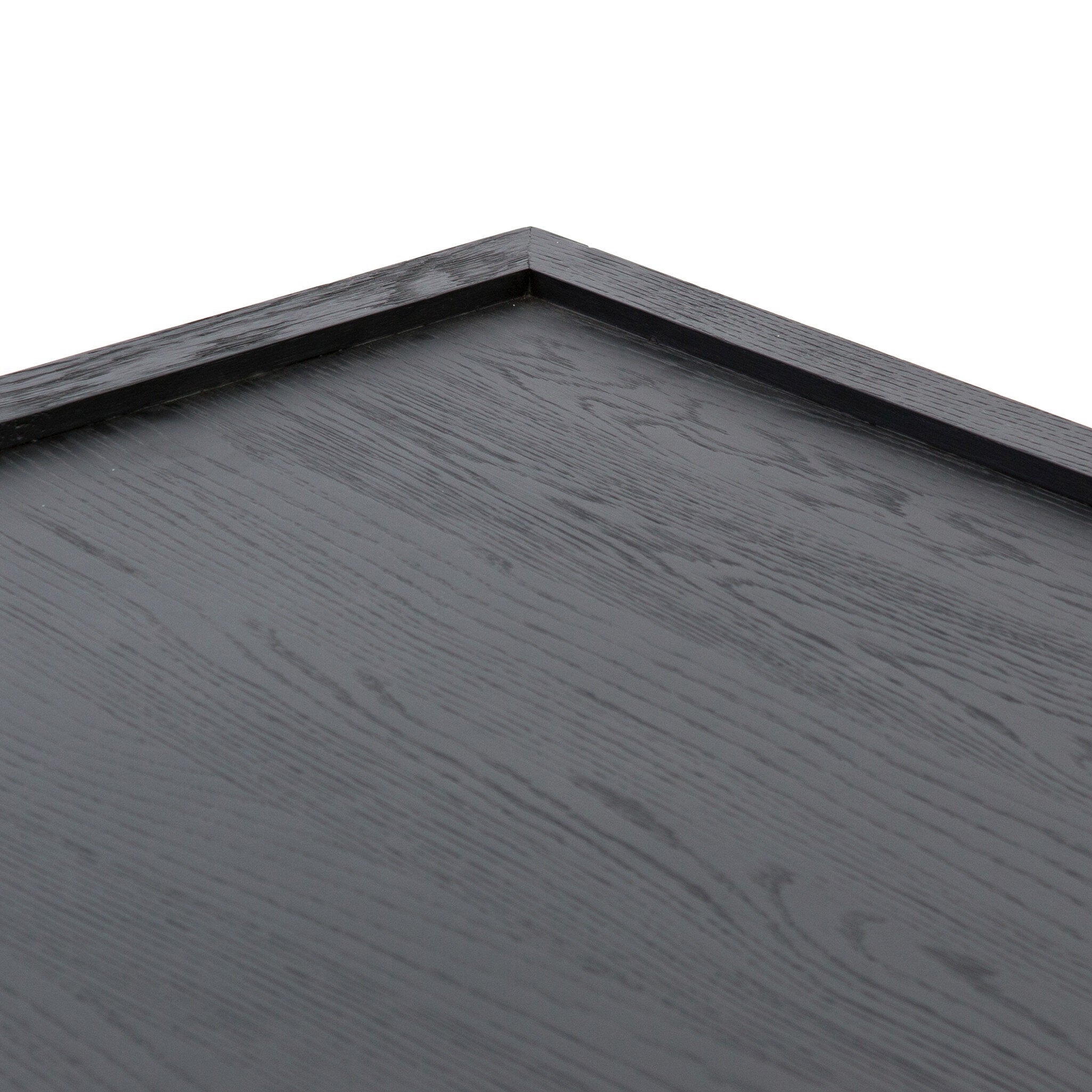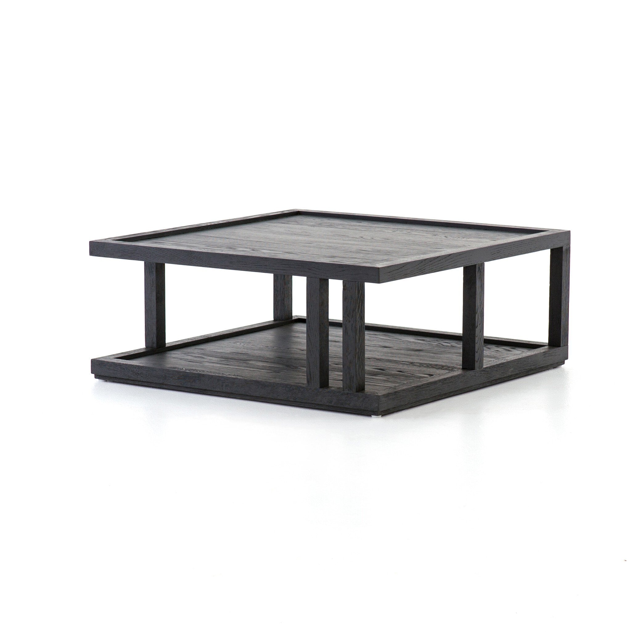 The living room centerpiece gets a geometric touch. Black-finished oak forms clean, mitered corners, offering two tiers of tabletop for plenty of space. Open-air styling lends a look of lightness to rustic materials.