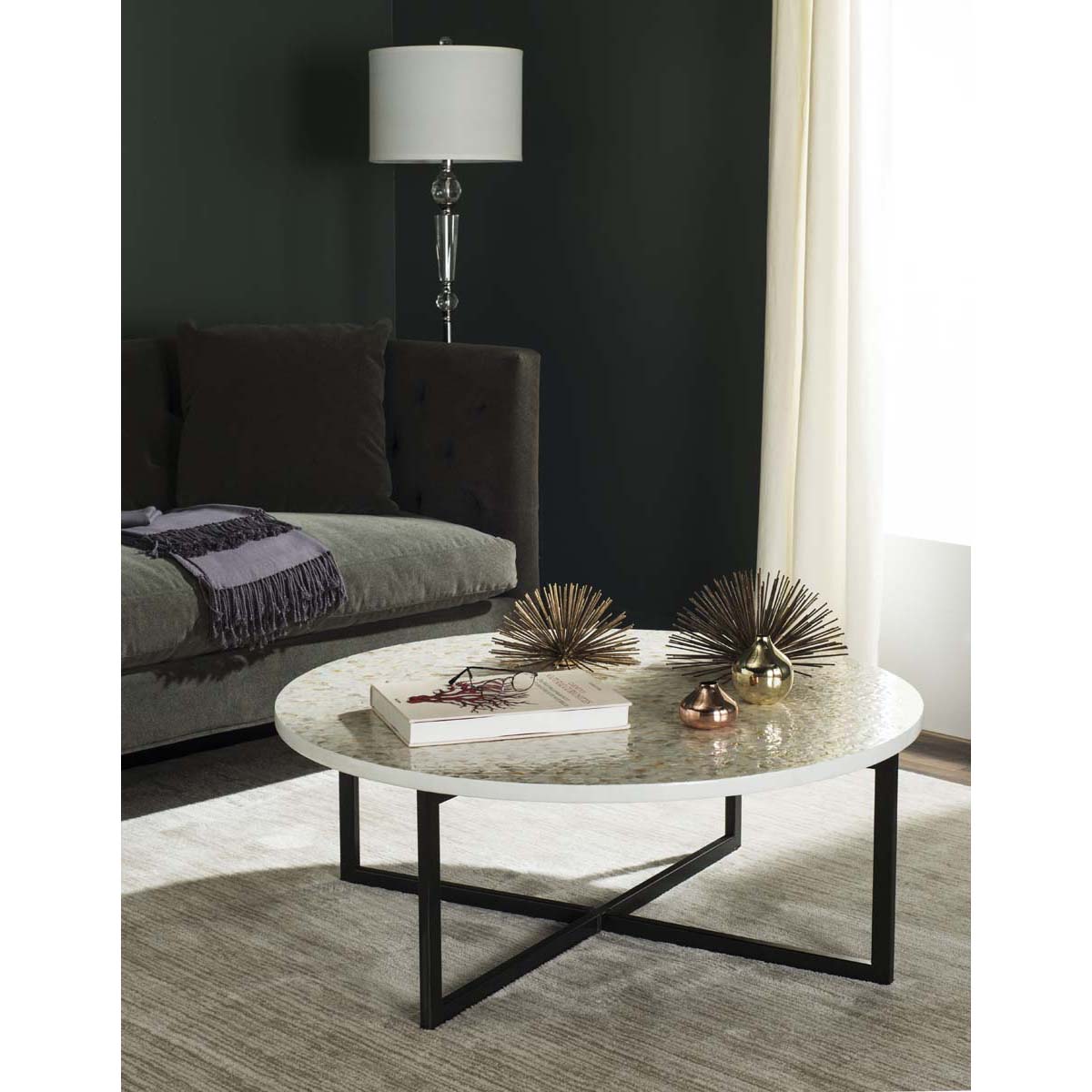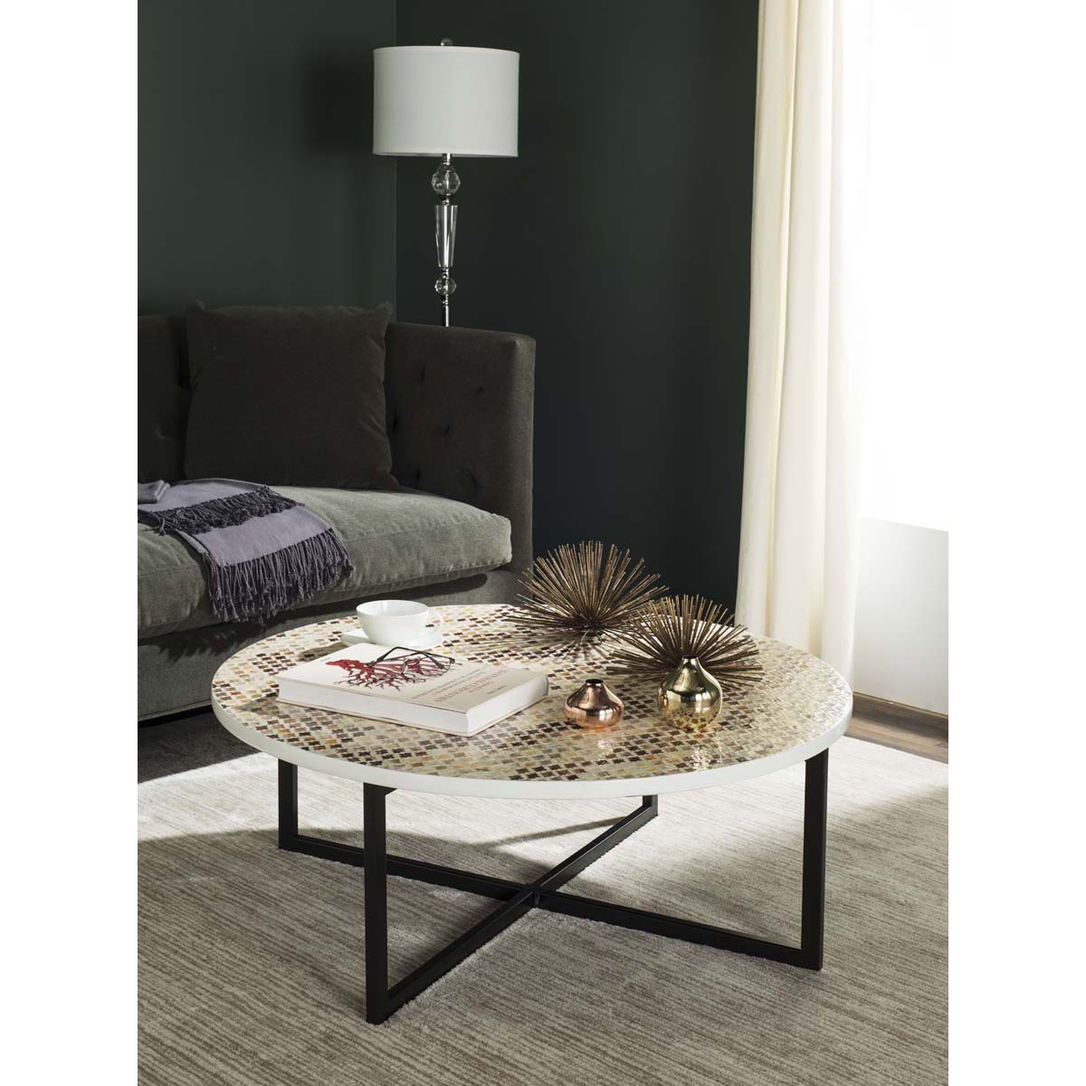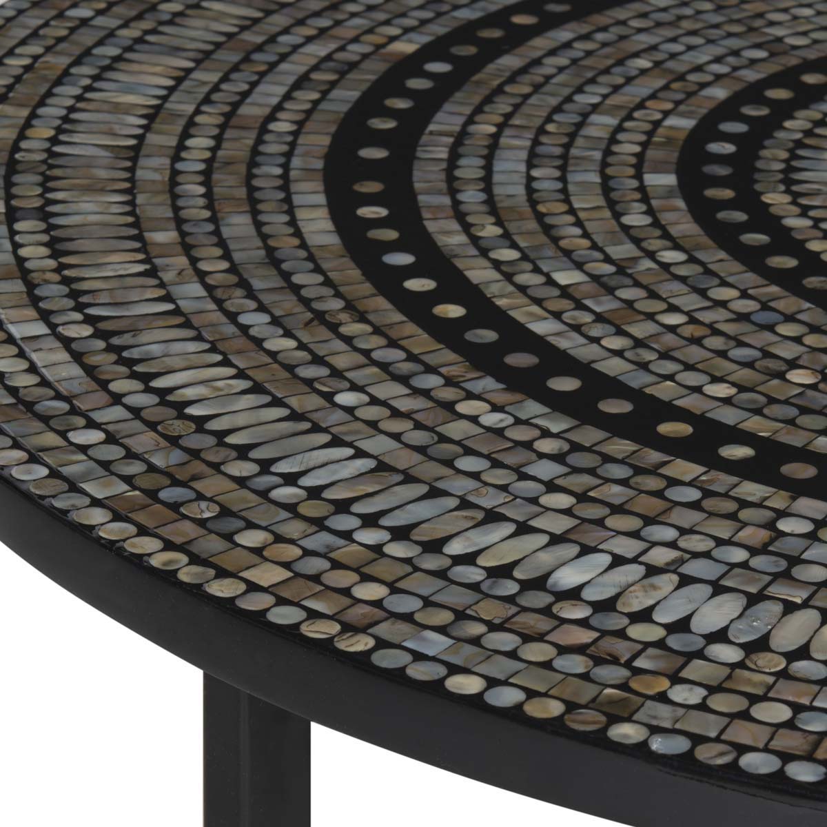 Elegant and contemporary, the Cheyenne coffee table brings new meaning to modern art for the home. The ancient craft of mosaic tile work inspired this pretty piece, which contrasts a top of hexagonal shell tiles with black powder coated legs.