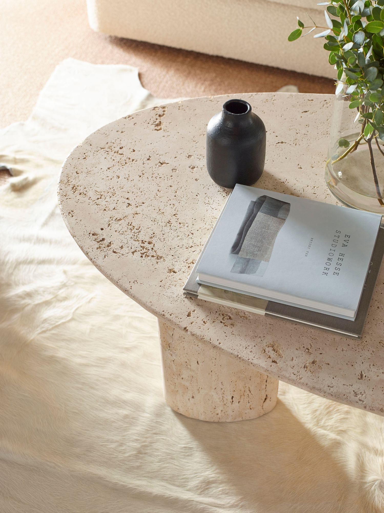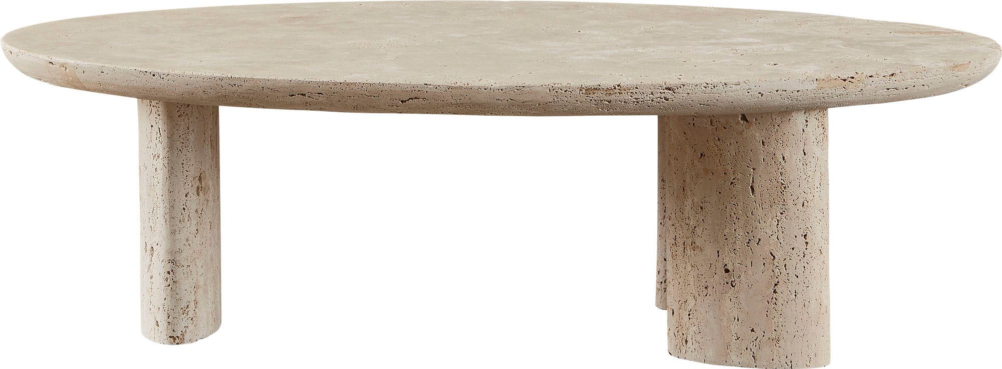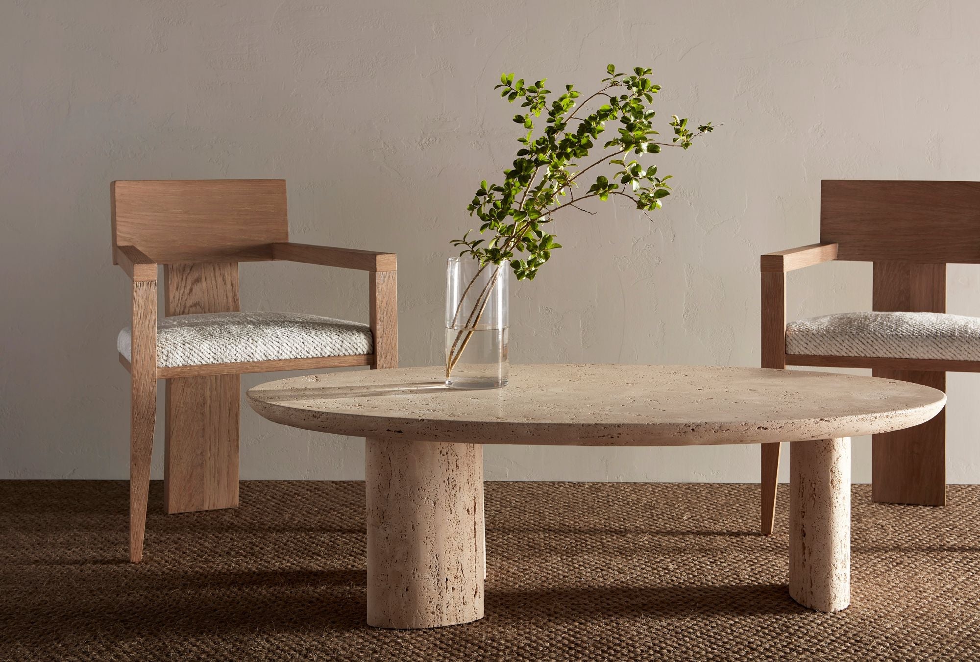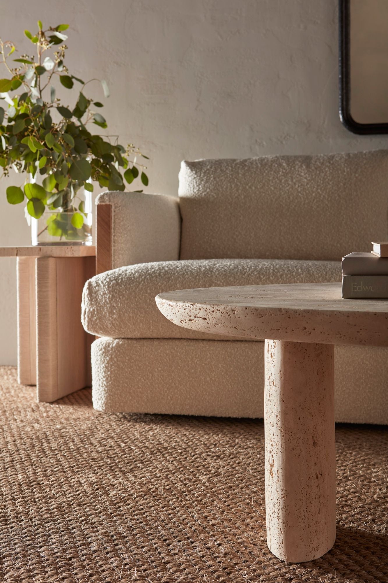 Relaxed and earthy, the Column Cocktail Table adds a vintage look to any room. Its '70s-inspired proportions, creme travertine surface and high-texture design create a feeling of depth and dimension.