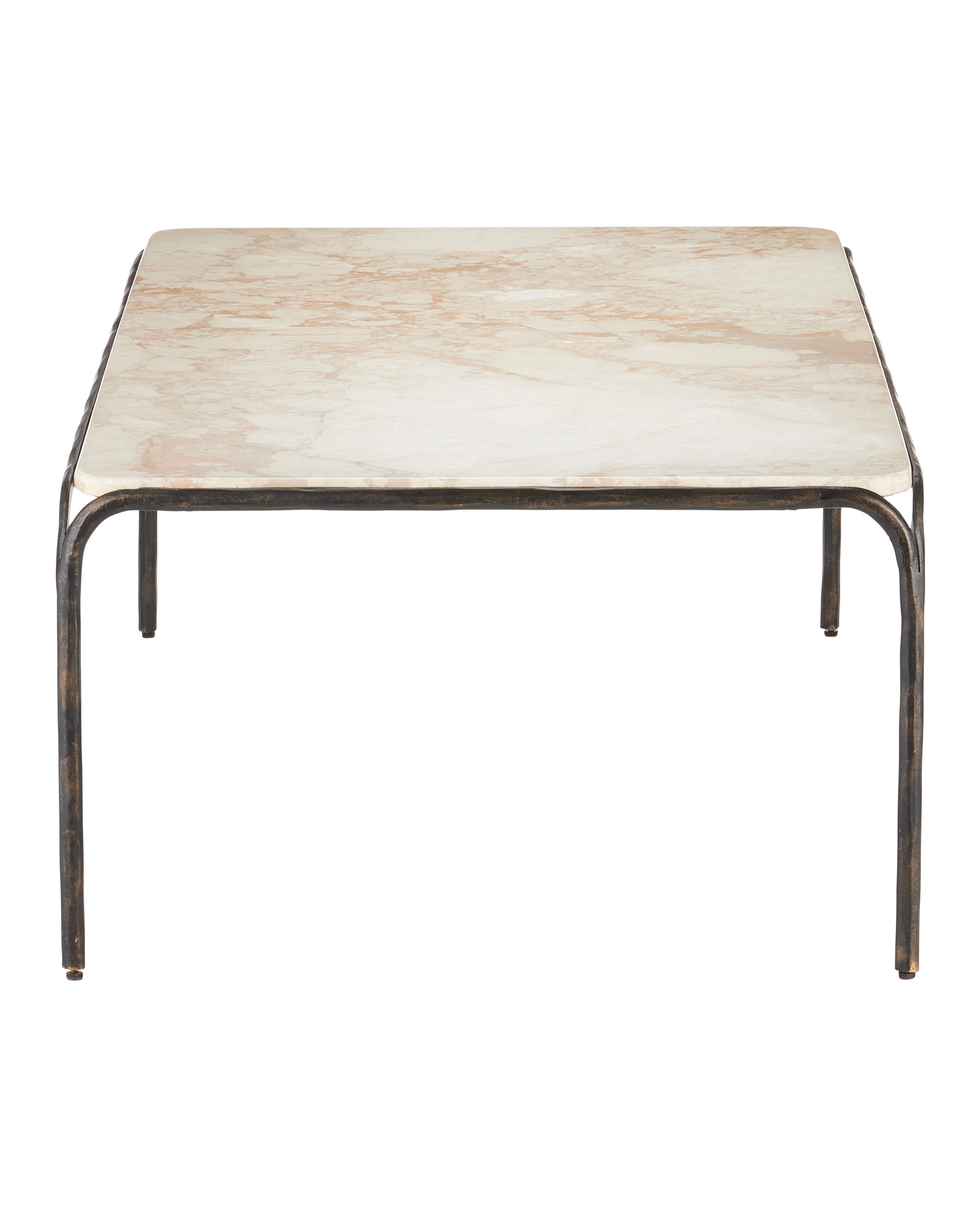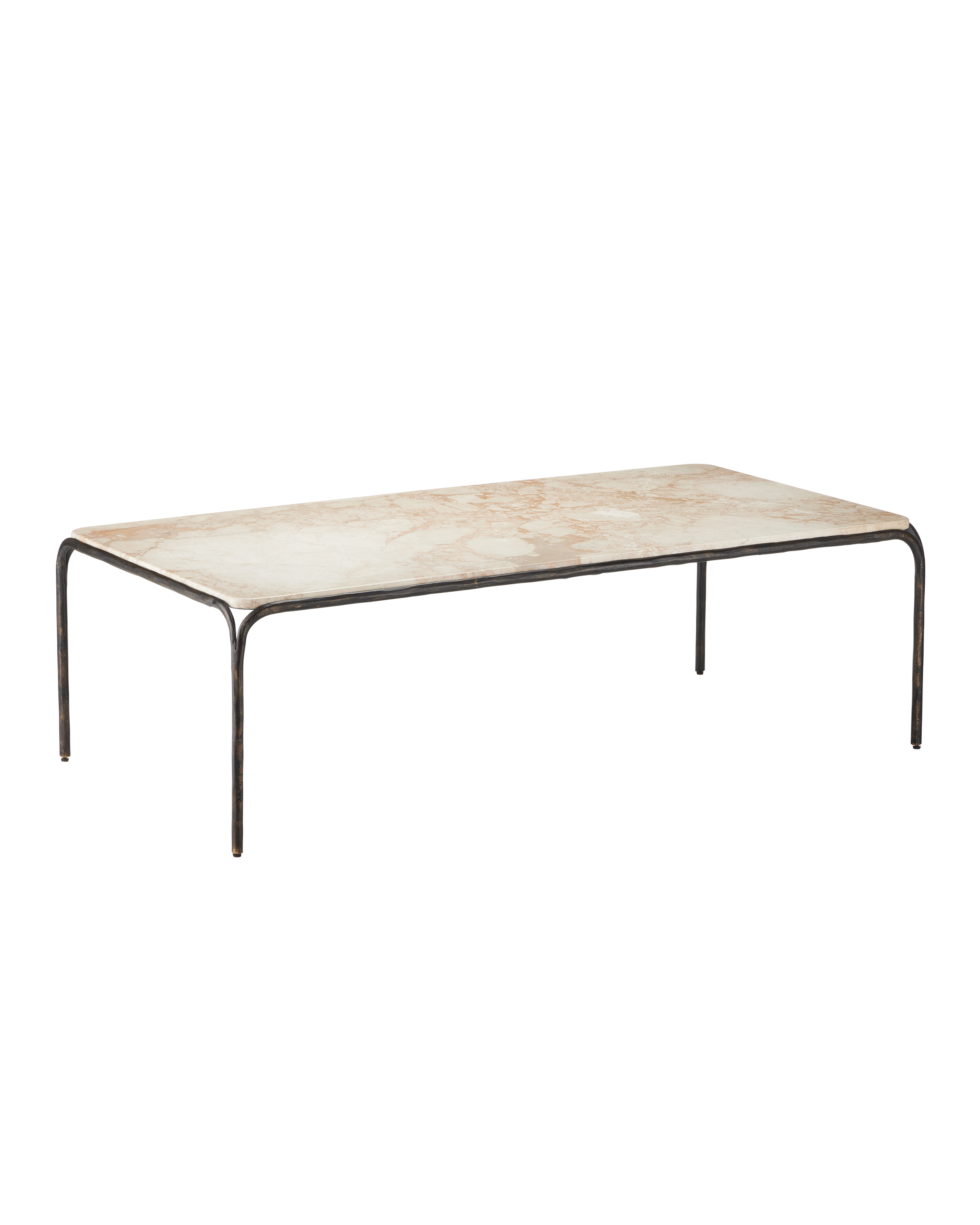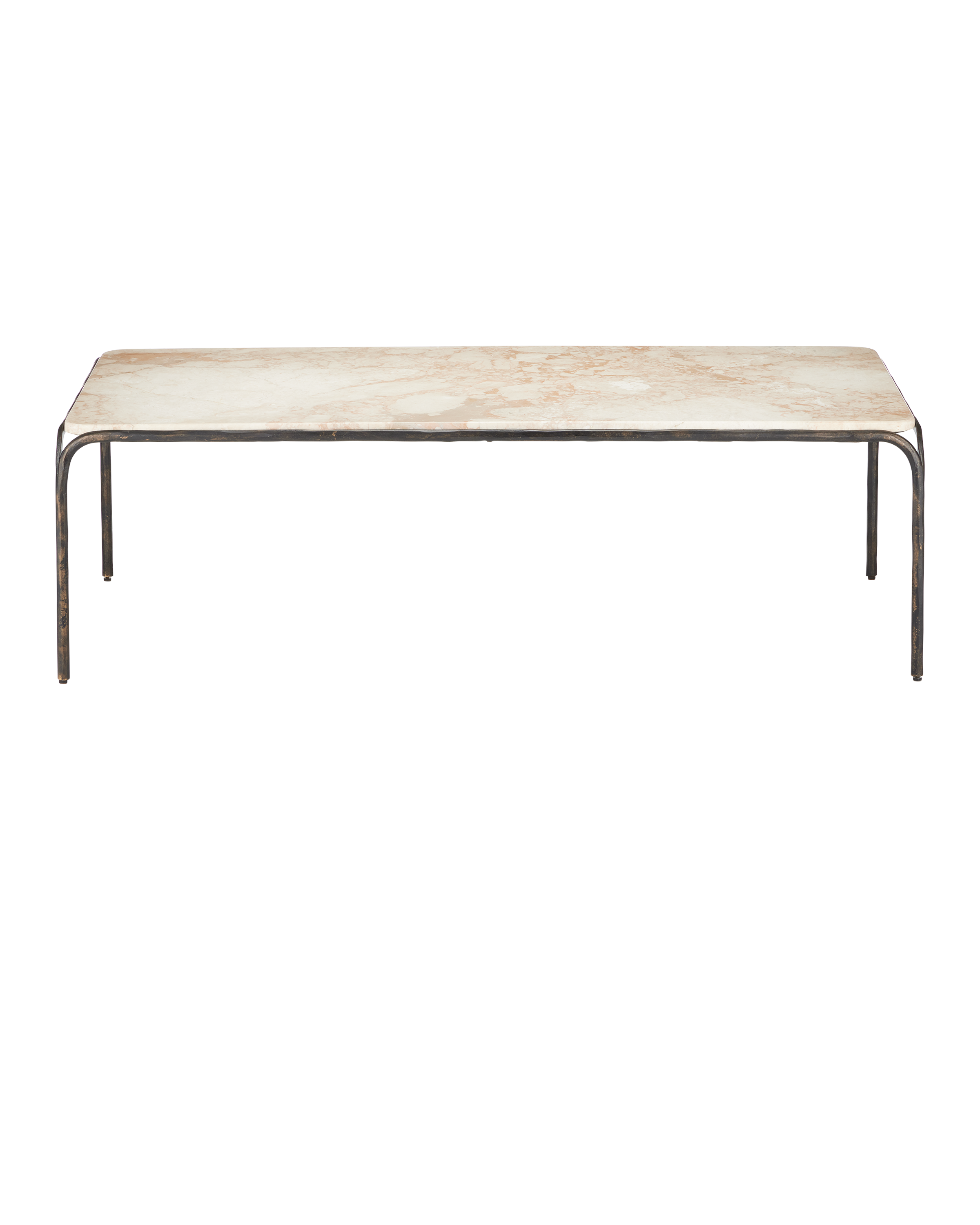 Combining industrial elegance with artisanal craftsmanship, the Crema Cocktail Table is made of metal in a warm bronze finish with a hand-forged appearance that adds depth to its streamlined silhouette. The frame folds down and away from a crema marble top at the corners to create a forked design that matches the ends of the stretchers where they meet the legs.