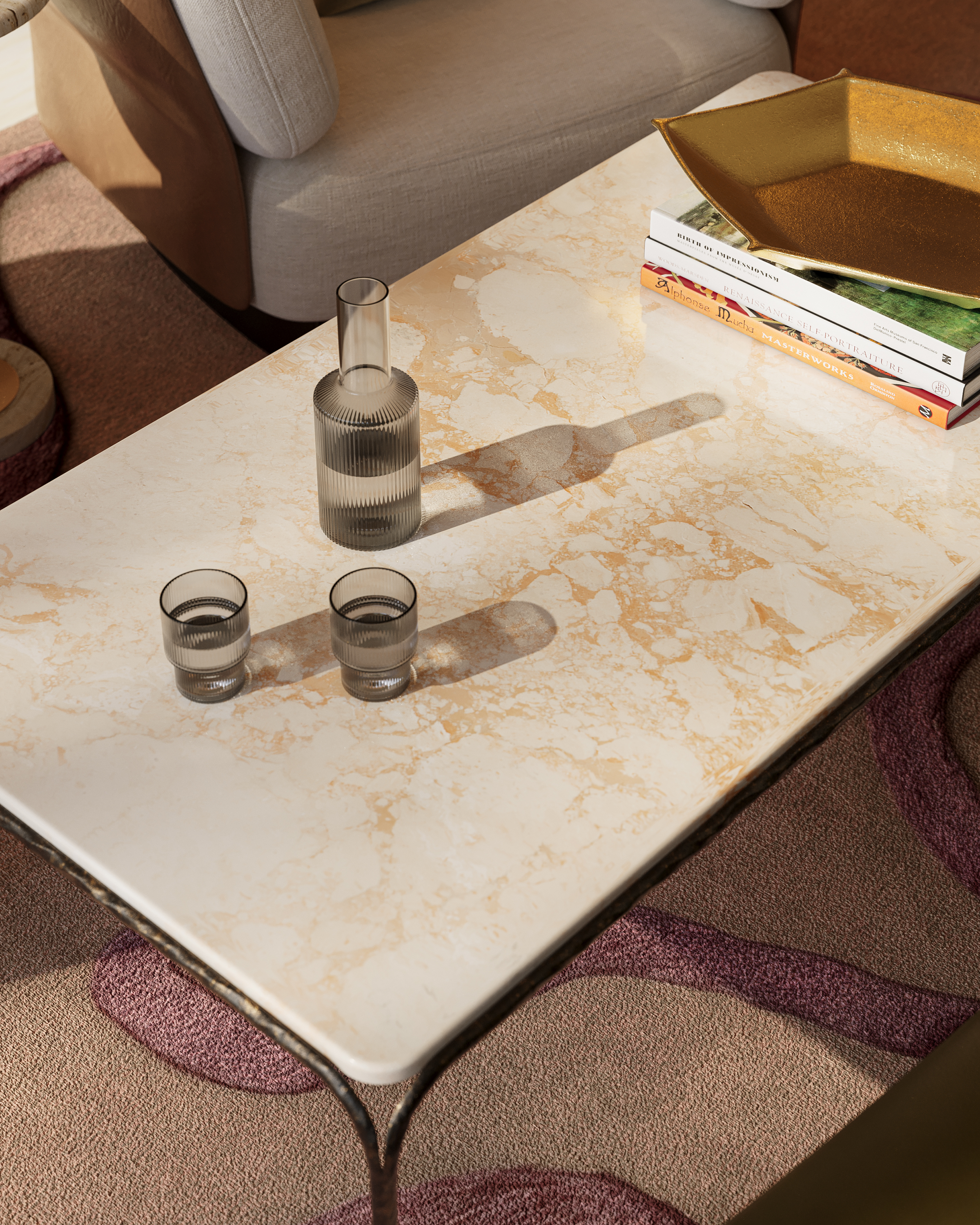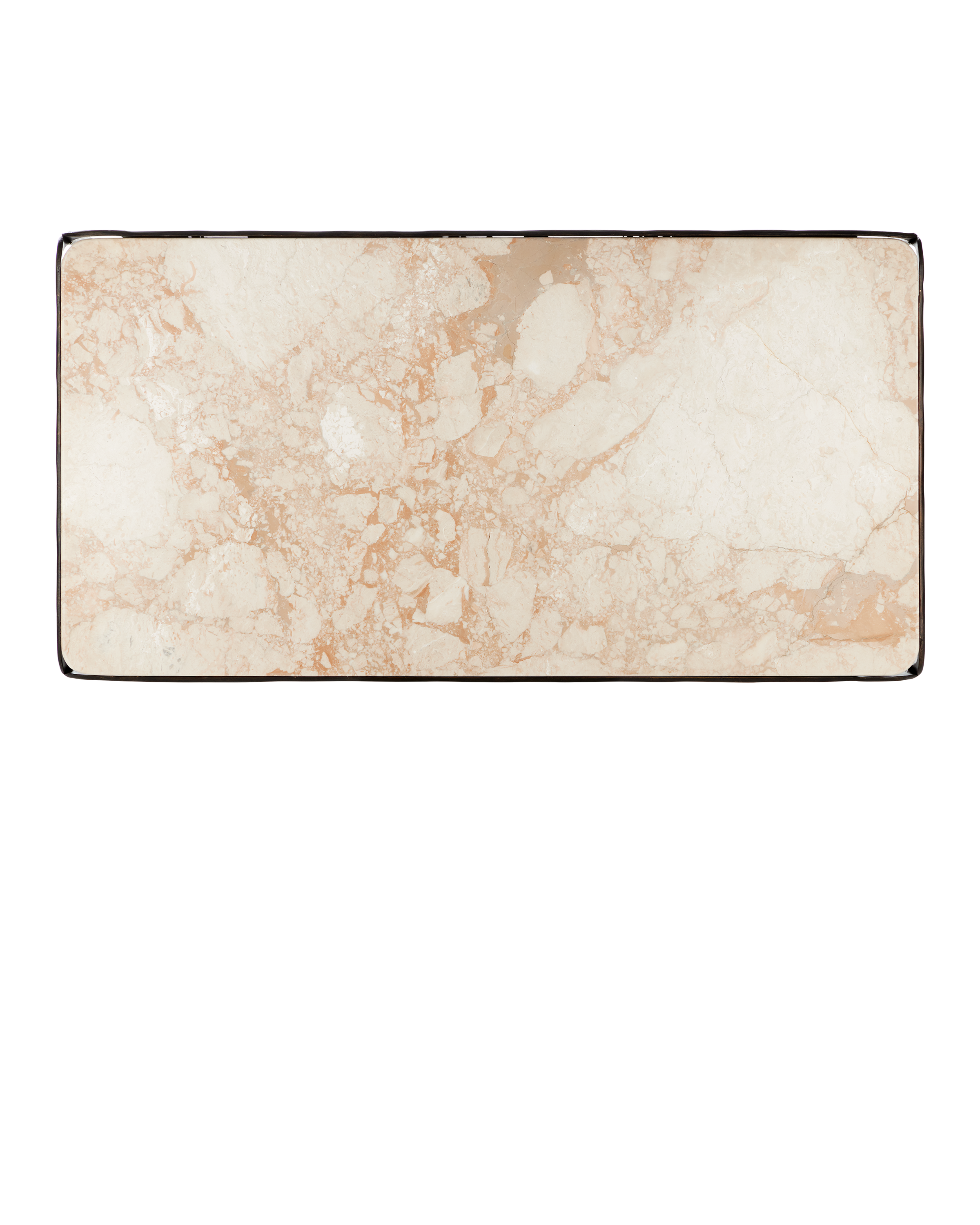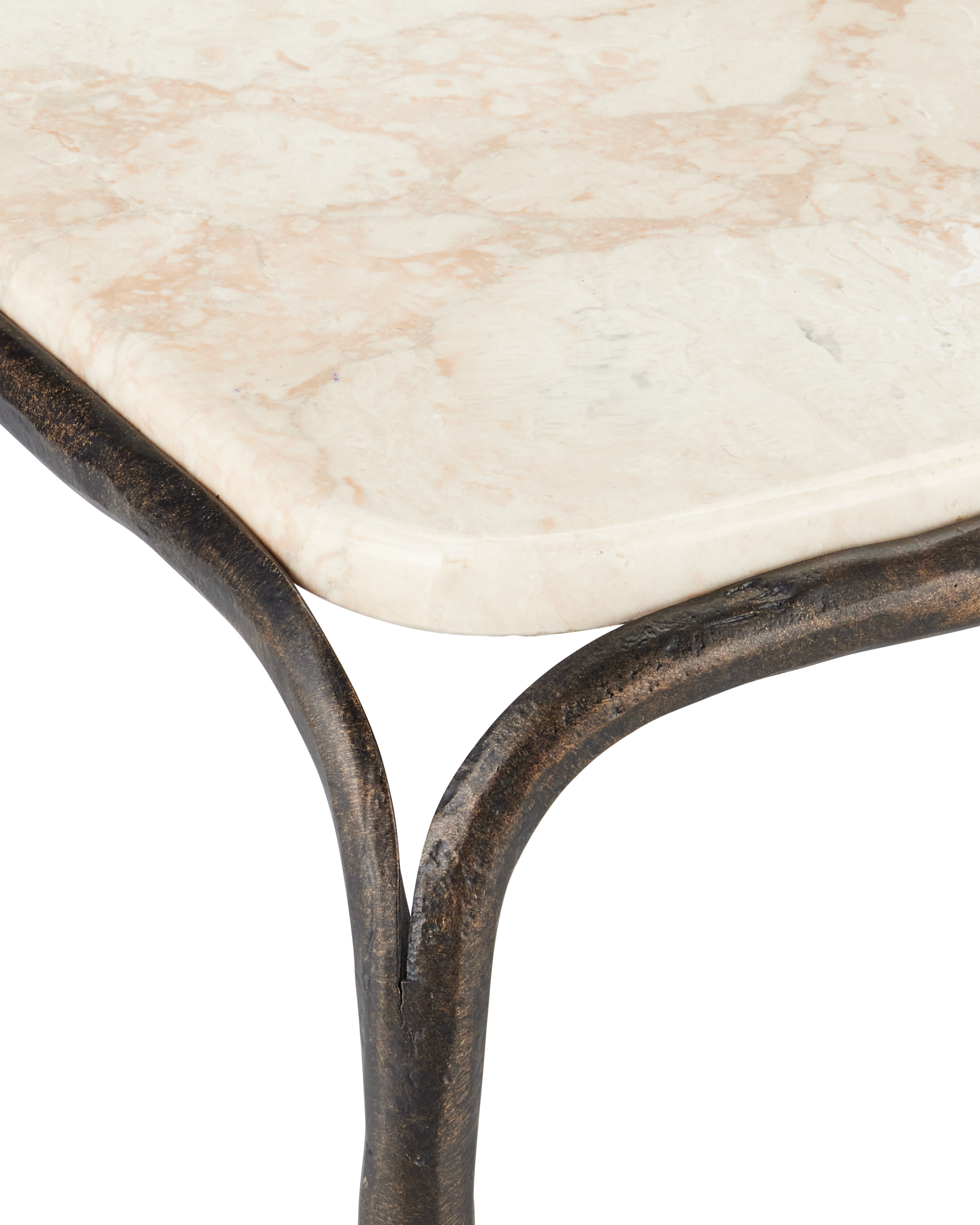 Combining industrial elegance with artisanal craftsmanship, the Crema Cocktail Table is made of metal in a warm bronze finish with a hand-forged appearance that adds depth to its streamlined silhouette. The frame folds down and away from a crema marble top at the corners to create a forked design that matches the ends of the stretchers where they meet the legs.