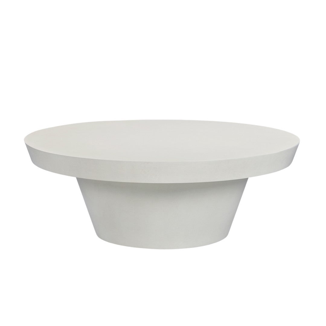 Our Fresco Coffee Table features a sculpted, round, smooth top, a thick, tapered top edge, and a tapered plinth base