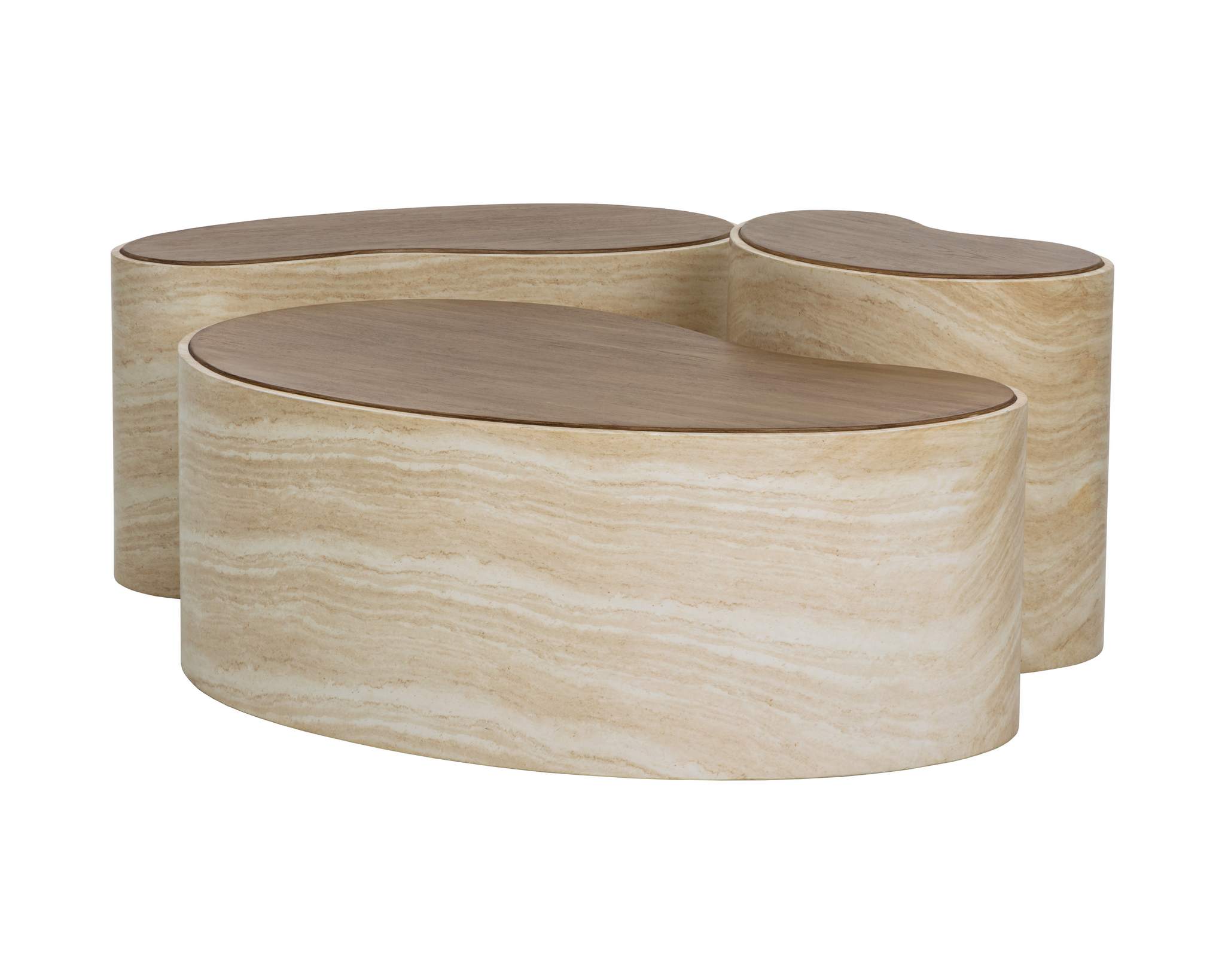 The Ishiko Coffee Table draws the eye with its sculptural, organic shape. Its gently curved, bean-like form is rendered in glass reinforced concrete, balancing the warmth of a light brown wood-effect top with the cool striations of a travertine-inspired base.