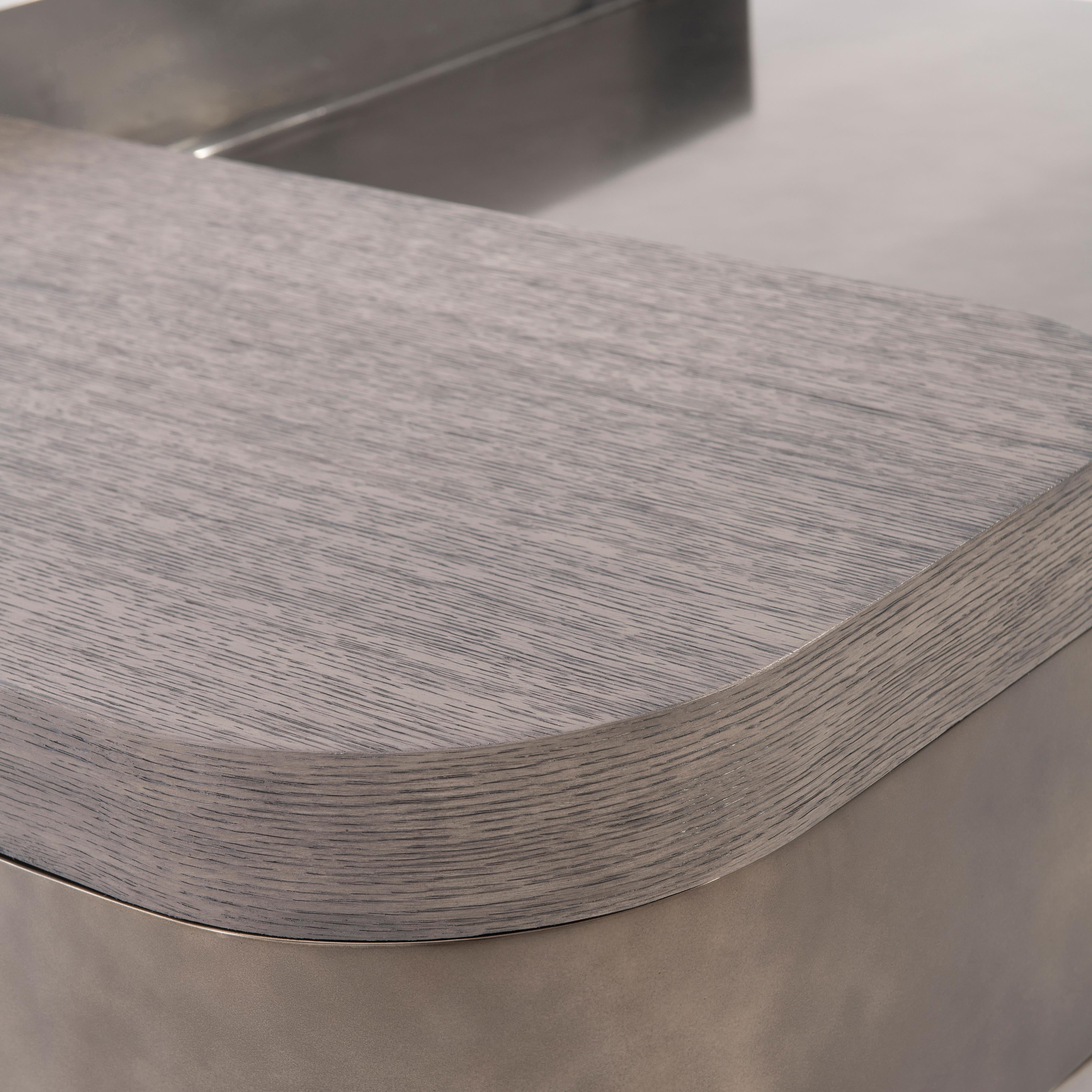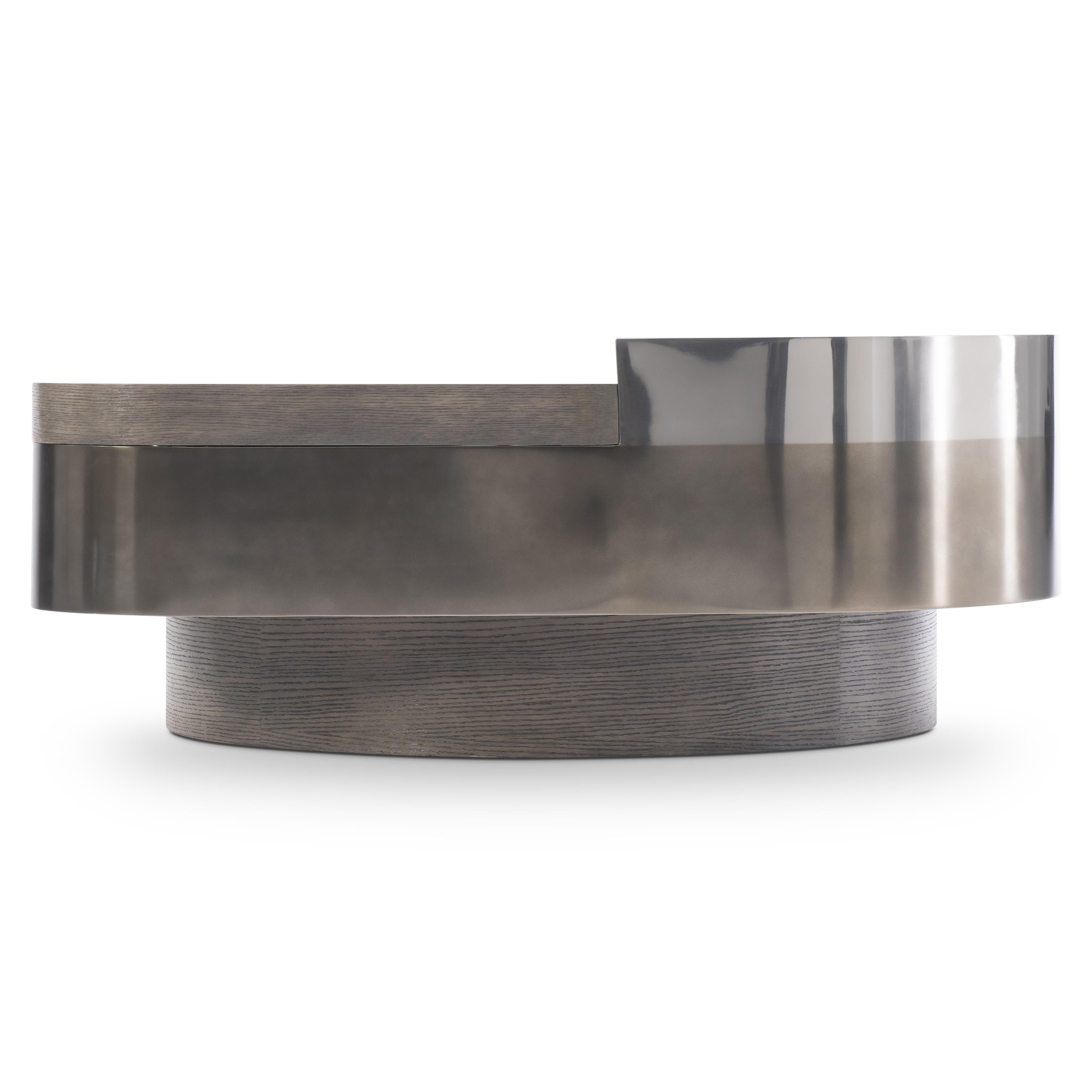 The Jacopo cocktail table offers a stacked and layered modern style, formed with metal and oak. Shapes are curved and flowing, with the stainless steel in both Dark Bronze and Light Bronze finishes. The wire-brushed wood, finished in Kona, offers an inner shelf and a round base.