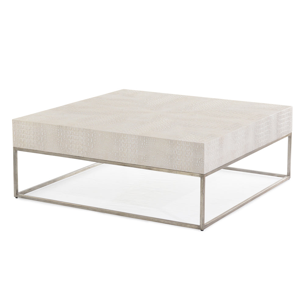 Mounted on a simple metal-framed base in a textured finish in silver white, the top of the Kano cocktail table features a book-matched crocodile pattern in textured resin finished in variegated tones of cream and white.