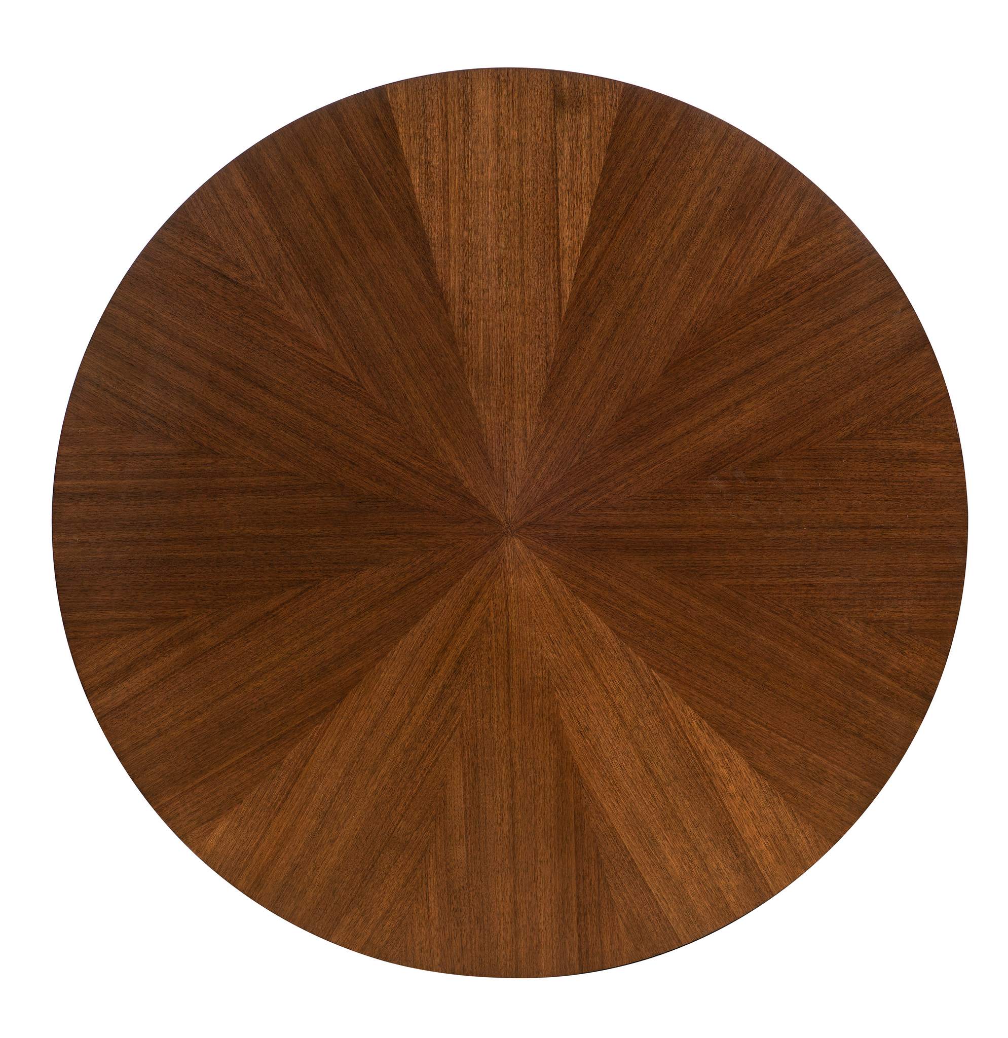 This modern Hollywood Regency inspired walnut cocktail table features a beautiful sunburst veneer top and a carved apron with an elegant raised oval bead detail that reveals vertical grain that sits upon gently tapered legs that are fitted with Satin Nickel sabots. Stocked in the Kiam Truffle finish as shown. Also available in optional finishes as HC9079-70.