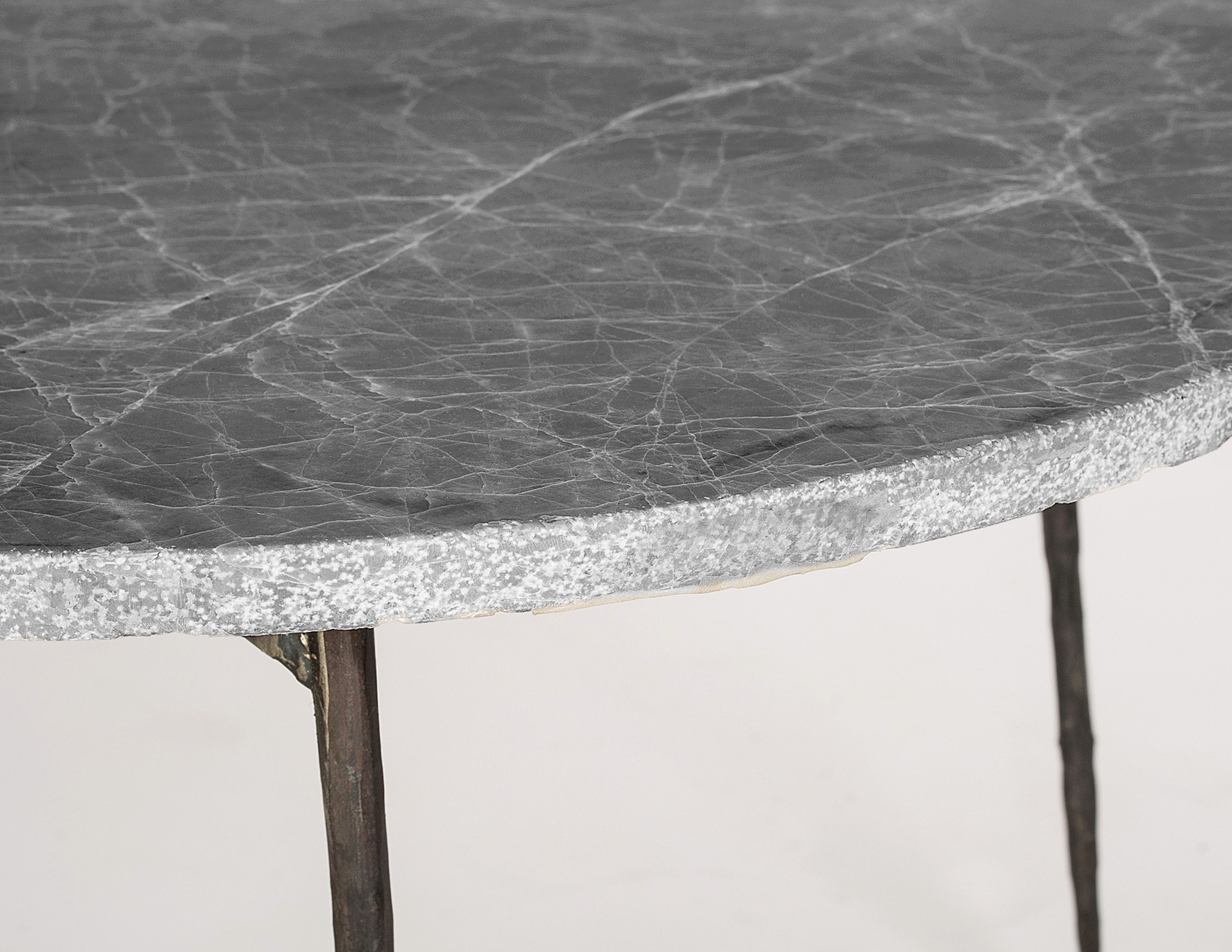 The TUK TUK tables are artisanal masterpieces. The base is forged hammered steel with elegant points down. The black Marquina Spanish marble has a honed finish and a natural shape, the edge detailing is sand-blasted giving the tables their hand made appearance.