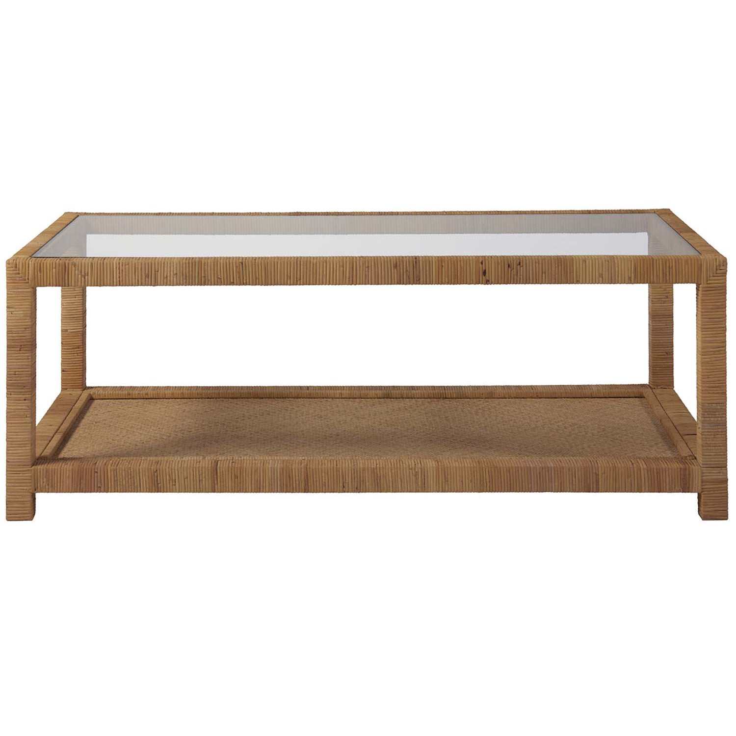 A sleek, rectangular glass top and a fresh open-air display shelf is framed by an earthy, wrapped rattan in the Long Key Cocktail Table, a light and refreshing living room furnishing.