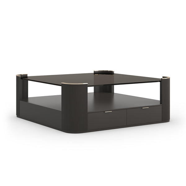 A square cocktail offers the most design flexibility in a room and this piece is no exception. It easily groups with other chairs and tables in a room. This piece has a clear glass top and half-moon fluted casework at each rounded corner in Dark Chocolate. There is an open storage area for magazines, two drawers at the bottom, Caracole-stamped Whisper of Gold metal tab pulls and soft-close under mounts. The drawer interiors are finished to match.