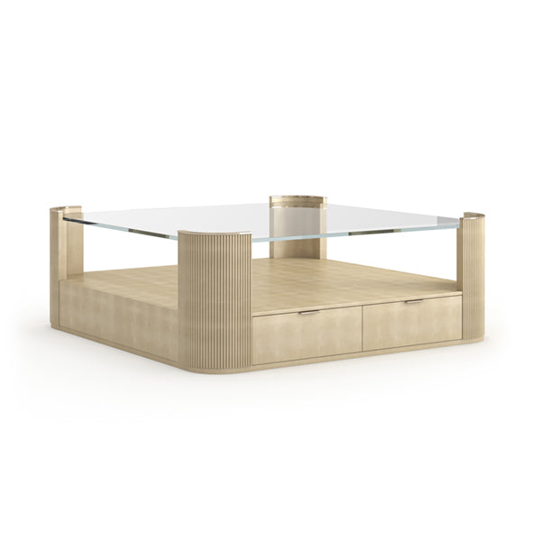 A square cocktail offers the most design flexibility in a room and this piece is no exception. It easily groups with other chairs and tables in a room. This piece has a clear glass top and half-moon fluted casework at each rounded corner in hand-applied Oracle leaf. There is an open storage area for magazines; and two drawers at the bottom Caracole-stamped Whisper of Gold metal tab pulls and soft-close under mounts. The drawer interiors are finished to match.