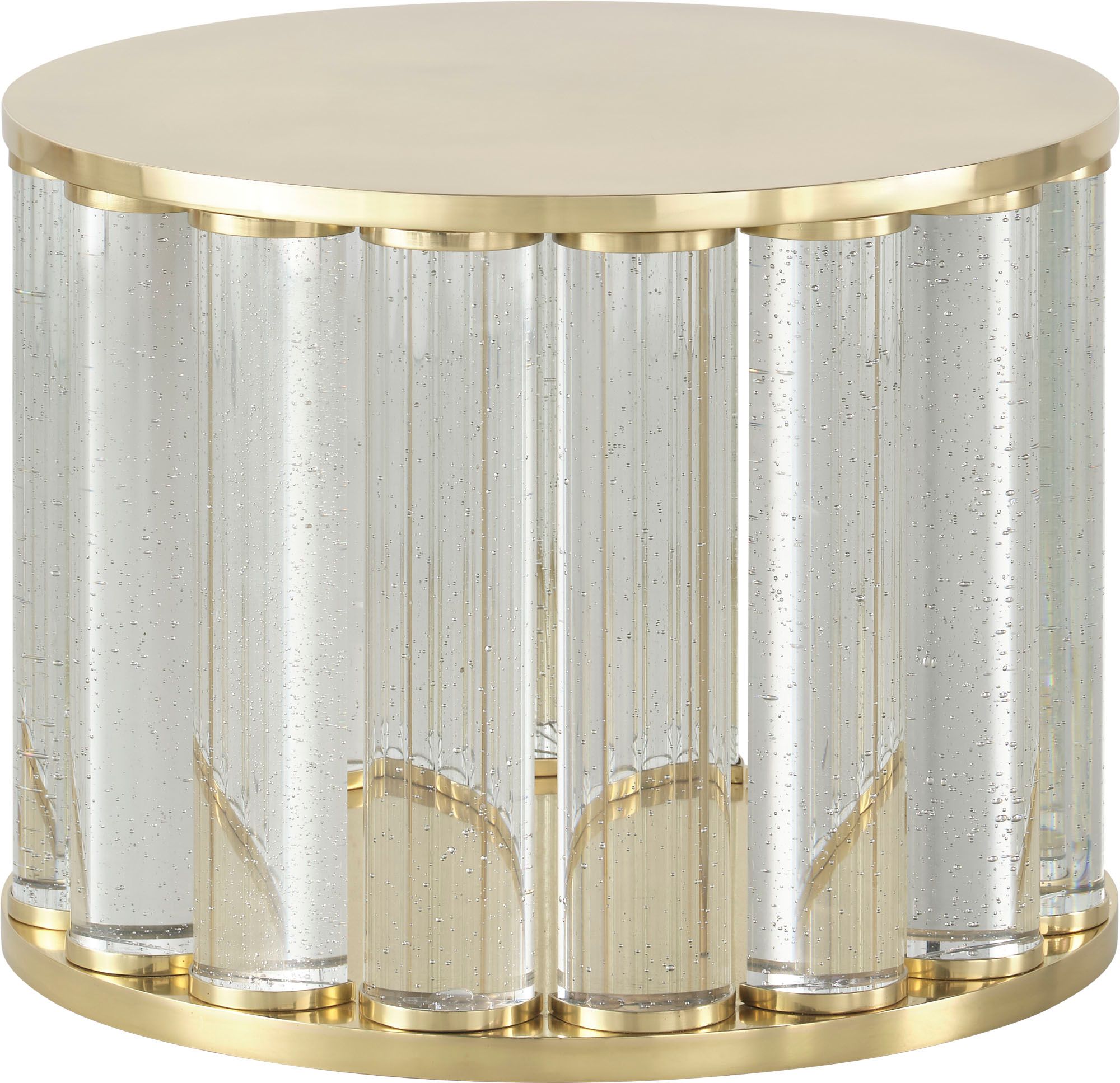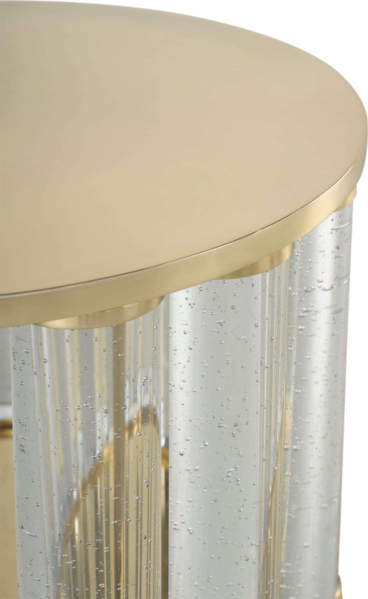 The Marlo Cocktail Table emulates the shaping and style of a baguette-cut diamond tennis bracelet. Its cylindrical shape features a polished brass top and base and fractures the light, creating a 360-degree showcase around the luminous crystal colonnade.