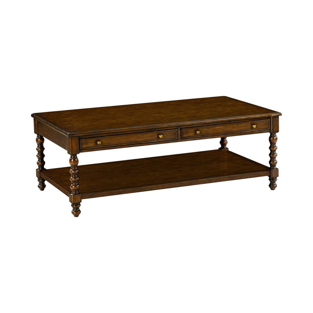 Our Mesa Coffee Table features a round smooth top, OGEE edge, apron, turned legs, and four storage drawers; Country finish on Acacia crown veneer and solids.