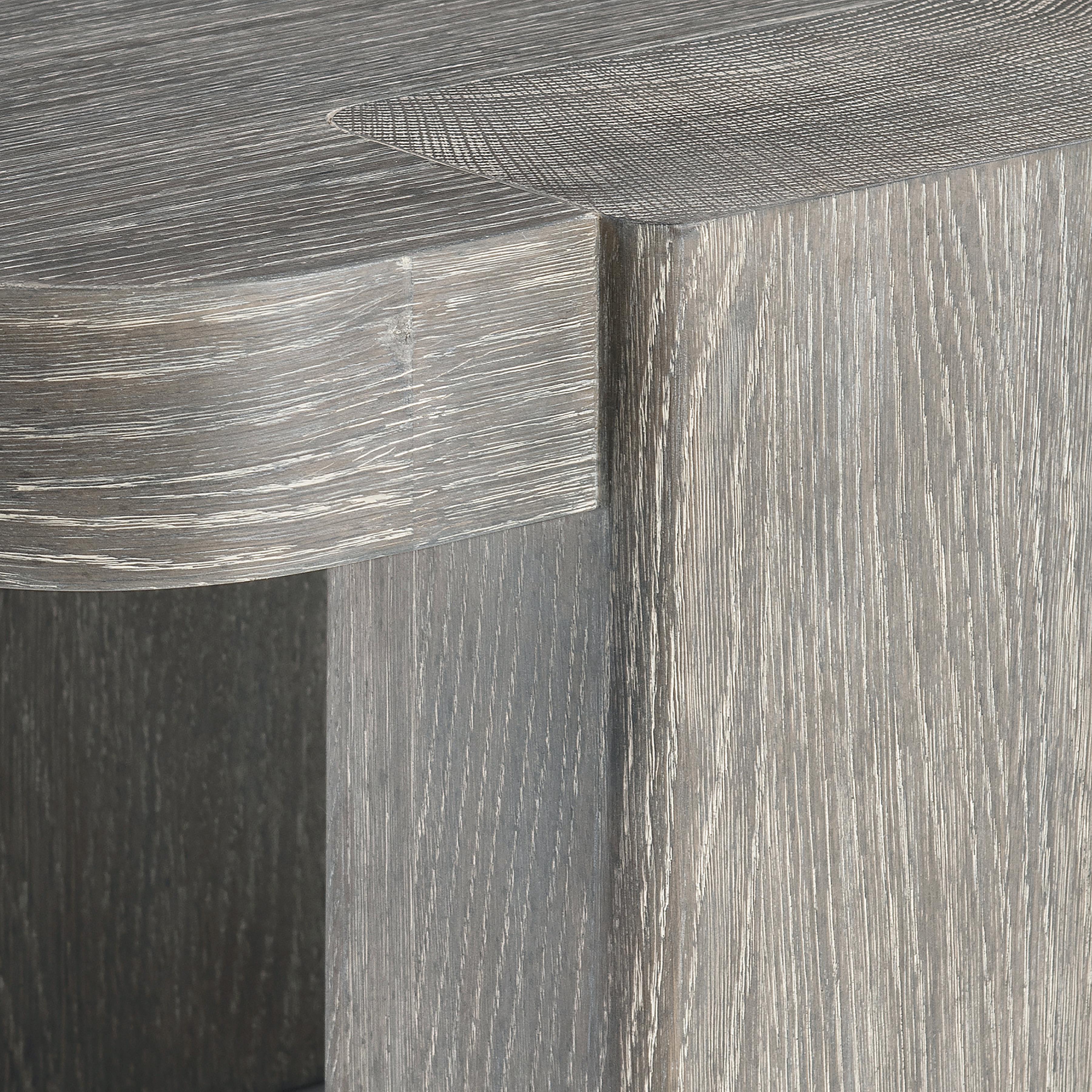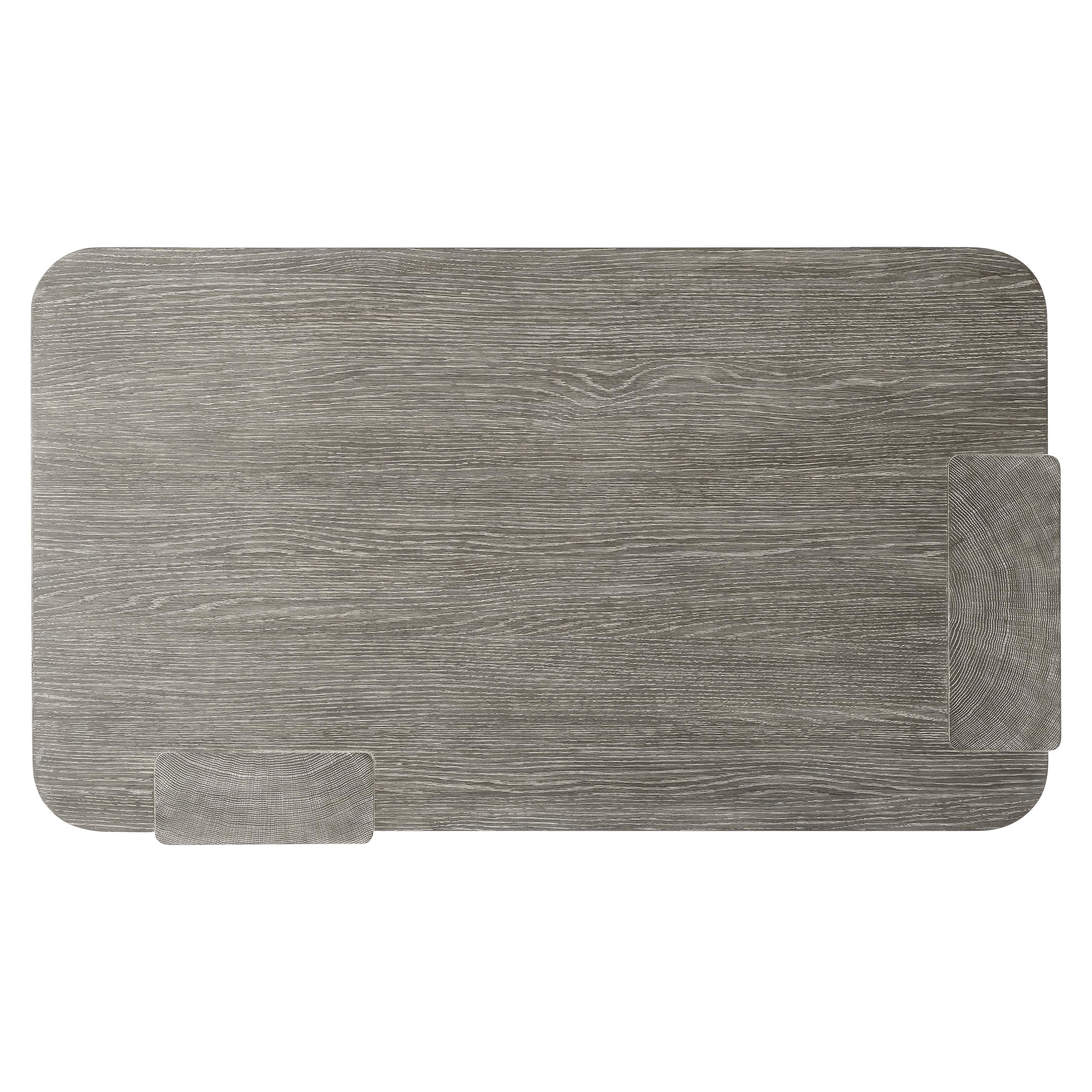 Two offset vertical posts pierce the top of the Monolith cocktail table while a third offers a larger solid support. The asymmetrical style is topped by a rectangular surface with rounded corners. The Puma finish highlights the wirebrushed wood's natural grain.