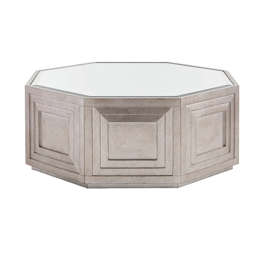 Featuring beveled step-down panels on each of the eight sides, the design showcases the hand-applied silver leaf finish with surface interest. The inset beveled mirror top surface adds a reflective sparkle to the room. Ariana offers a high-fashion take on modern luxe living, blending a hand-glazed platinum finish with sophisticated accents like burnished silver leaf, platinum-finished stainless steel, elegant silver gray drawer interiors and polished silver marble with veining in shades of taupe and gray. Designs feature classic lines, with elements like raised panel doors, tapered legs and hand striping. Custom upholstery styles showcase fresh color palettes and tailoring details like decorative tapes and beaded fringe. The result is a lifestyle aesthetic that celebrates a chic, sophisticated interpretation of today's contemporary design. Inset beveled mirrored top, silver leaf finish, design features step-down panels on each face Inset mirror plate 41. 875W x 41. 875D x . 25 inch thick, 1 inch bevel.