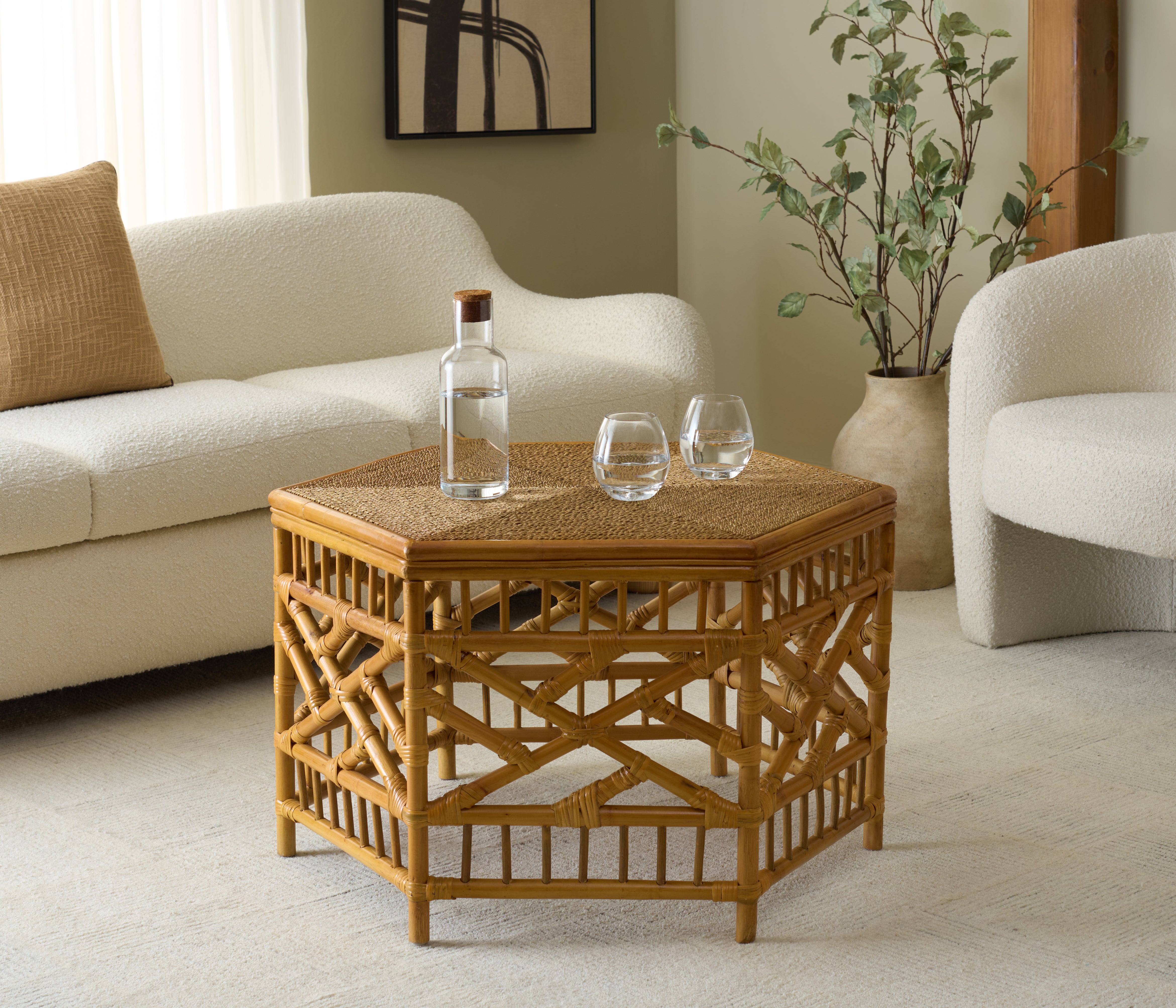 Introducing the Frederica Rattan Pole and Seagrass Coffee Table in natural. This beautifully crafted piece combines the warmth of wood, the intricate patterns of rattan, and the unique texture of seagrass. With 70 percent rattan and rattan pole, this table brings an organic touch to any living space. The natural hue complements a variety of decor styles, making it a versatile addition to your home. The blend of materials not only adds an aesthetic appeal but also highlights the skillful craftsmanship involved in its creation. The table's surface provides enough space to display your favorite magazines, decor items, and serve your morning coffee. Meanwhile, its sturdy structure ensures it serves as a reliable gathering point for your family and friends. Experience the inviting charm of this coffee table and let it be the centerpiece of your room. Its natural elegance can seamlessly bring together different elements of your living area, creating a space that is both functional and visually appealing.