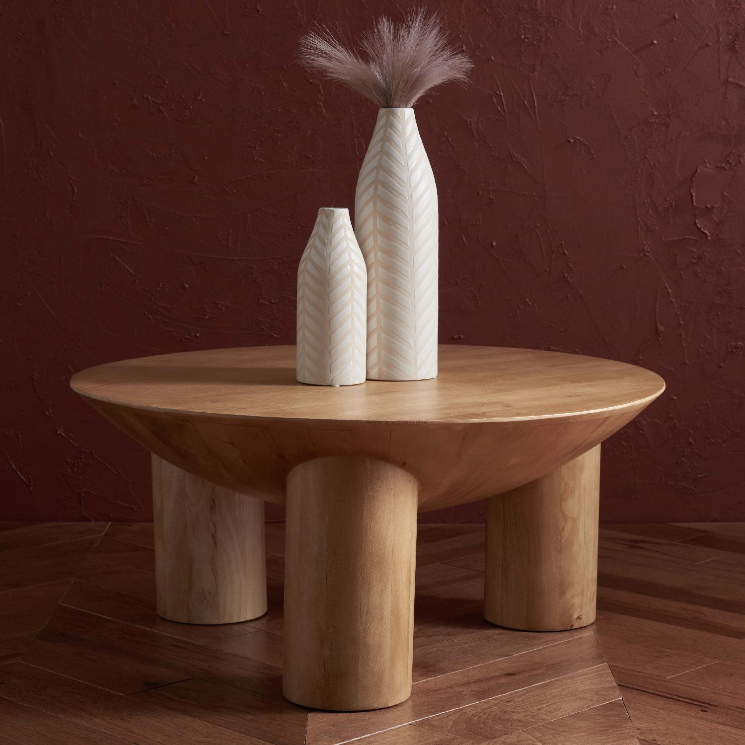 Brighten up your home with the bold and playful design of the Calhoun round coffee table. Its eye-catching tabletop beautifully bulges and curves at the bottom to present a sculptural silhouette. It is perfectly complemented by three bold and chunky cylindrical legs. Our coffee table captivates the eye with its asymmetrical and playful design. Crafted with solid mango wood, the table is enlivened with the lively grains of the wood, creating a beautiful display of our favorite decor items.
