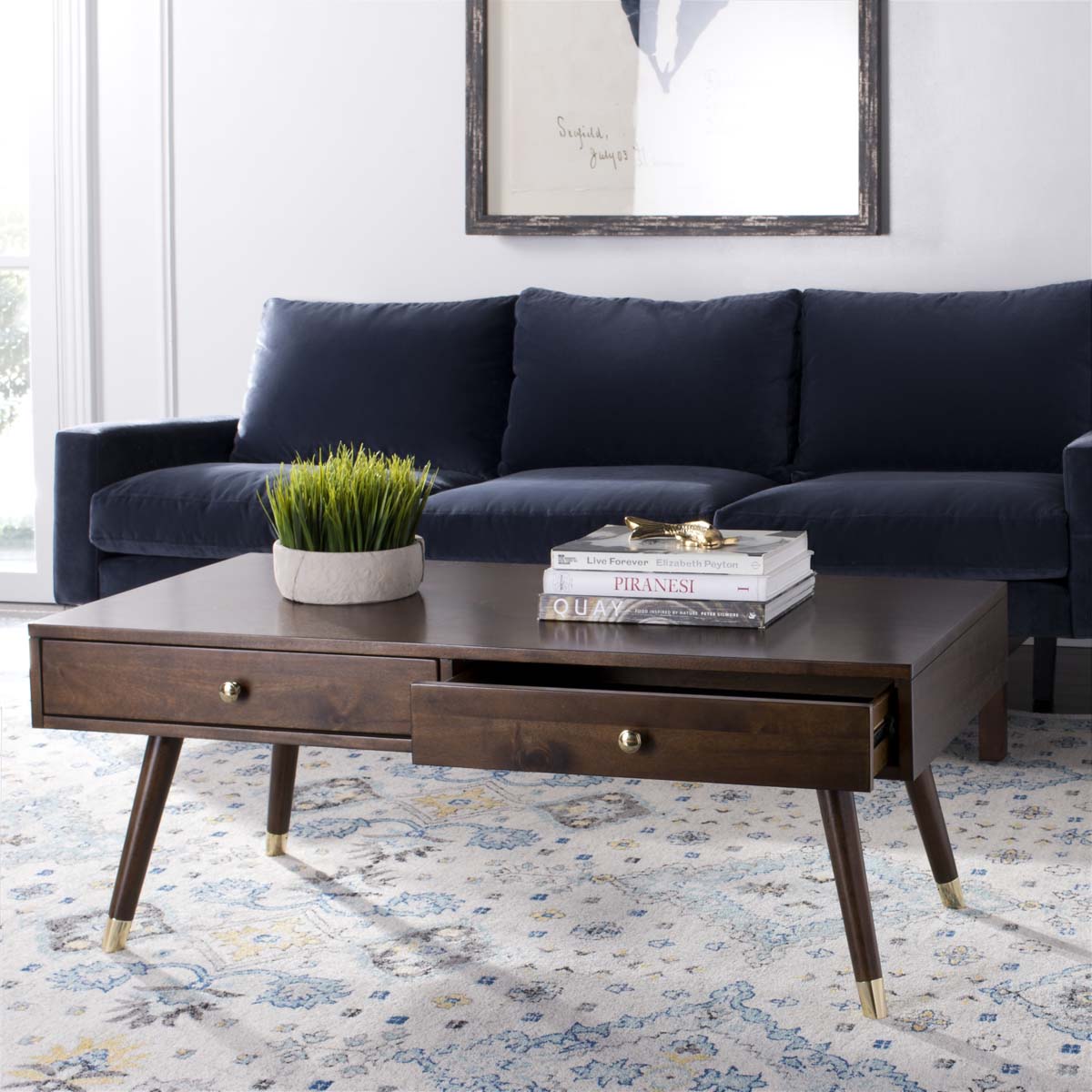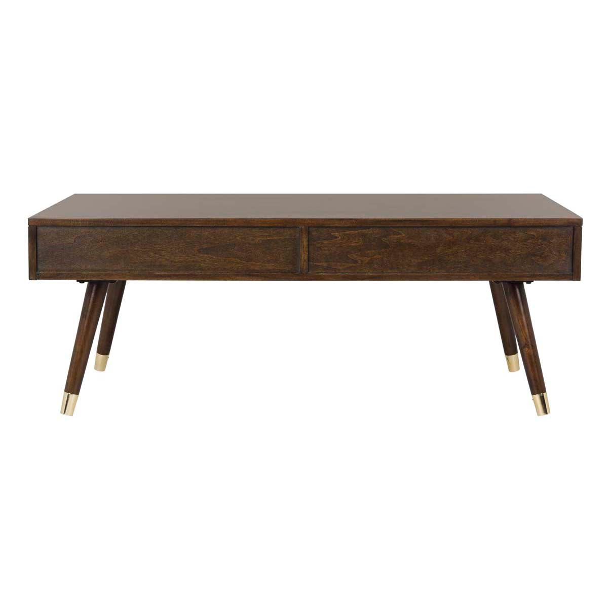 Add instant character to the living room with this contemporary gold cap coffee table. Designed for the modern tastemaker, its brown wood and bold gold finished brass hardware create its updated vintage style. Designers love its two ample drawers.