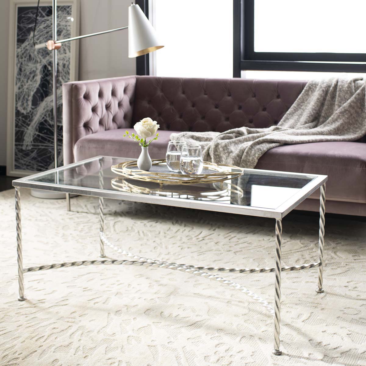 The timeless elegance of the Plaza hotel in New York City inspired the Matilda coffee table. Designed for the modern hostess, its silver leaf finish, glass and posh rope details create an air of effortless style in any interior oasis. White gloves optional.