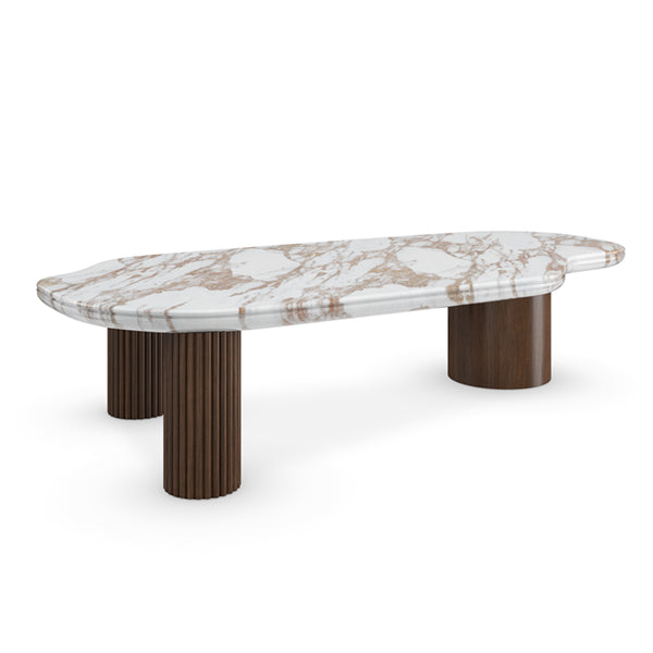 Boldly modern in a mix of wood and marble, this cocktail table grounds the room with an unforgettable presence. Artfully defining its fluid, organic shape: a highly figured, sculpted Calcutta Oro stone top with warm caramel veining. Reeding details add tactile appeal and striking contrast to table legs in a Retro Walnut finish. Pair with our Seychelles accent table for greater surface and dimension.