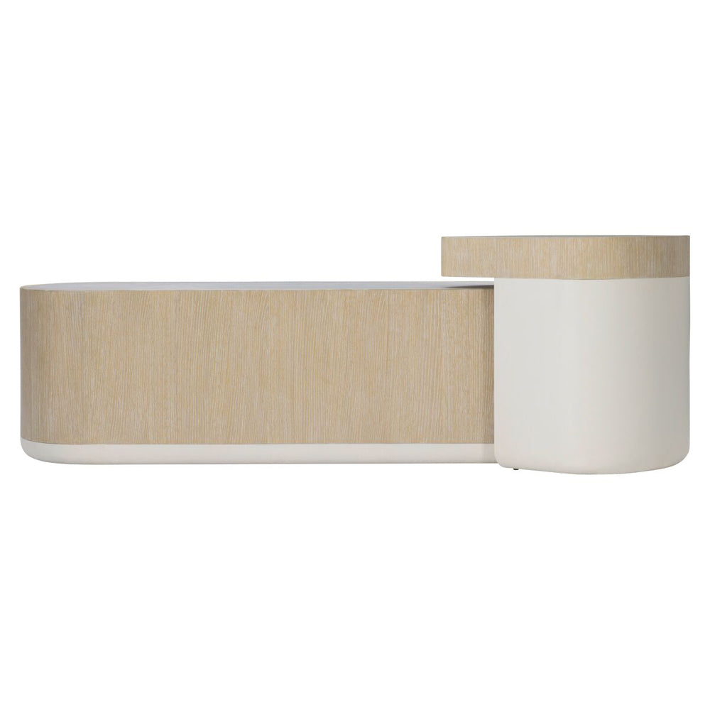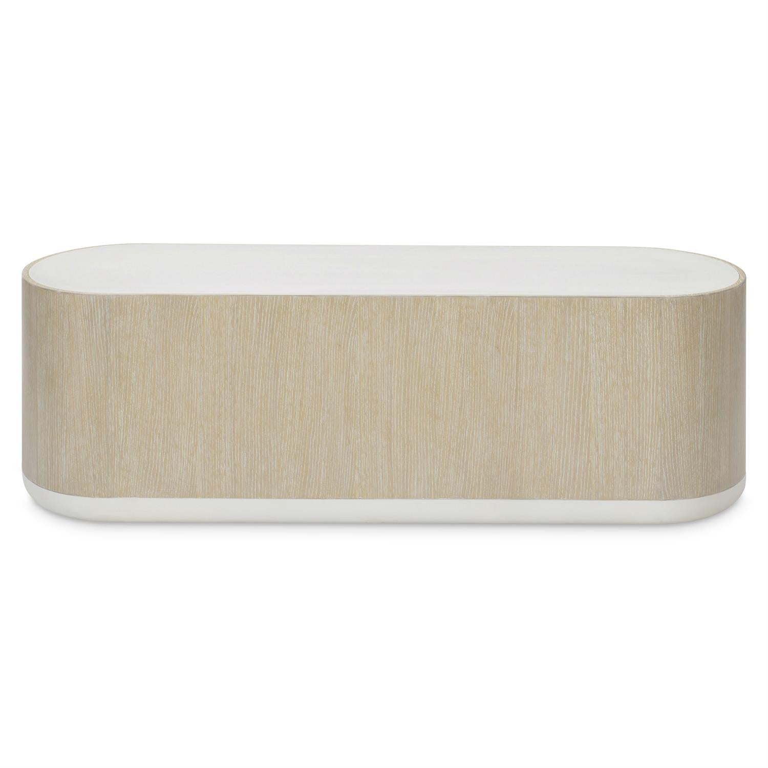 A sweep of simplistic style in a cocktail table made for modern living. Oval shapes define unity and cohesion, just as the Solaria cocktail table merges simple lines and stunning design. The base and inset top are finished in a light Fossil, while the center balances the look in a Dune finish. With a 56-inch length, the table takes a bold stance in any room, while casters allow it to be easily moved.
