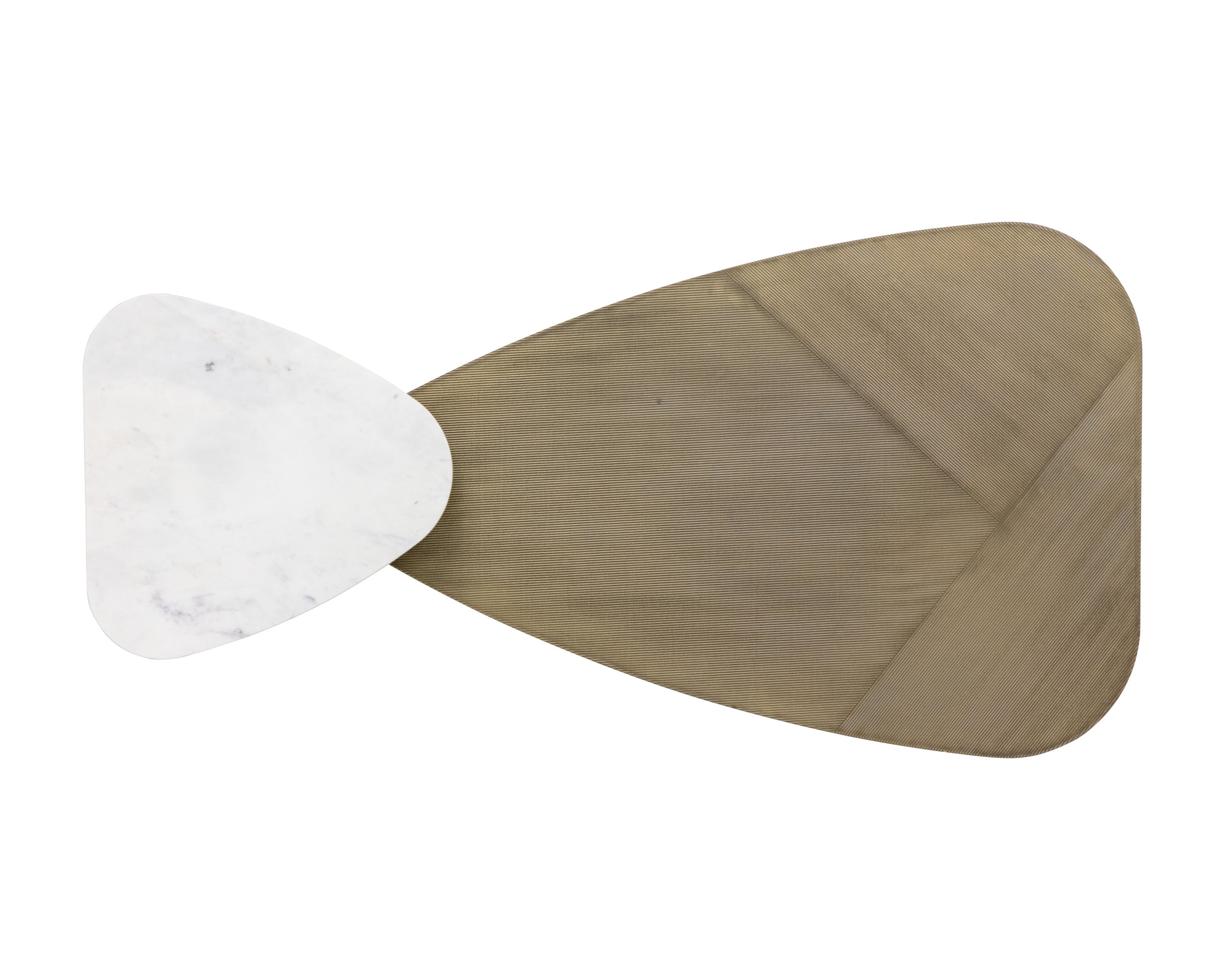 A unique coffee table crafted with mixed materials and organic shapes. Features a hand-etched antique brass iron top and legs with a white marble shelf. Made in India: With refined craftsmanship, this design was brought to life by skilled local artisans. By nature, these materials develop unique imperfections such as fissures, markings and colour variations for a truly one-of-a-kind piece. As marble is a natural material, unique veining, pitting, fissures, micro-cracks and colour variations are all characteristics that add to the uniqueness and beauty of each piece.
