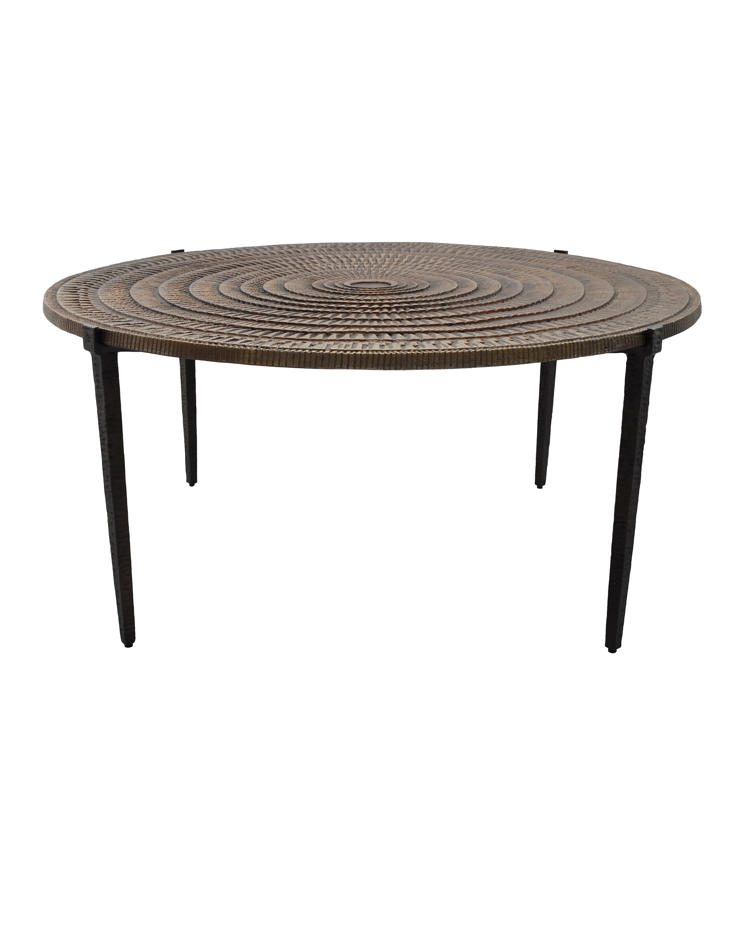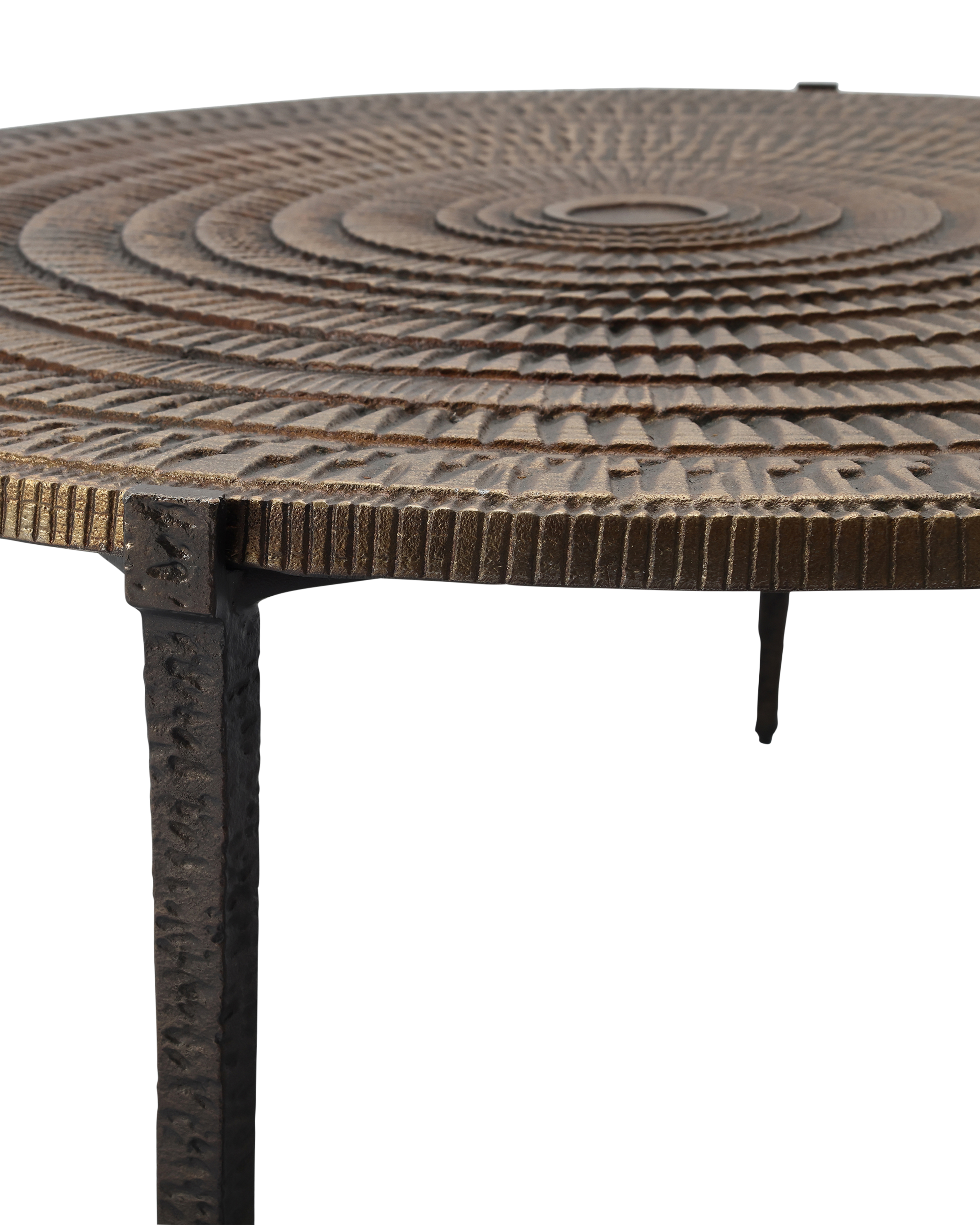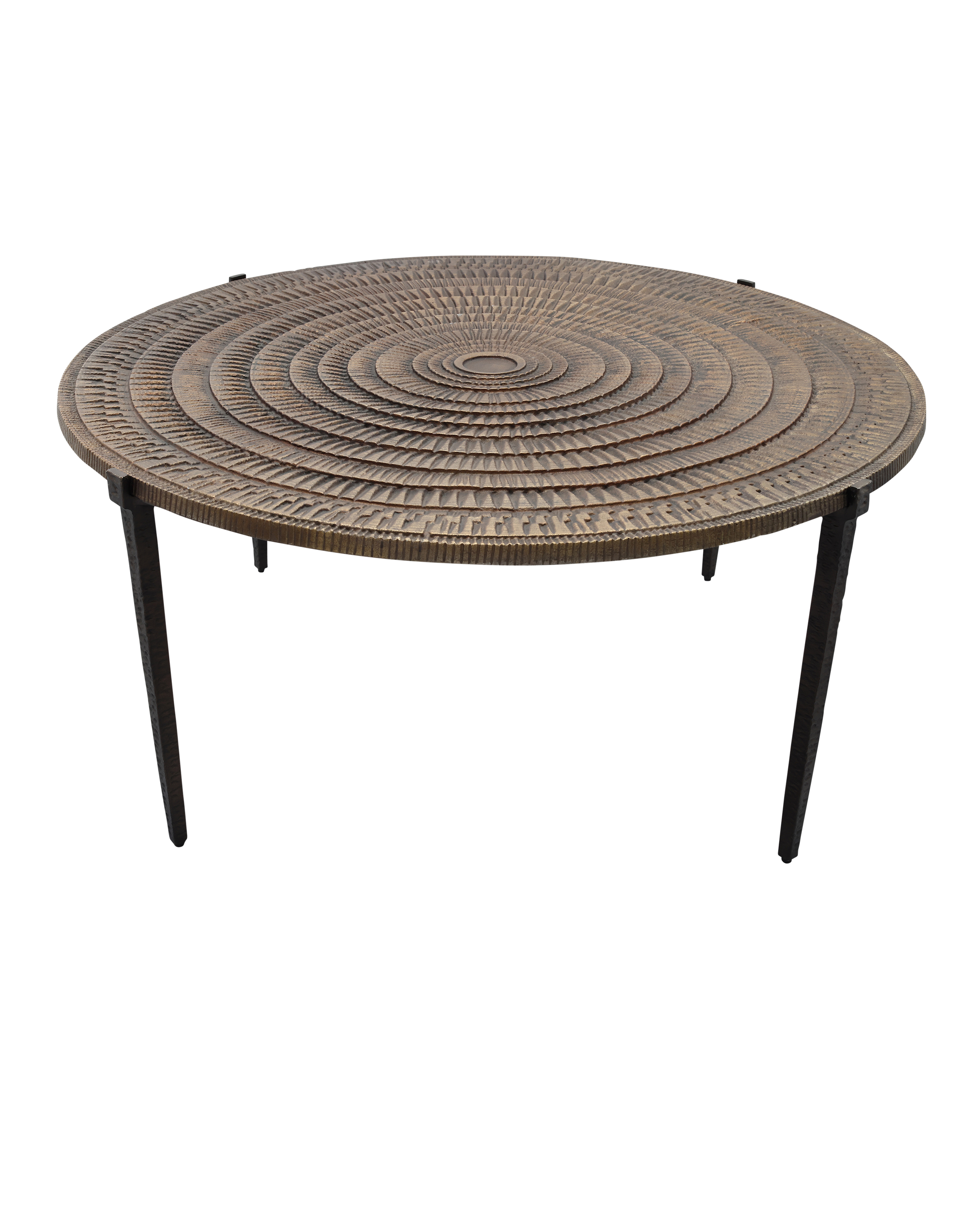 The Currey & Company Unity Cocktail Table is a bronze table with a top swirling with a toothy concentric pattern covered in an antique brass finish.
