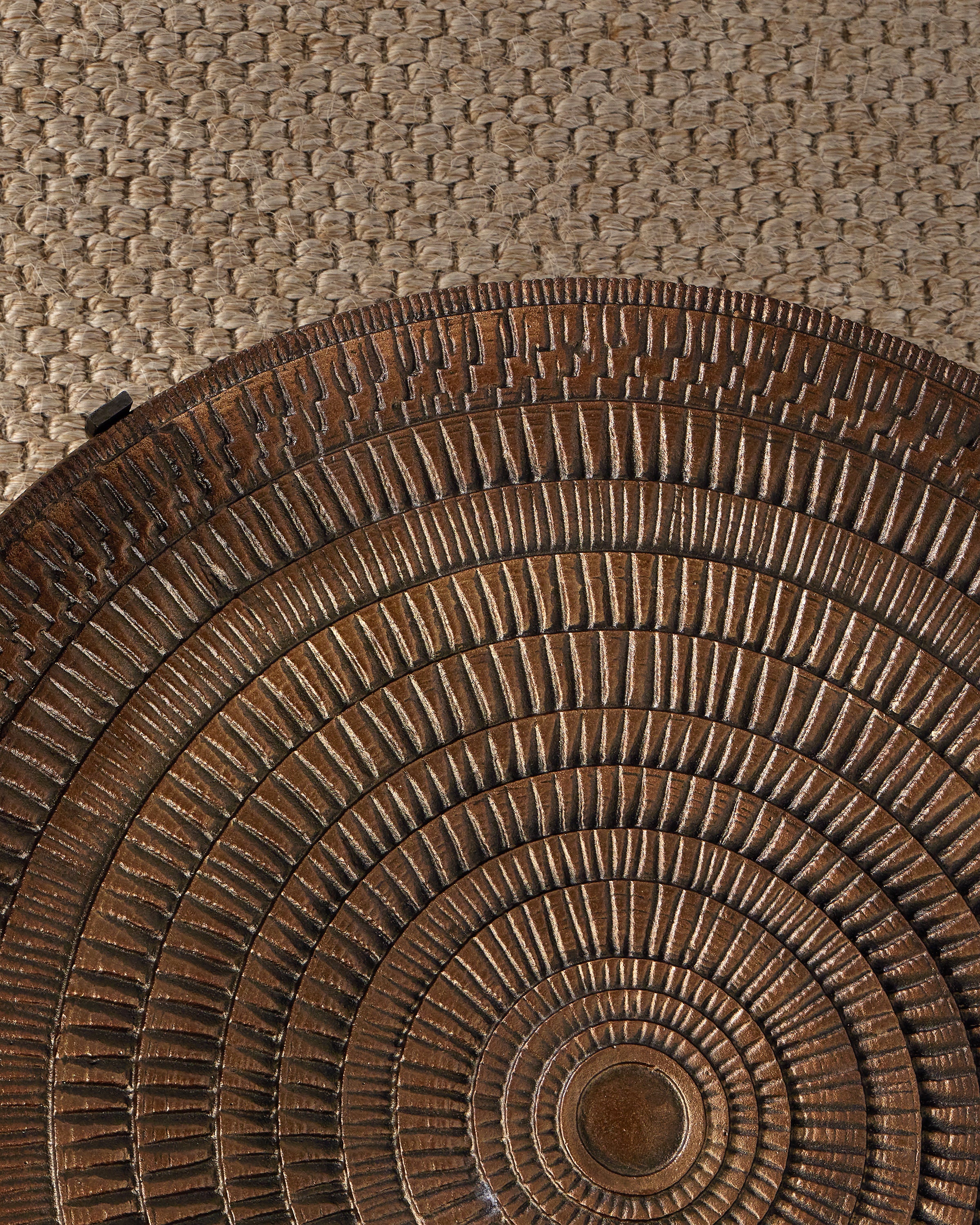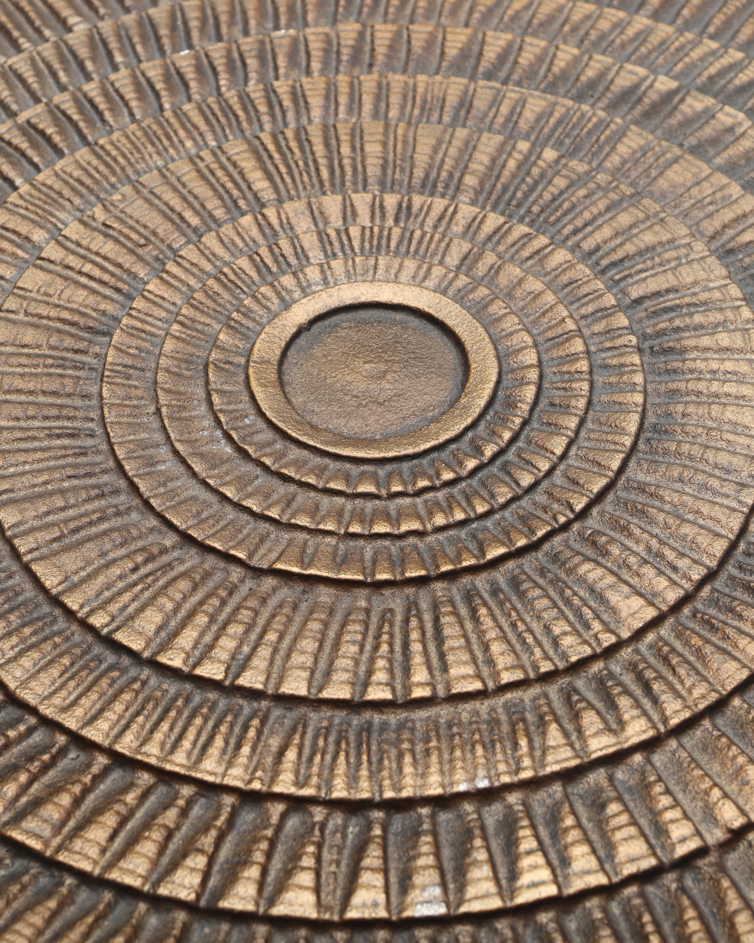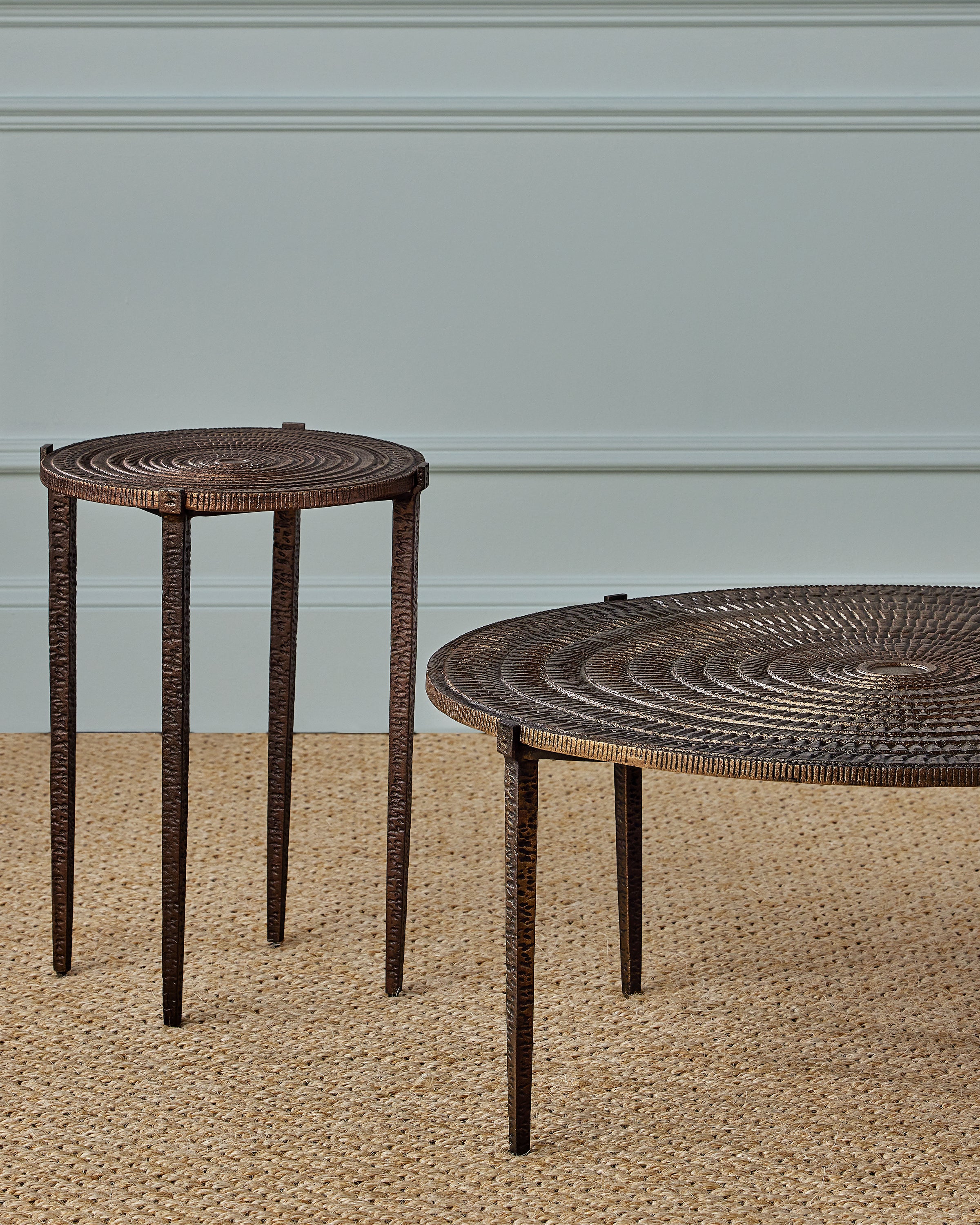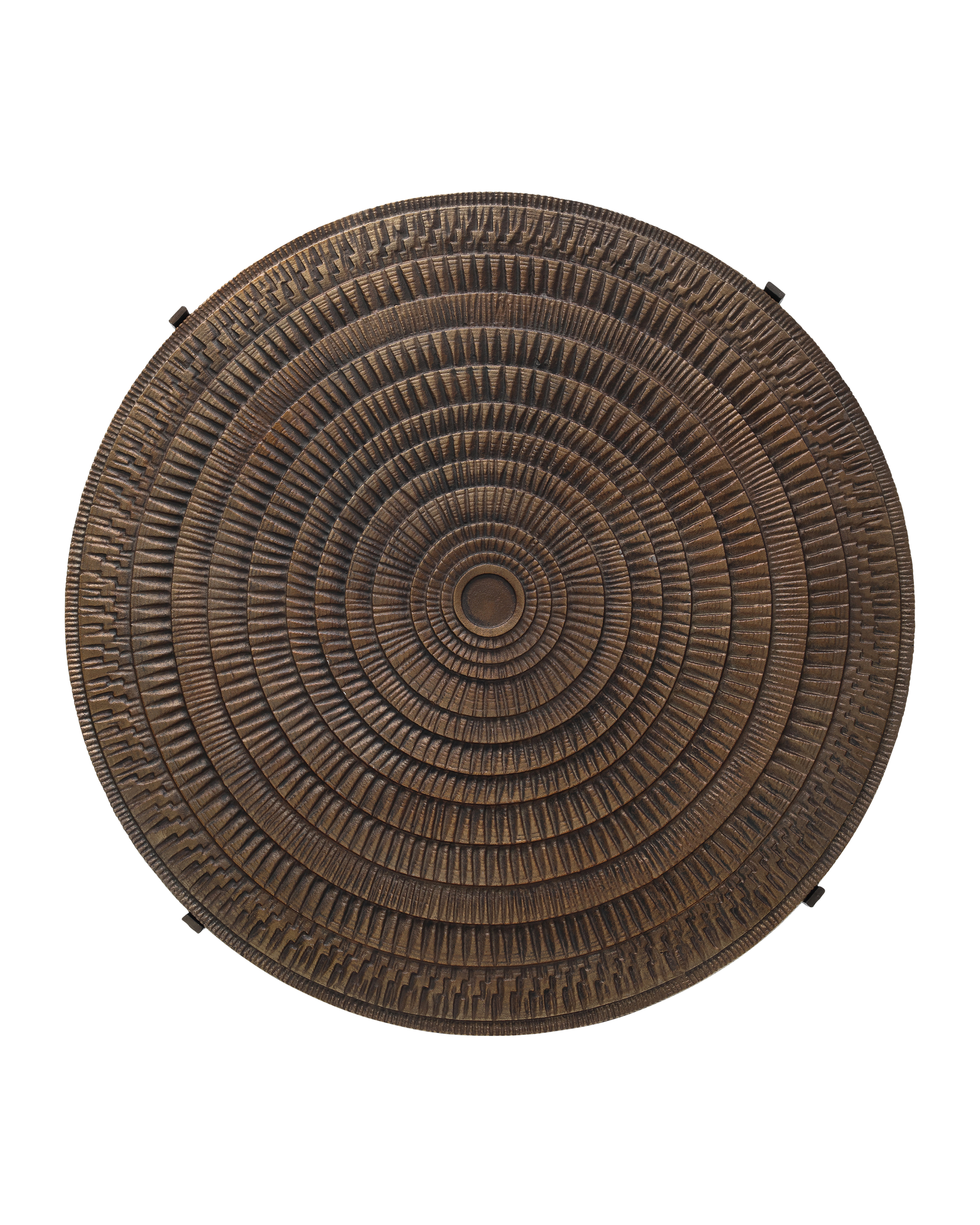 The Currey & Company Unity Cocktail Table is a bronze table with a top swirling with a toothy concentric pattern covered in an antique brass finish.