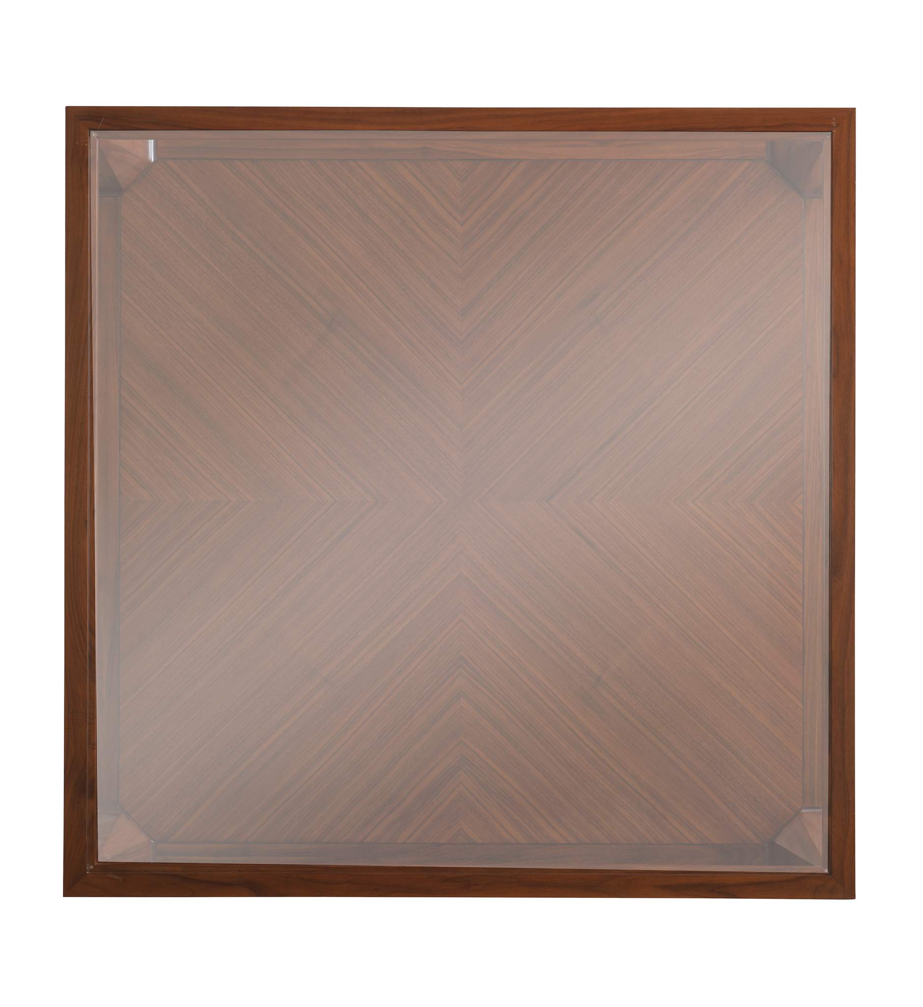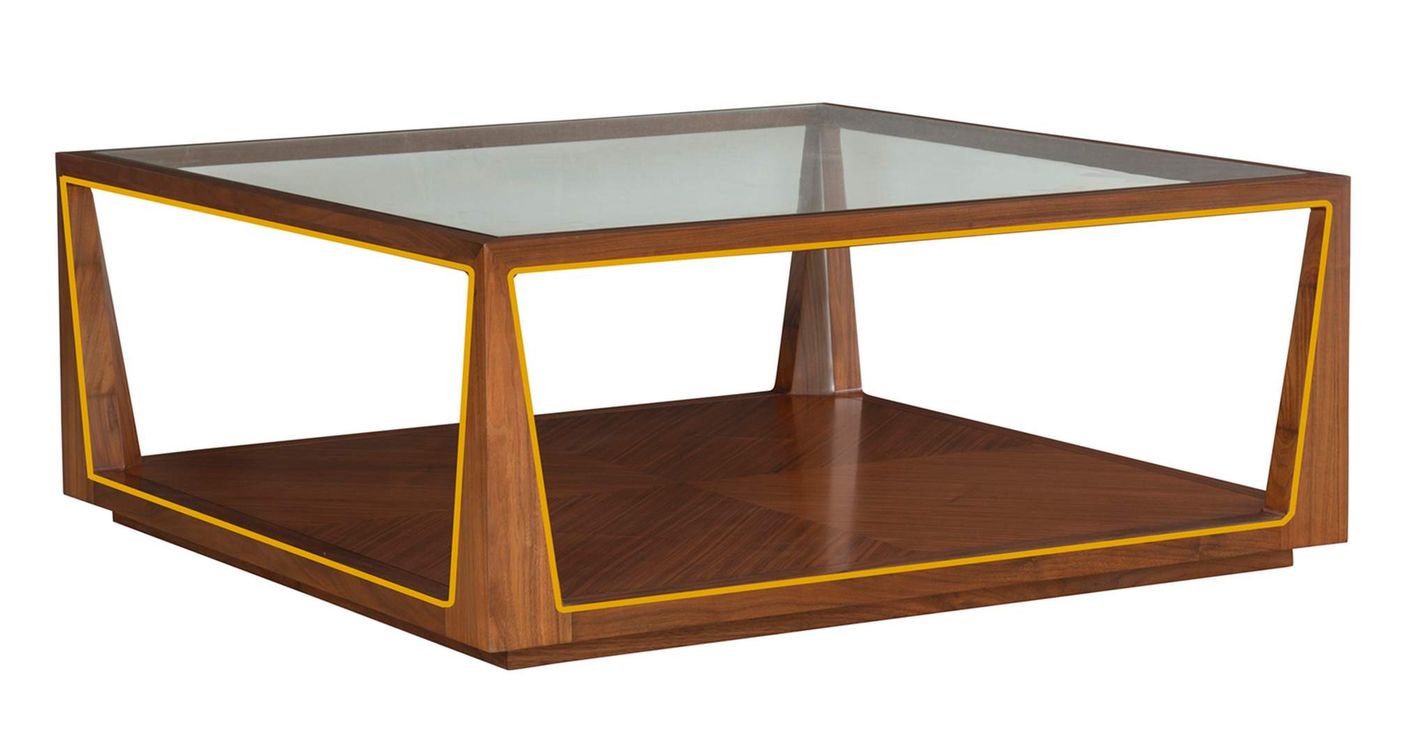 A modern interpretation of a classic French Moderne table, the Wilde cocktail table is architectural with its sleek lines that are accentuated by triangular pillars. A clear glass top reveals the beautiful four-way book matched walnut shelf. Stocked in Wilde Light Walnut as HC9084-10. Available in optional finishes as HC9084-70.