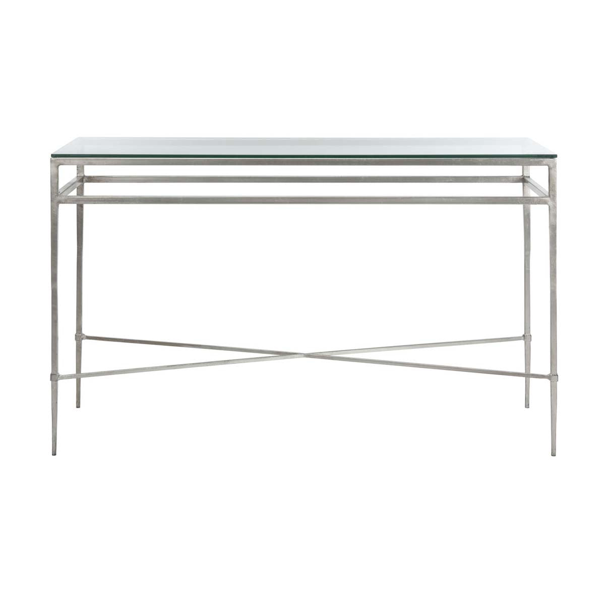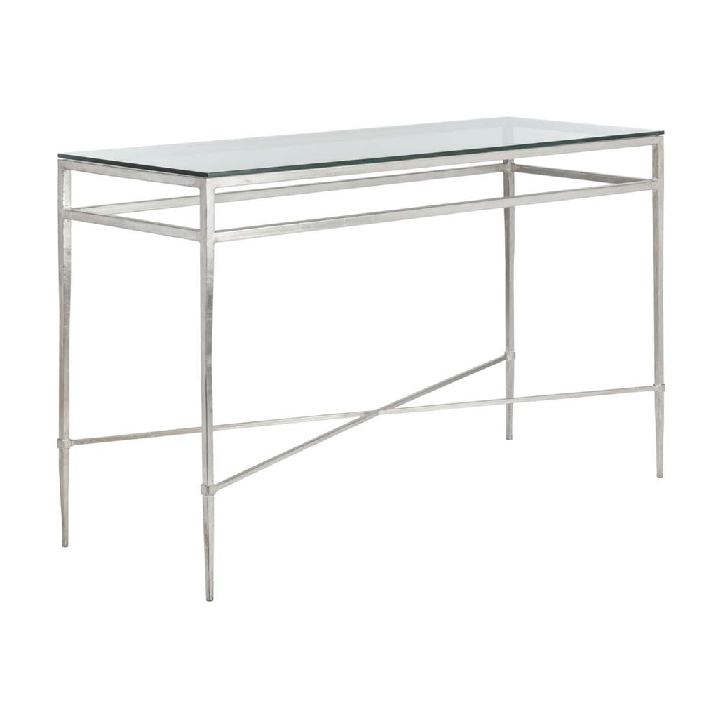 Straightforward and stylish, the Baumgarten Console Table is a study in refinement. Beautiful in an entry hall, living room, or even as a sofa table, Baumgarten exudes understated elegance with its open metal frame finished in antique silver gilding and smooth glass top.