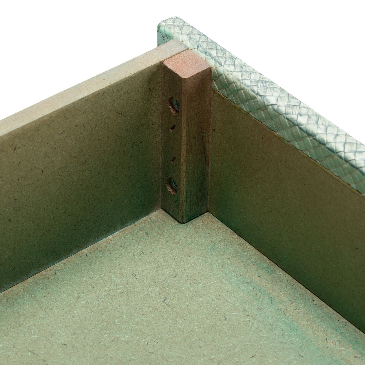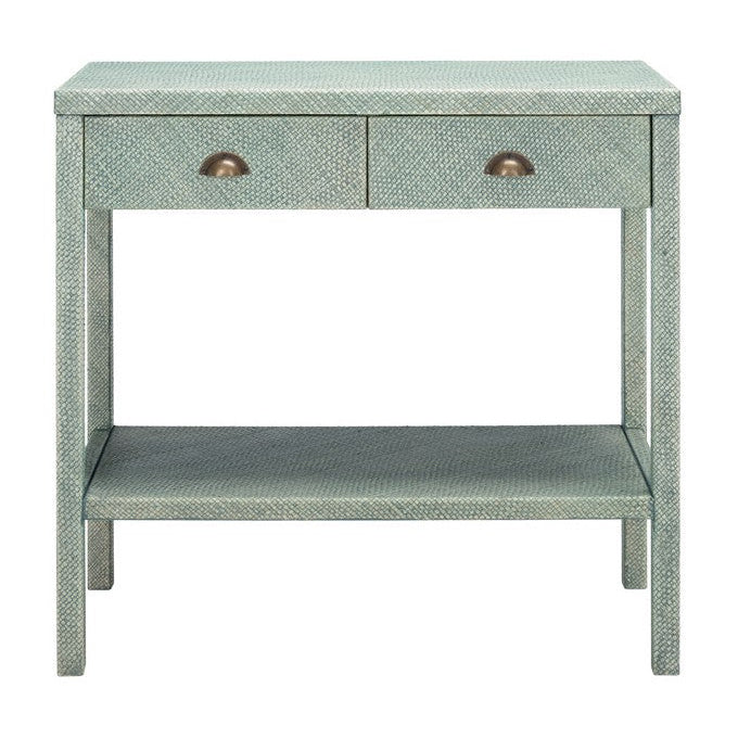 A striking statement piece designed to elevate the decorative drama of any living space, this Asa Console Table is a masterclass in fearless modern style. Asa?? turquoise green frame is distinct and dynamic with an overall crosshatch pattern, and the antique gold half-moon pulls on its two drawers will make you look twice.