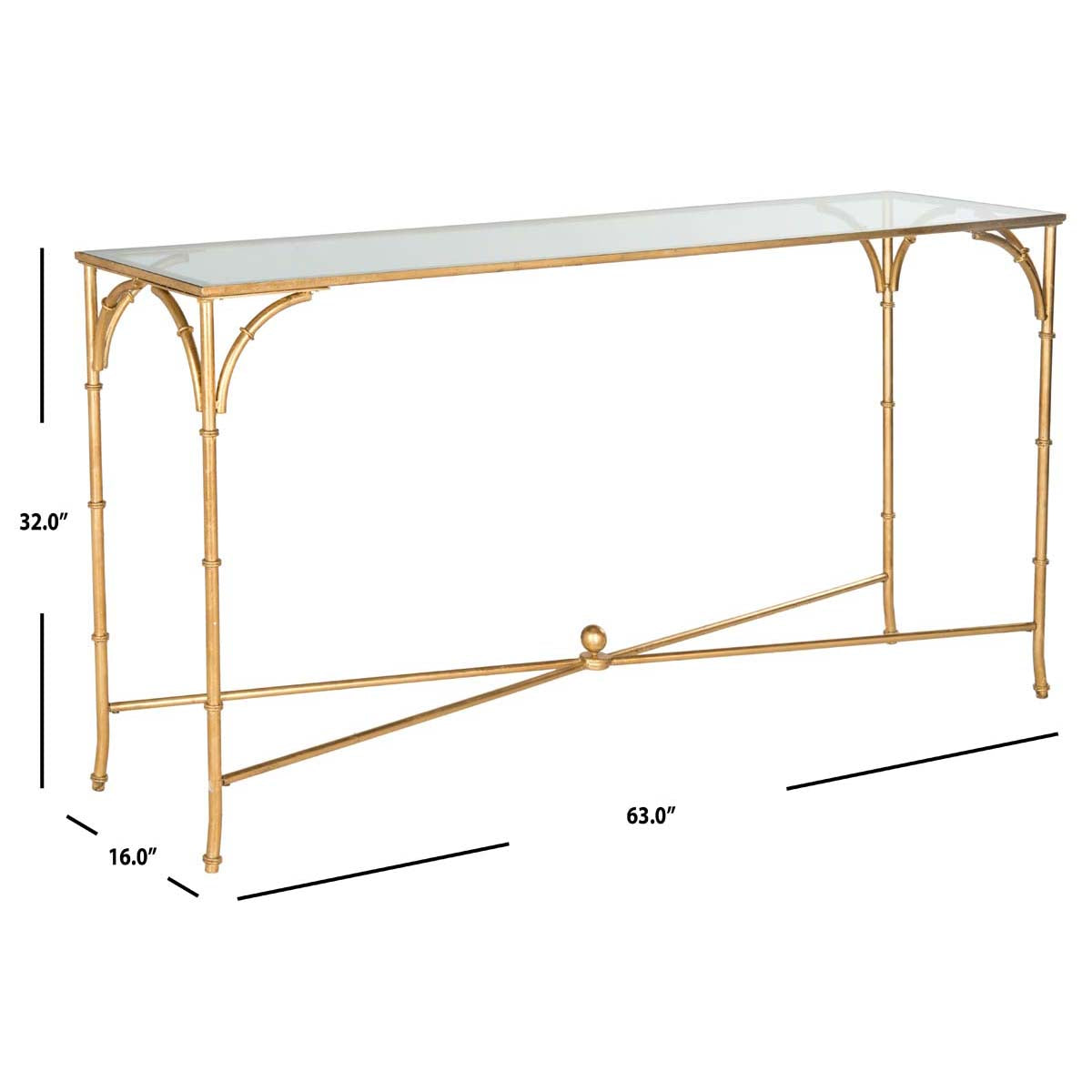 A classic beauty in any room, the Maurice Console exudes masterful ironwork artistry with a faux bamboo frame and cross base stretcher topped with a finial. Maurice is crafted of solid iron with gilt finish and tempered glass top.
