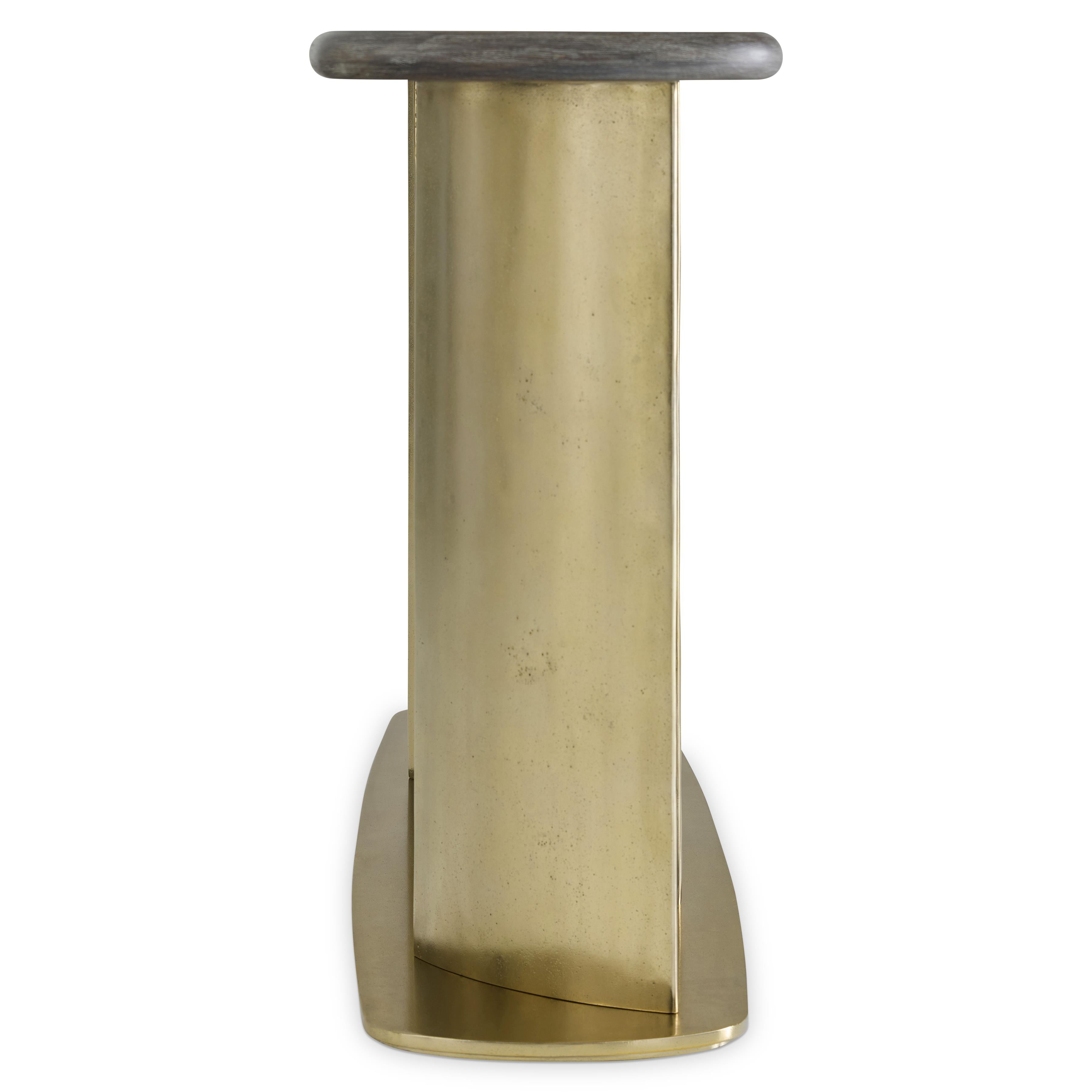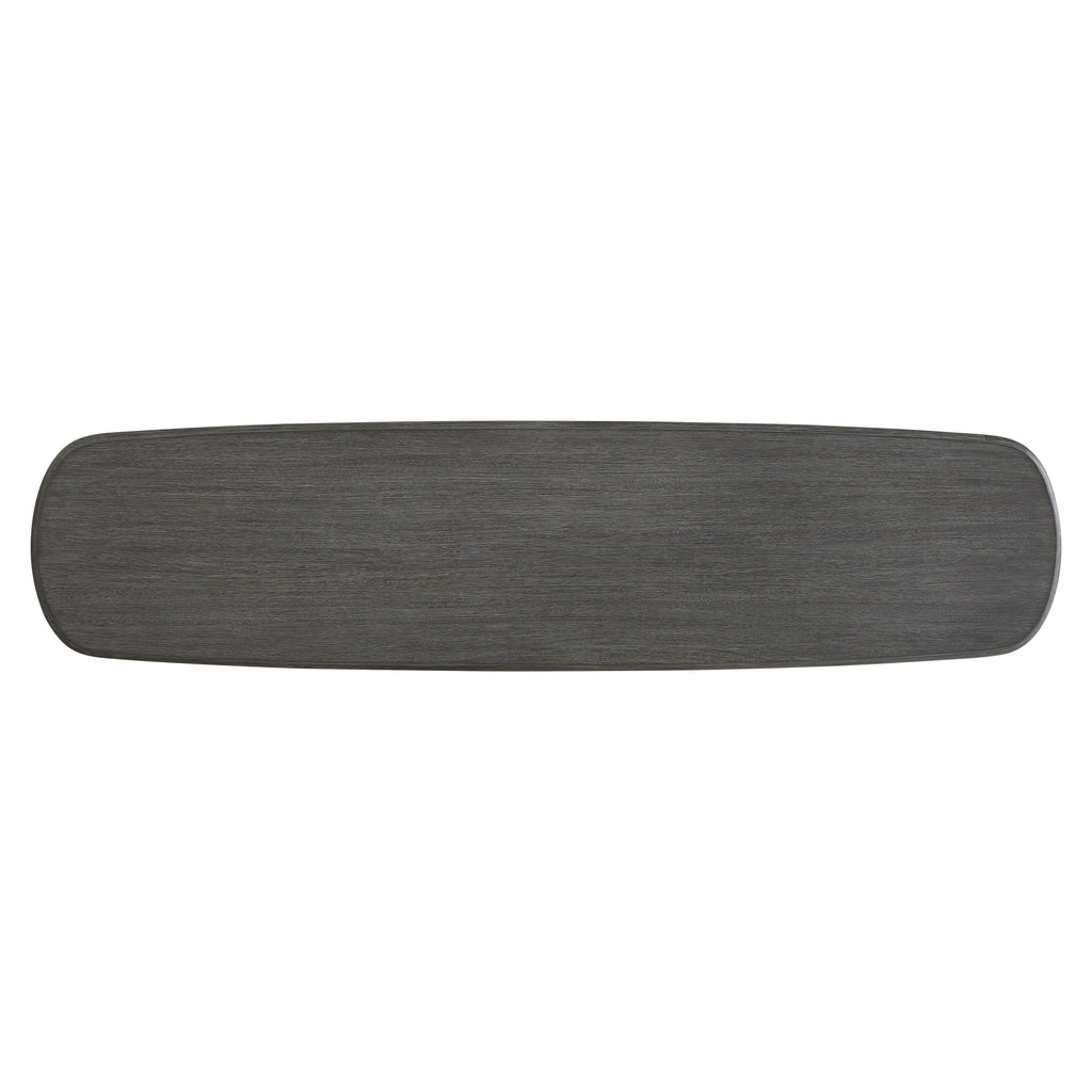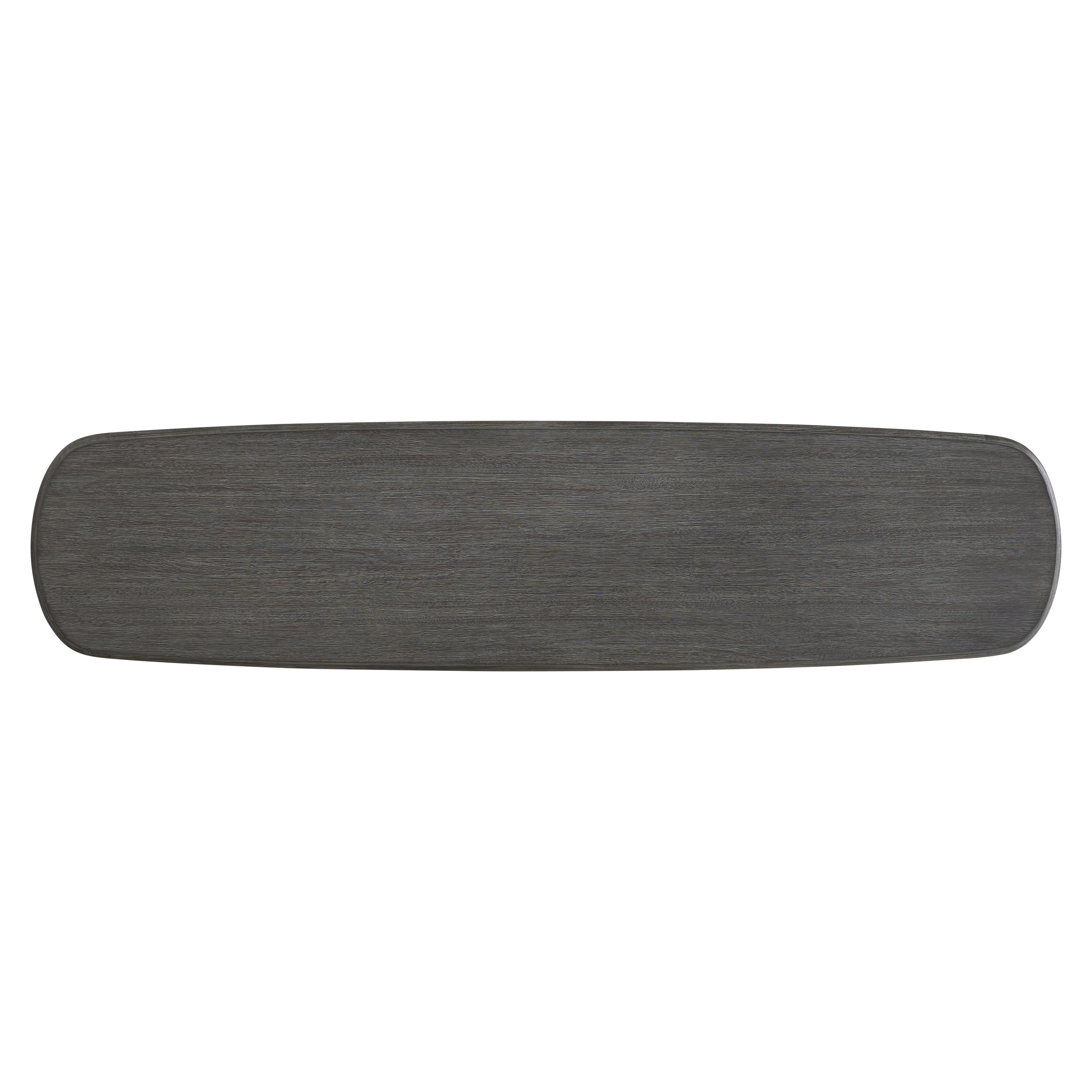 Mahogany top in Bracken finish supported by four cast aluminum pillars in Dorado Gold finish, The four curved pillars are textured on one side and smooth on the other