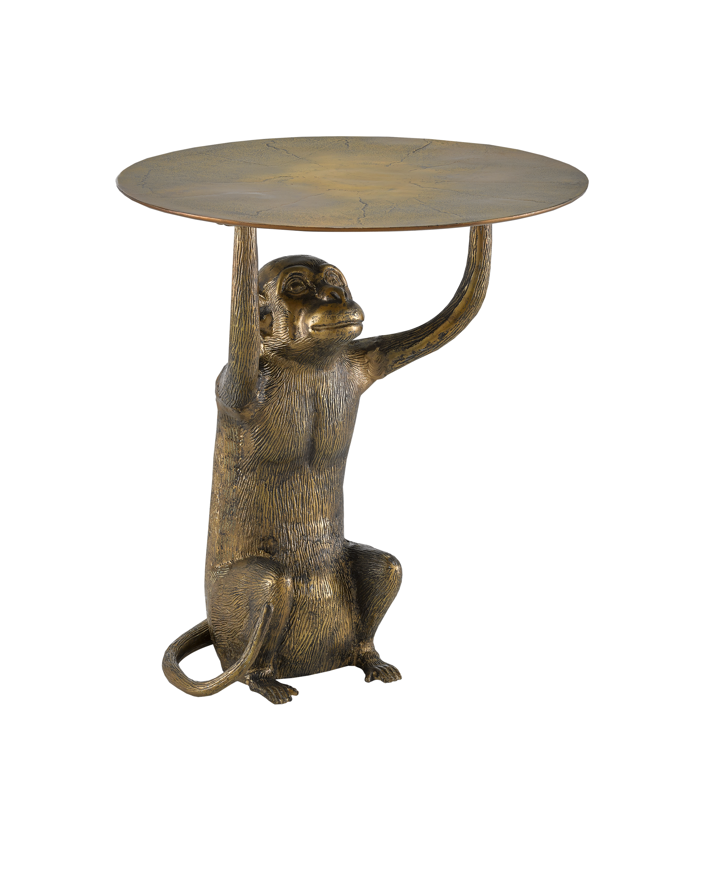 We don't monkey around when it comes to whimsical design. Case in point is our Abu Gold Accent Table with its seated ape, molded in cast aluminum, that lifts its table top with little effort. The antique gold finish that covers the piece makes the gold occasional table read as if it has aged. Creases molded into the top also support the effect that this is a vintage piece.