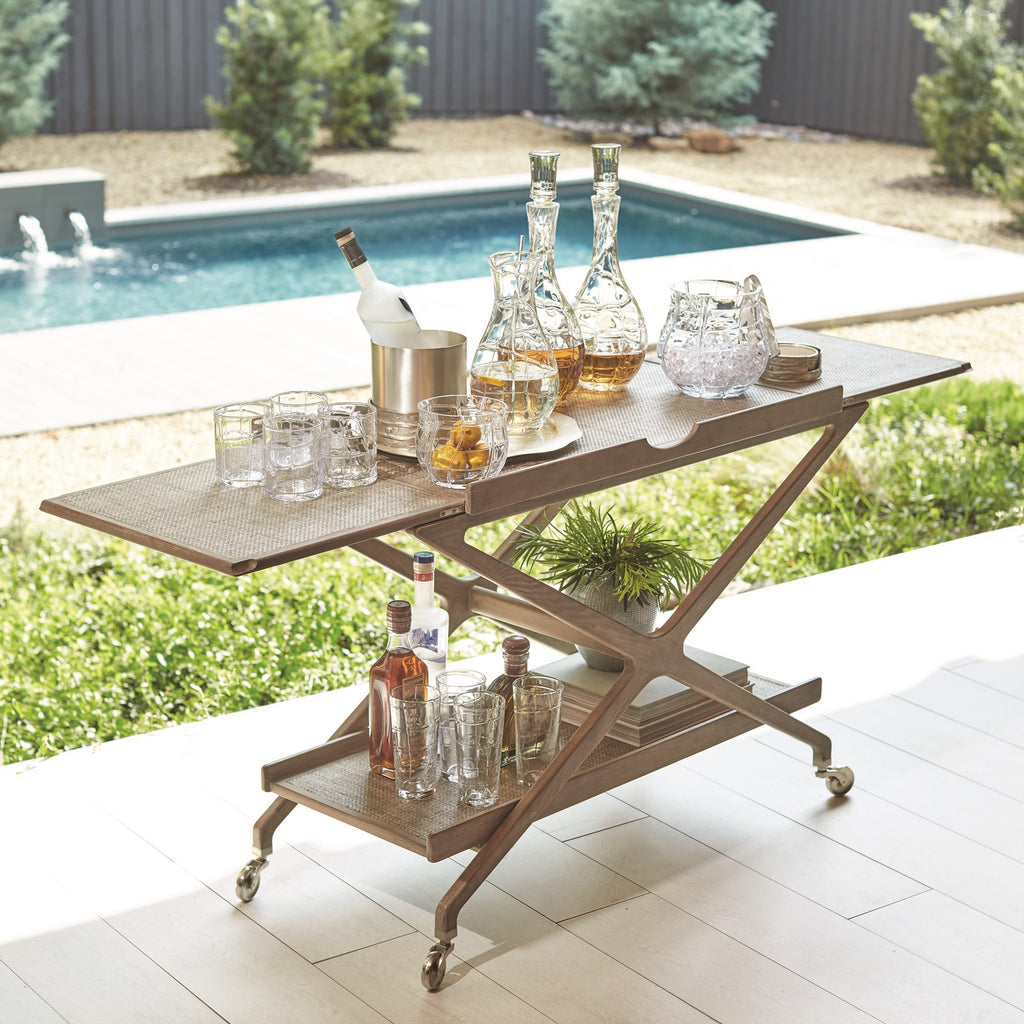A perfect accompaniment to entertaining anywhere. The grey cerused ash bar cart folds into an attractive compact package. Its 18" width allows it to nestle into a small space for convenient bar display and storage. When the top leaves are unfolded, the grass cloth lined interior is revealed and the serving space is doubled. Such a functional piece! Nickel-plated brass wheels and hardware. Grey cerused Ash veneer on Acacia.