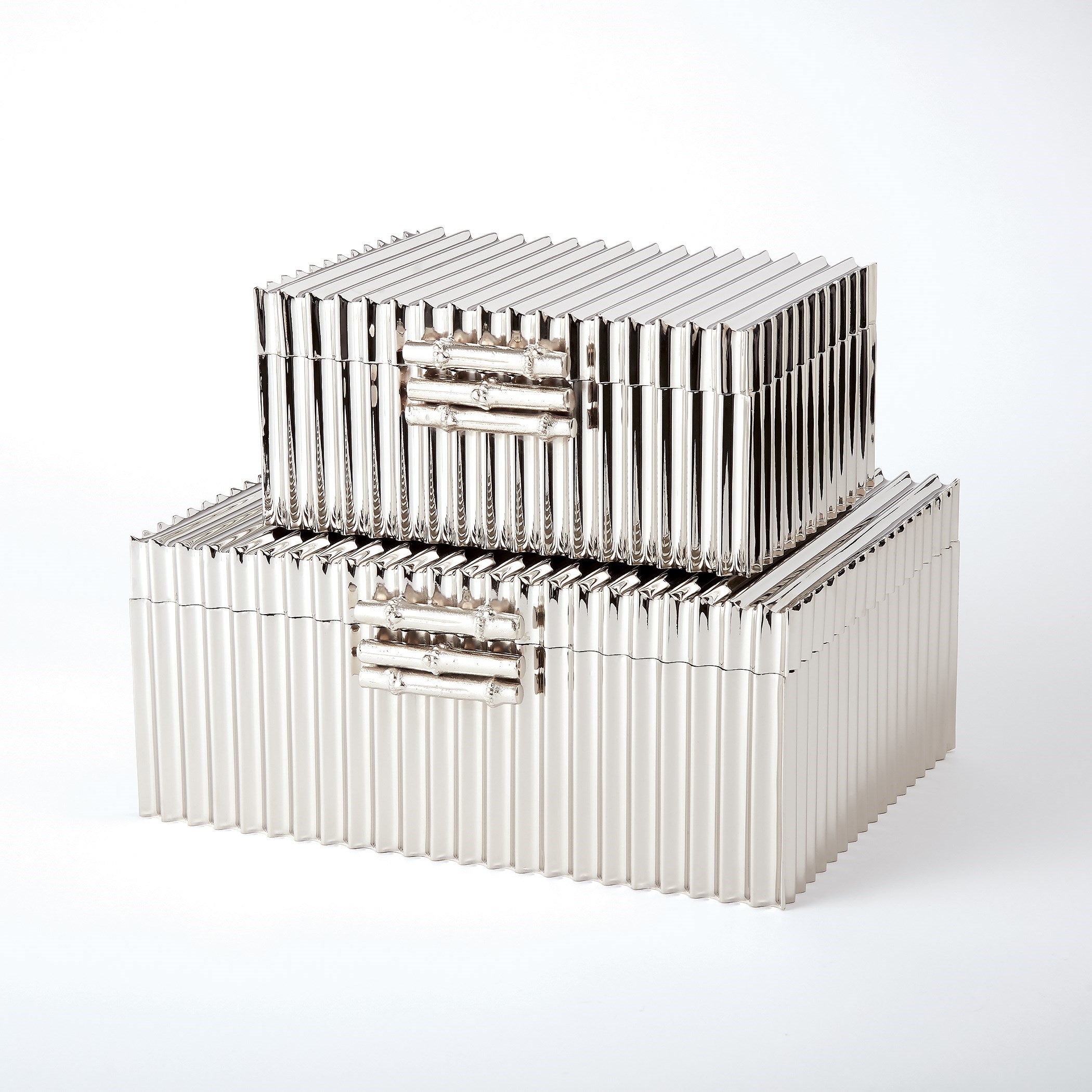 These handmade nickel plated solid brass boxes are accented with a bamboo detail. The lids are completely removable. The soldering process is extremely labor intensive to achieve the delicate and perfect flutes that surround this box.